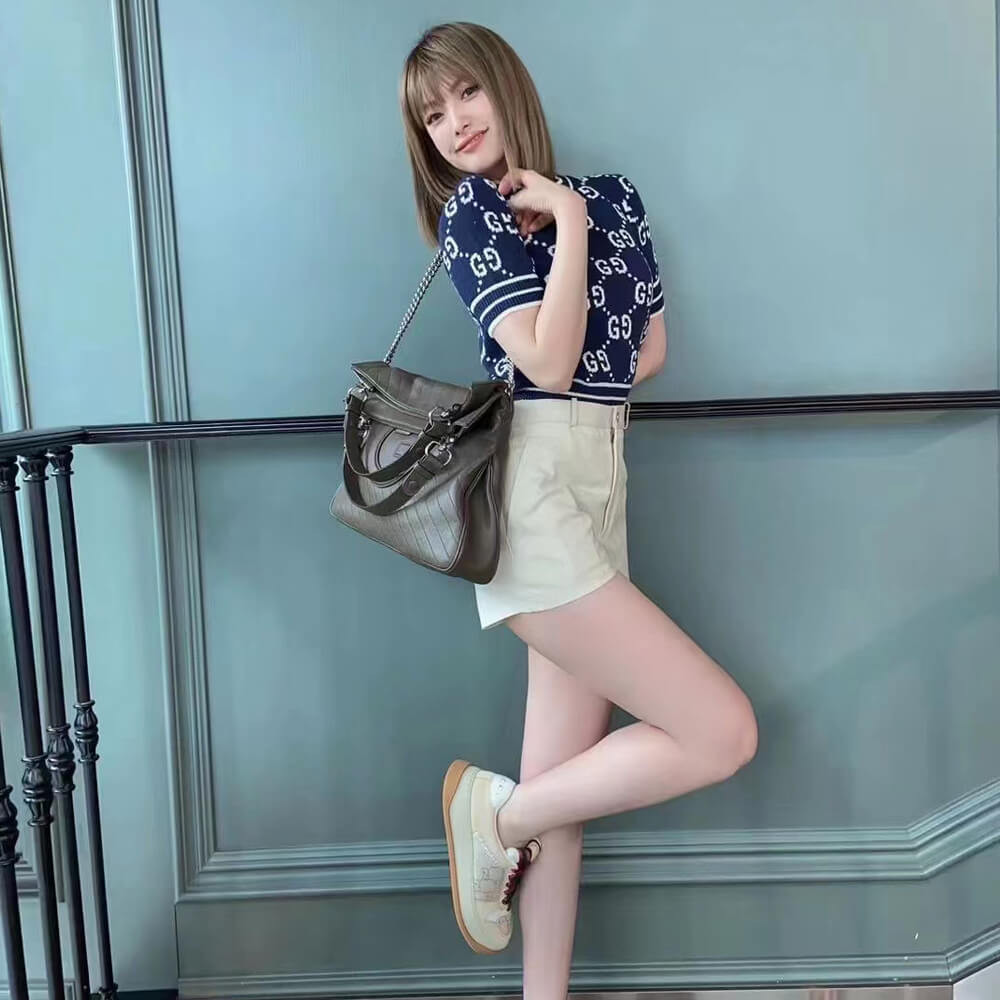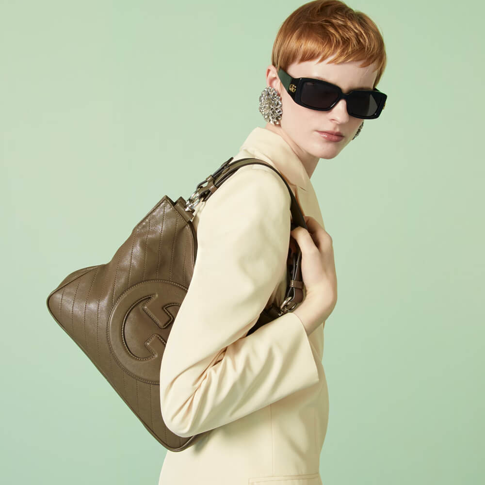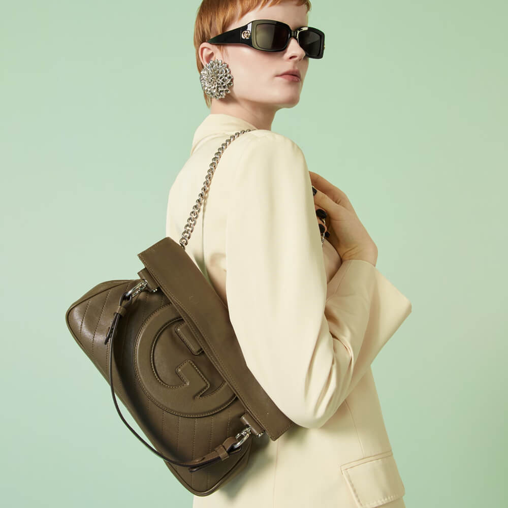 The Round Interlocking G that characterizes the Gucci Blondie line originates from the House archives. Signature pieces such as this Gucci Blondie tote bag with a top handle and chain shoulder strap reinterprets the emblem as a subtler leather patch detail.