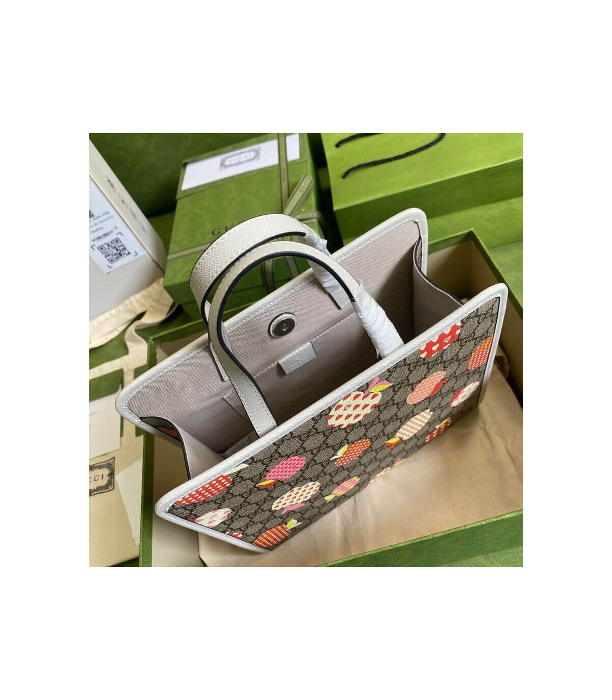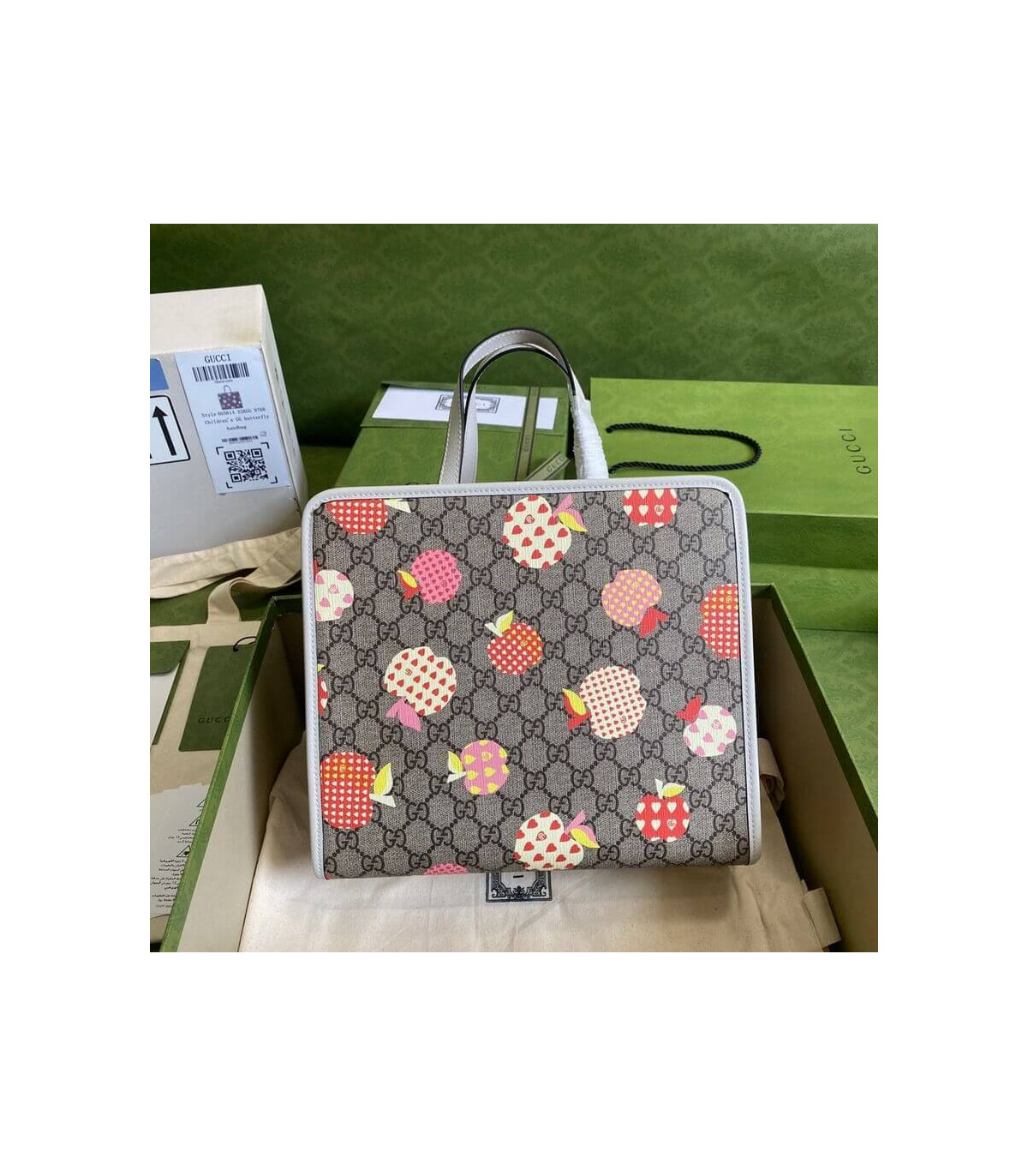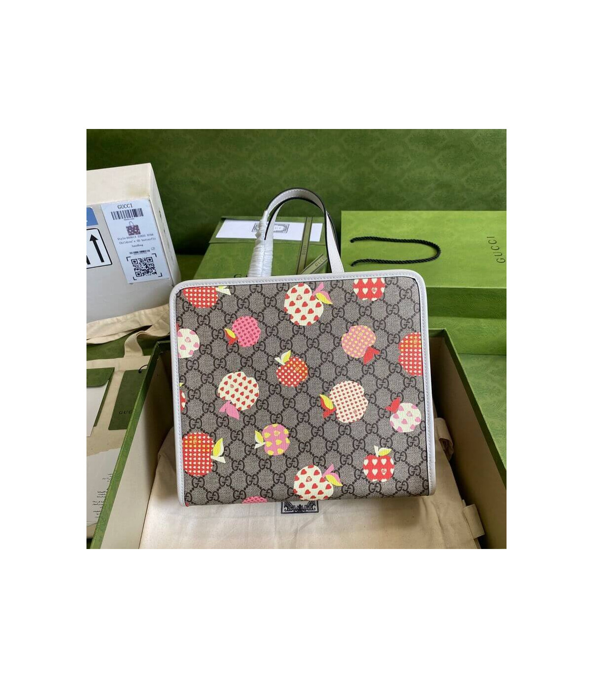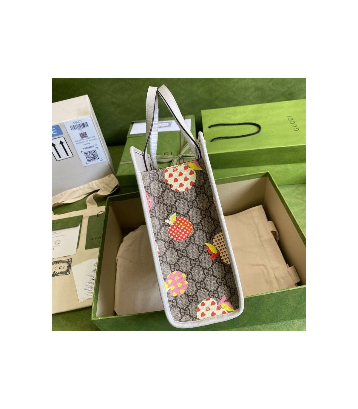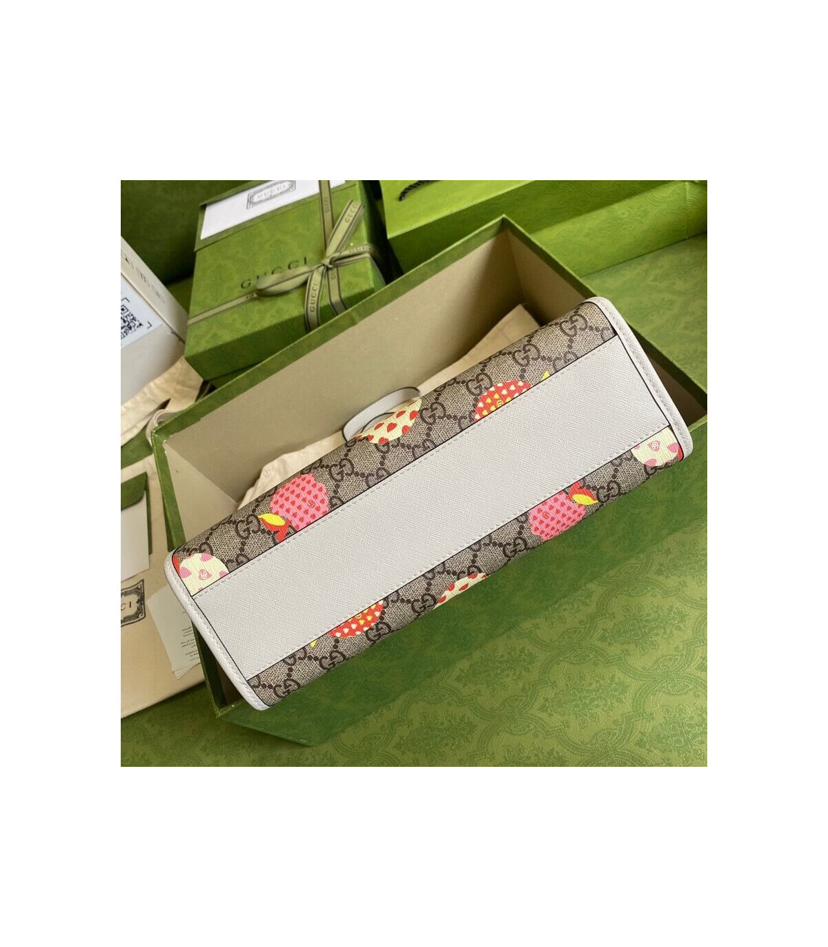 – Beige and ebony GG Supreme canvas with apple print, a material with low environmental impact