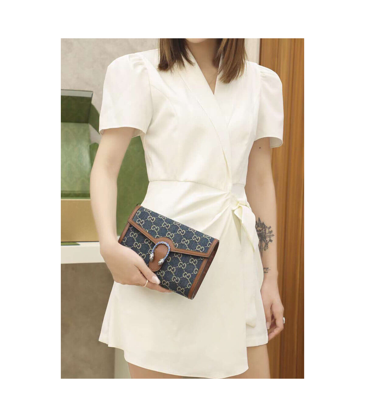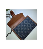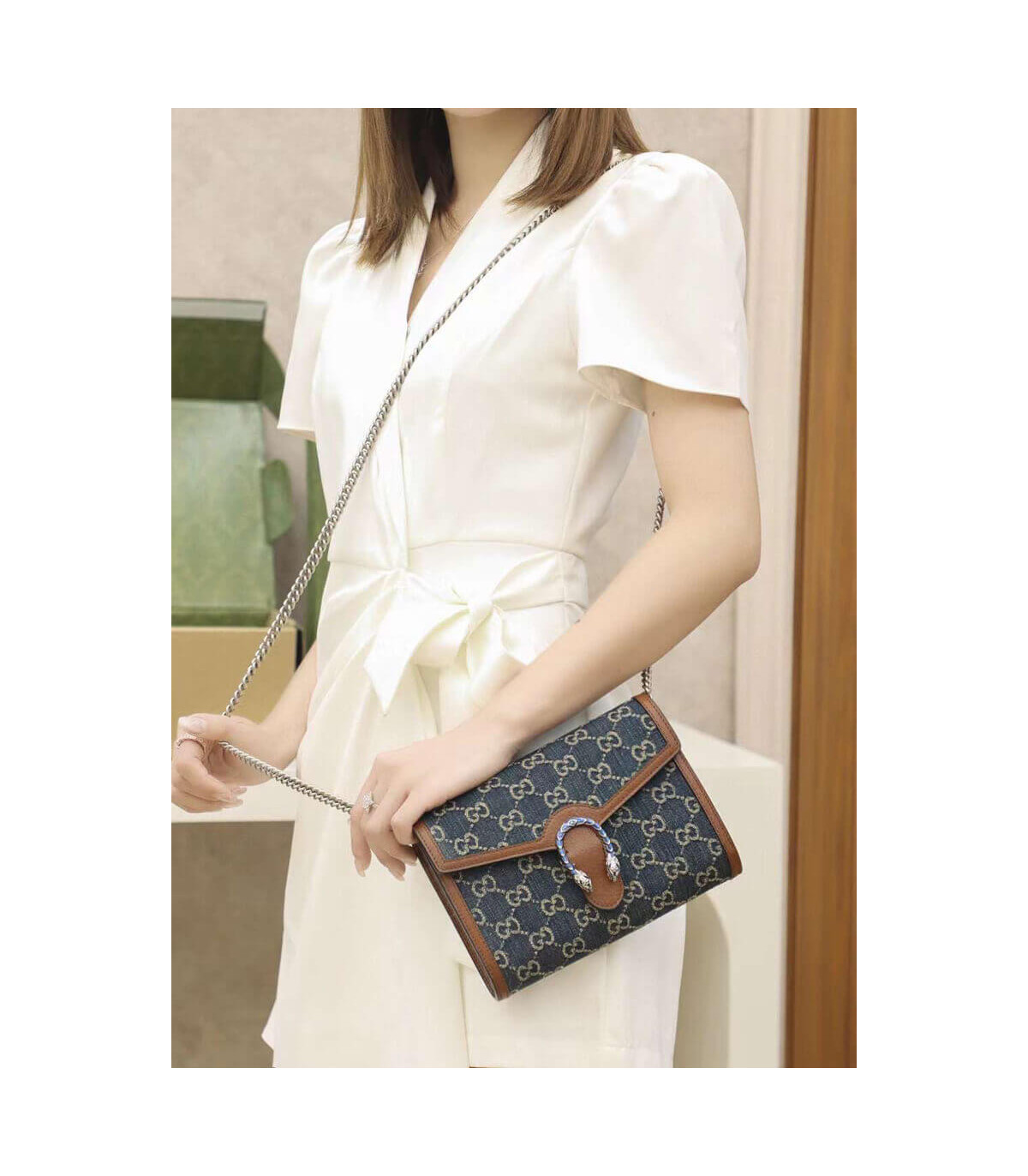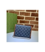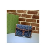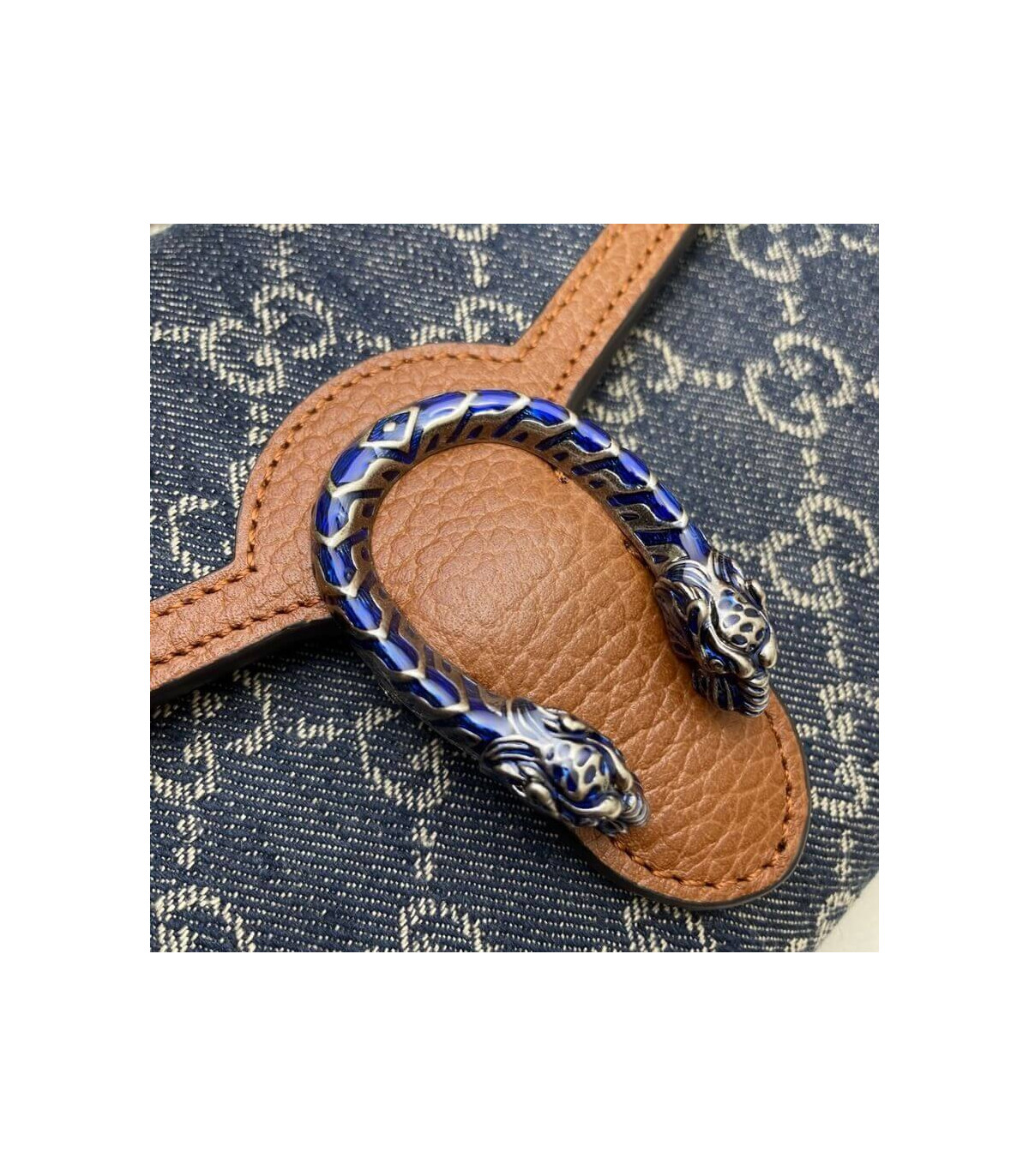 A standout piece from the Epilogue collection, this Dionysus mini chain bag is crafted from eco washed GG jacquard denim with brown leather trim. The signature tiger head spur closure is reimagined in striking blue enamel, contrasting beautifully against the deep indigo tones. Compact yet highly functional, it offers multiple compartments and card slots for everyday ease.