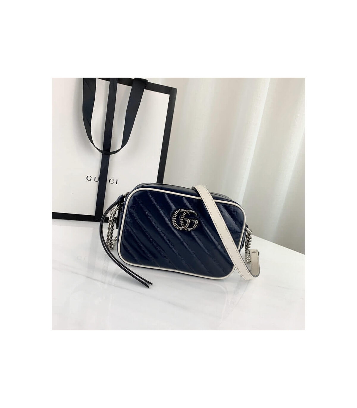 The mini GG Marmont chain shoulder bag has a softly structured shape and a zip top closure with Double G hardware. The chain shoulder strap has a leather shoulder detail. Made in matelassé leather with a chevron design and GG on the back.