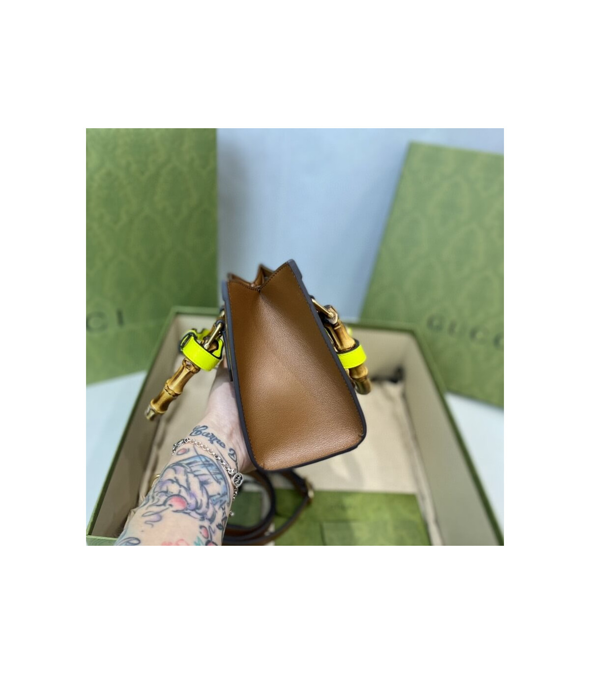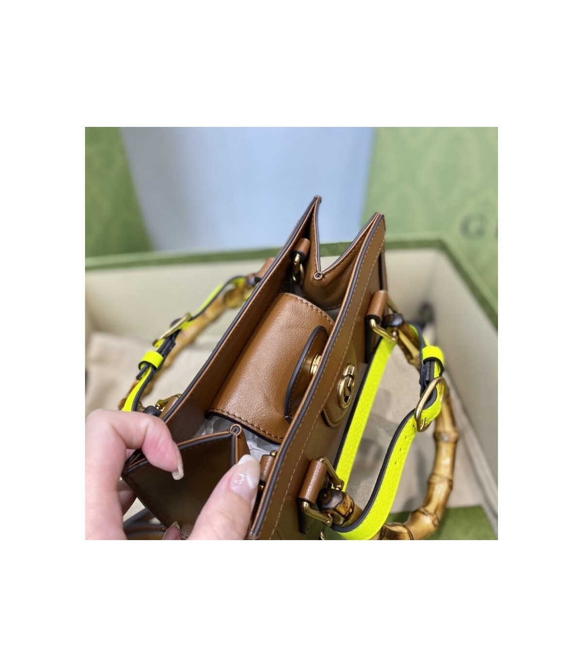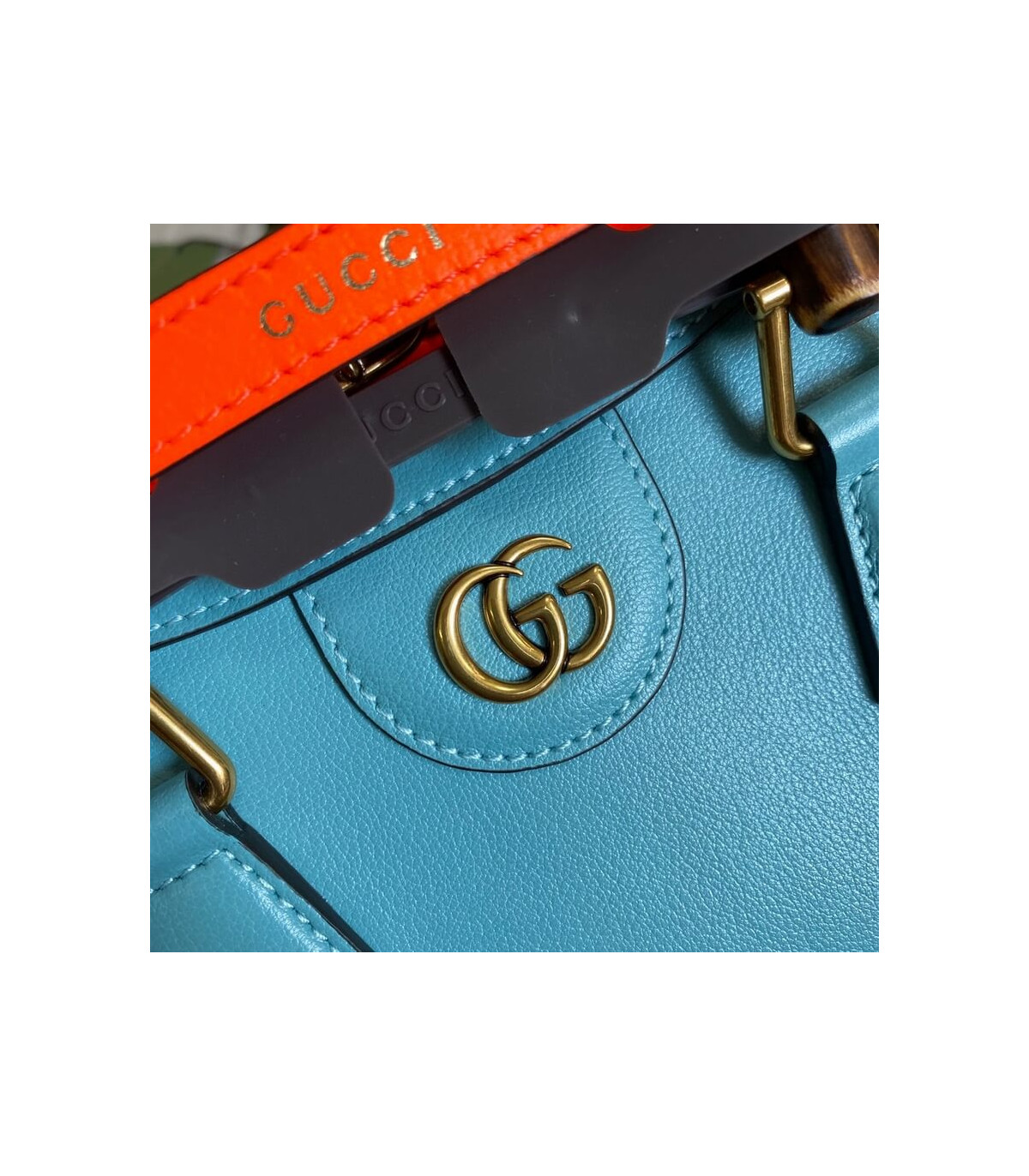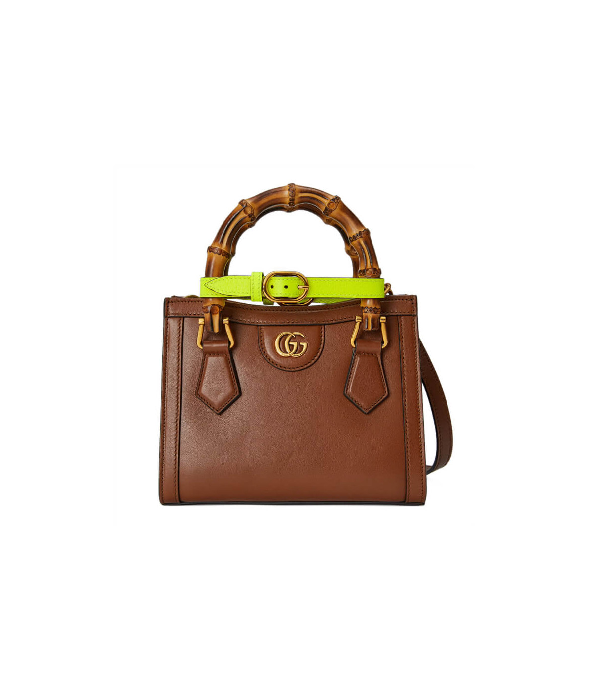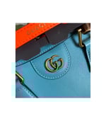 Combining recognizable elements of the House, the mini tote bag is defined by its bamboo handles and Double G hardware. Crafted from light blue leather, the accessory is further accentuated by two neon bands, a playful reference to the bands used to keep handles in shape.