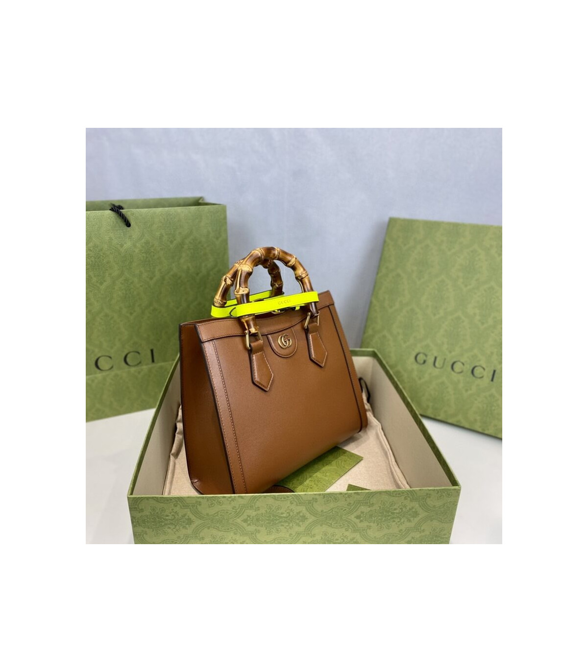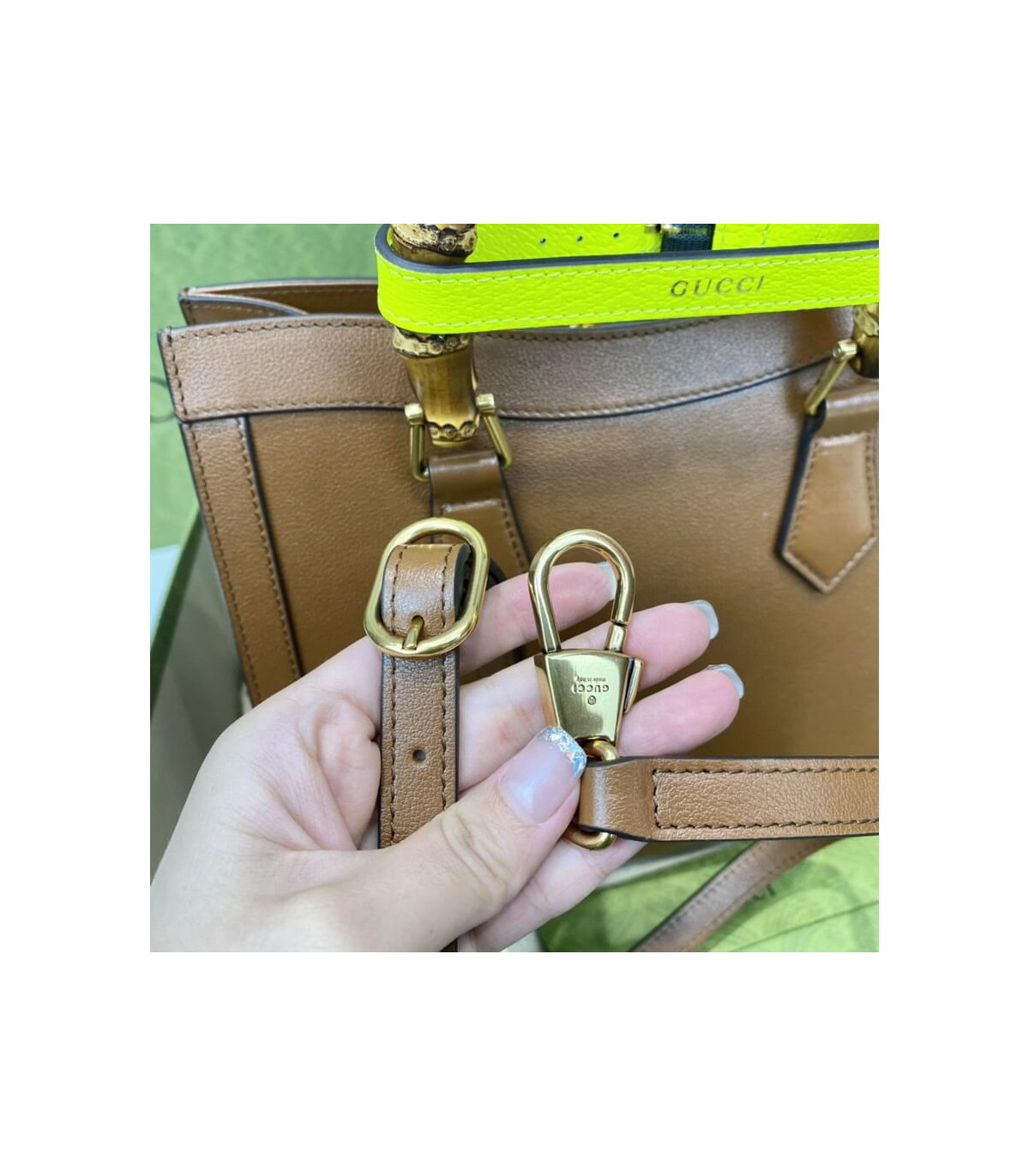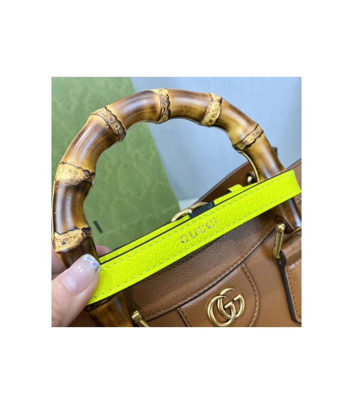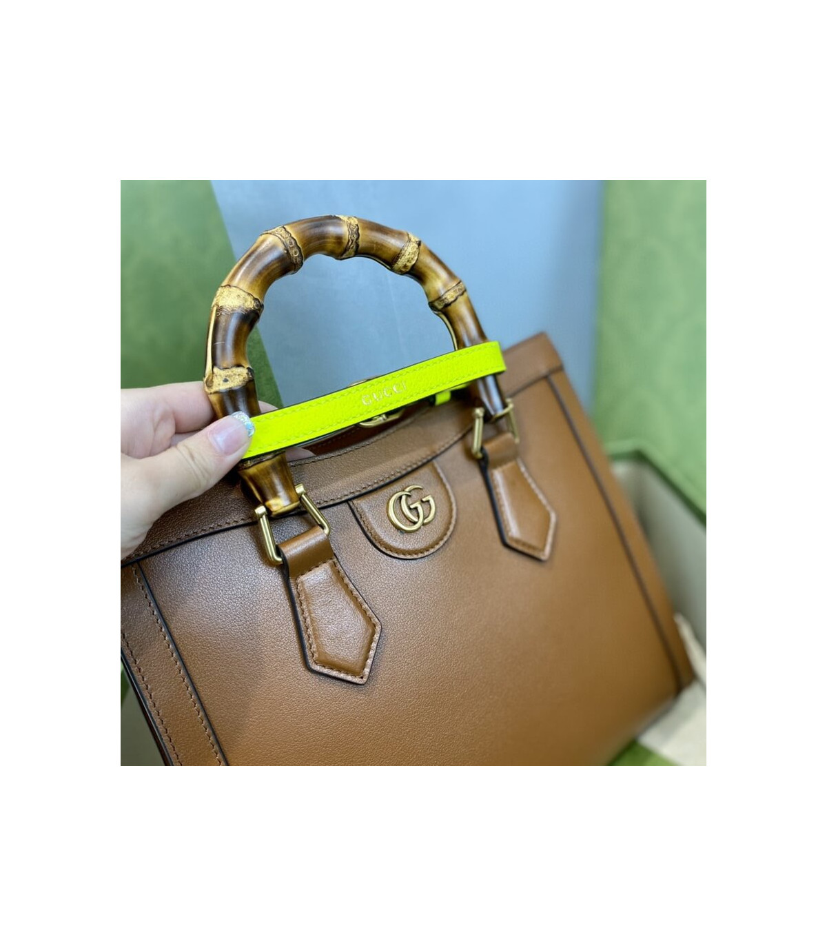 Combining recognizable elements of the House, the small tote bag is defined by its bamboo handles and Double G hardware. Crafted from black leather, the accessory is further accentuated by two neon bands, a playful reference to the bands used to keep handles in shape.