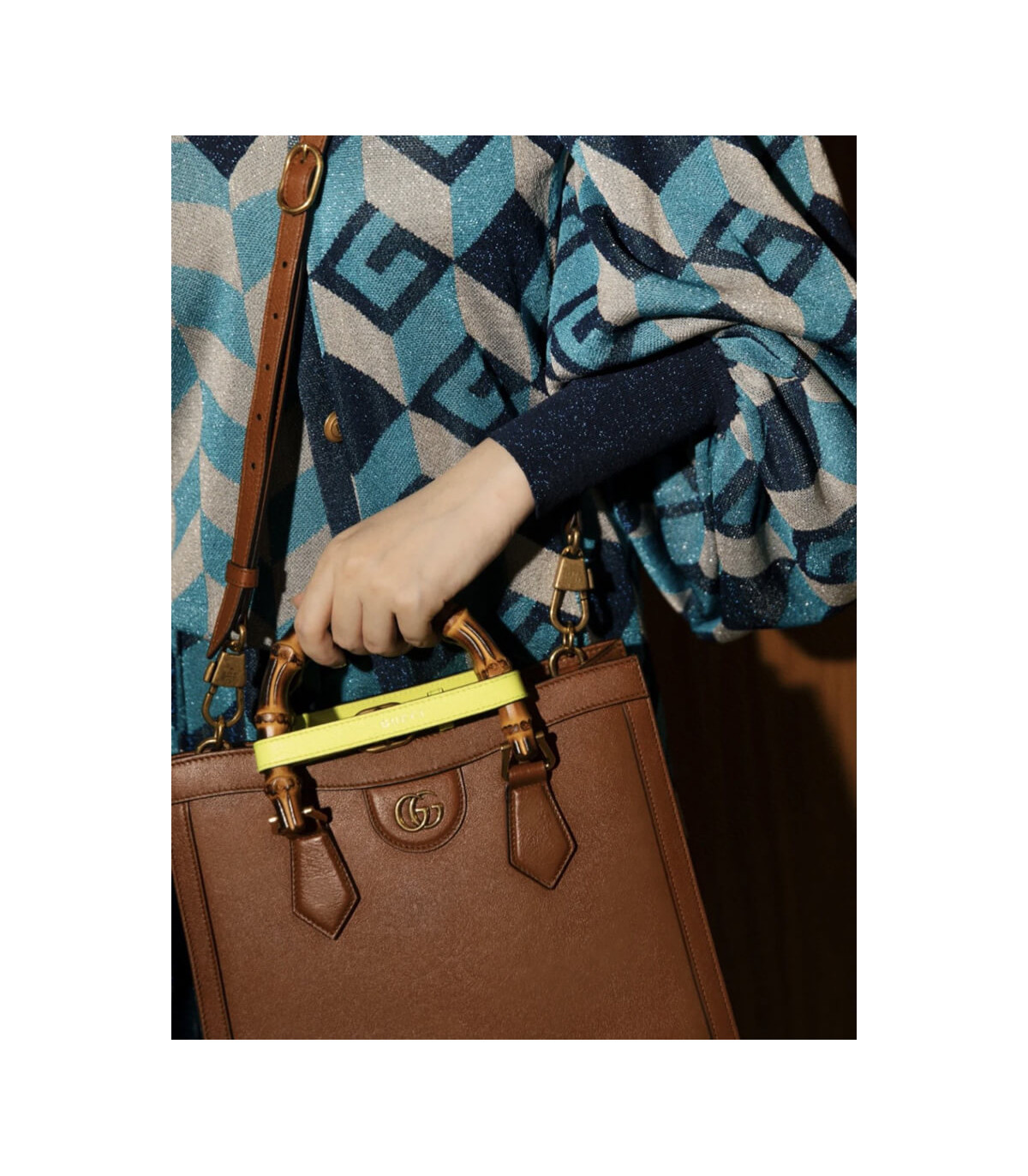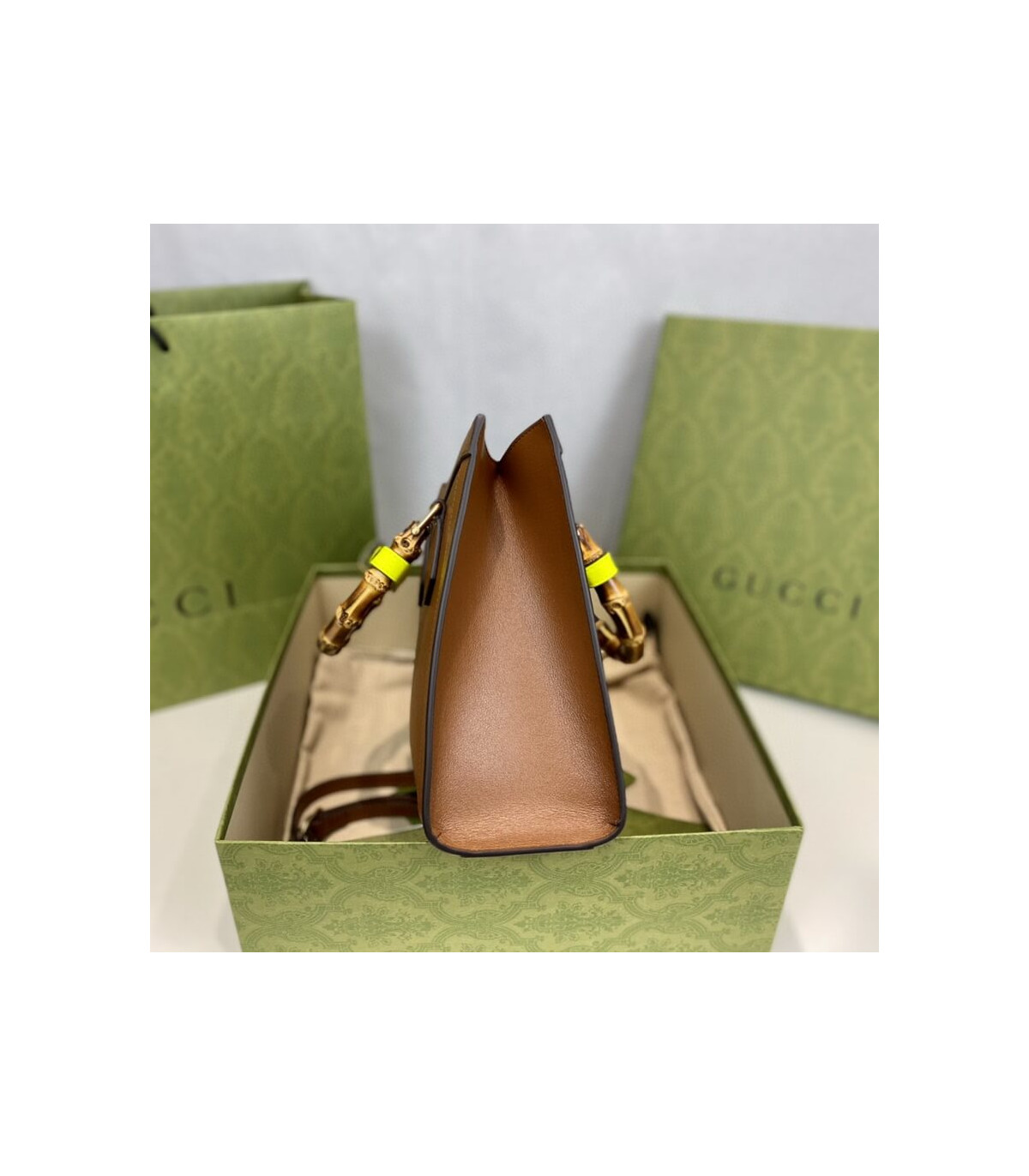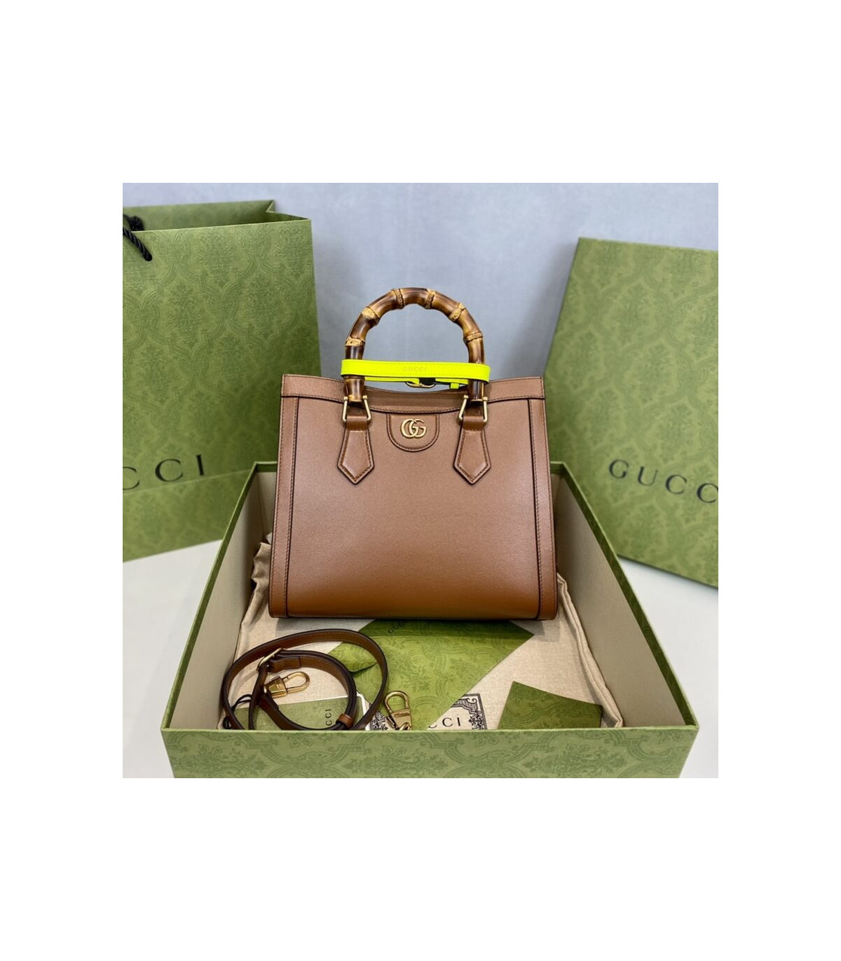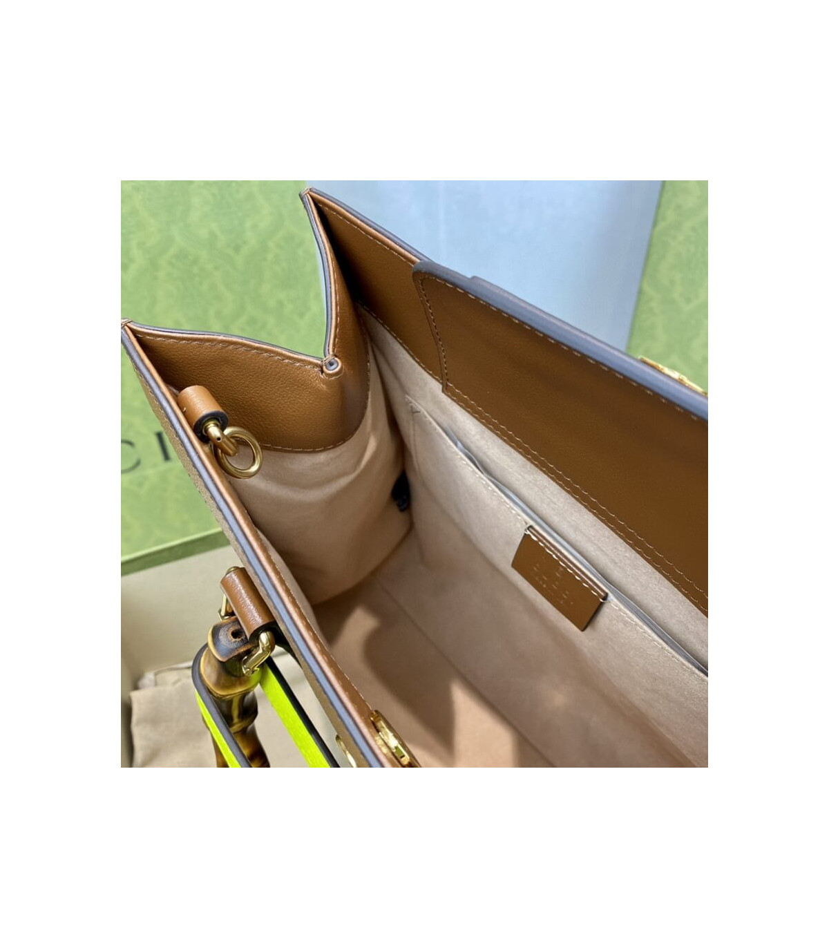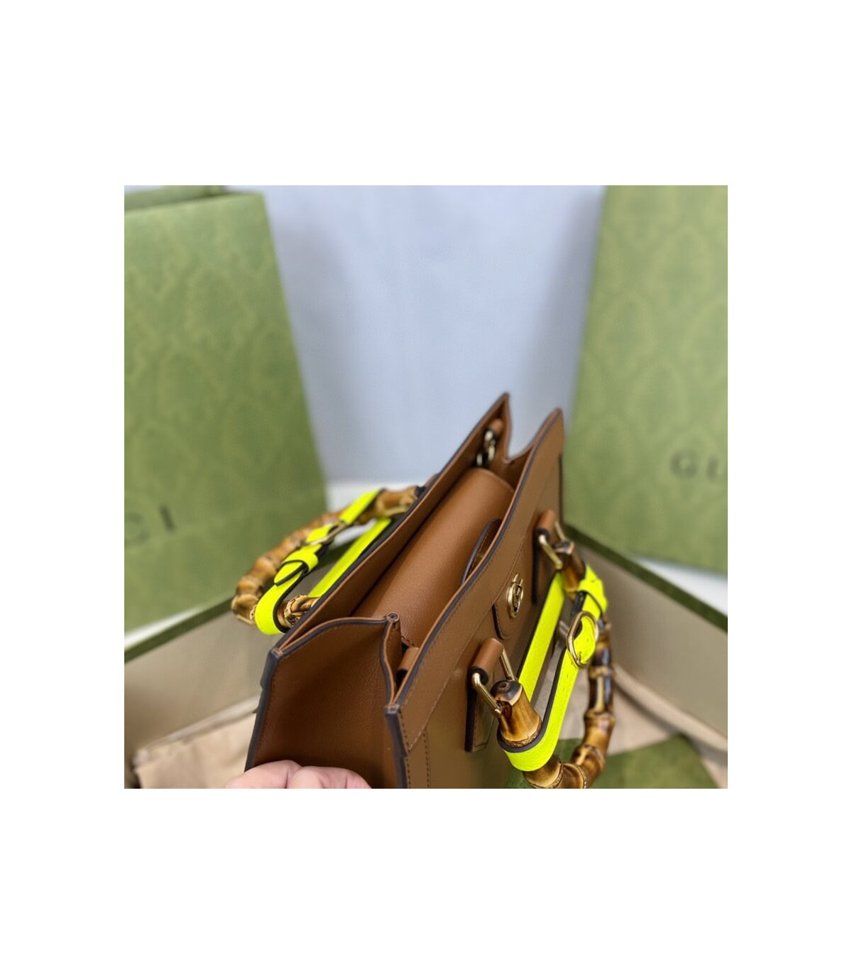 Combining recognizable elements of the House, the small tote bag is defined by its bamboo handles and Double G hardware. Crafted from black leather, the accessory is further accentuated by two neon bands, a playful reference to the bands used to keep handles in shape.