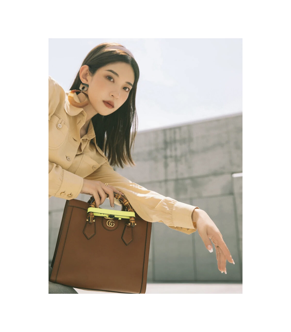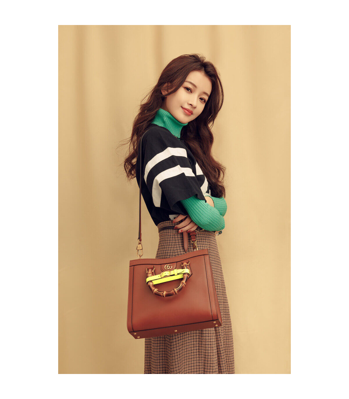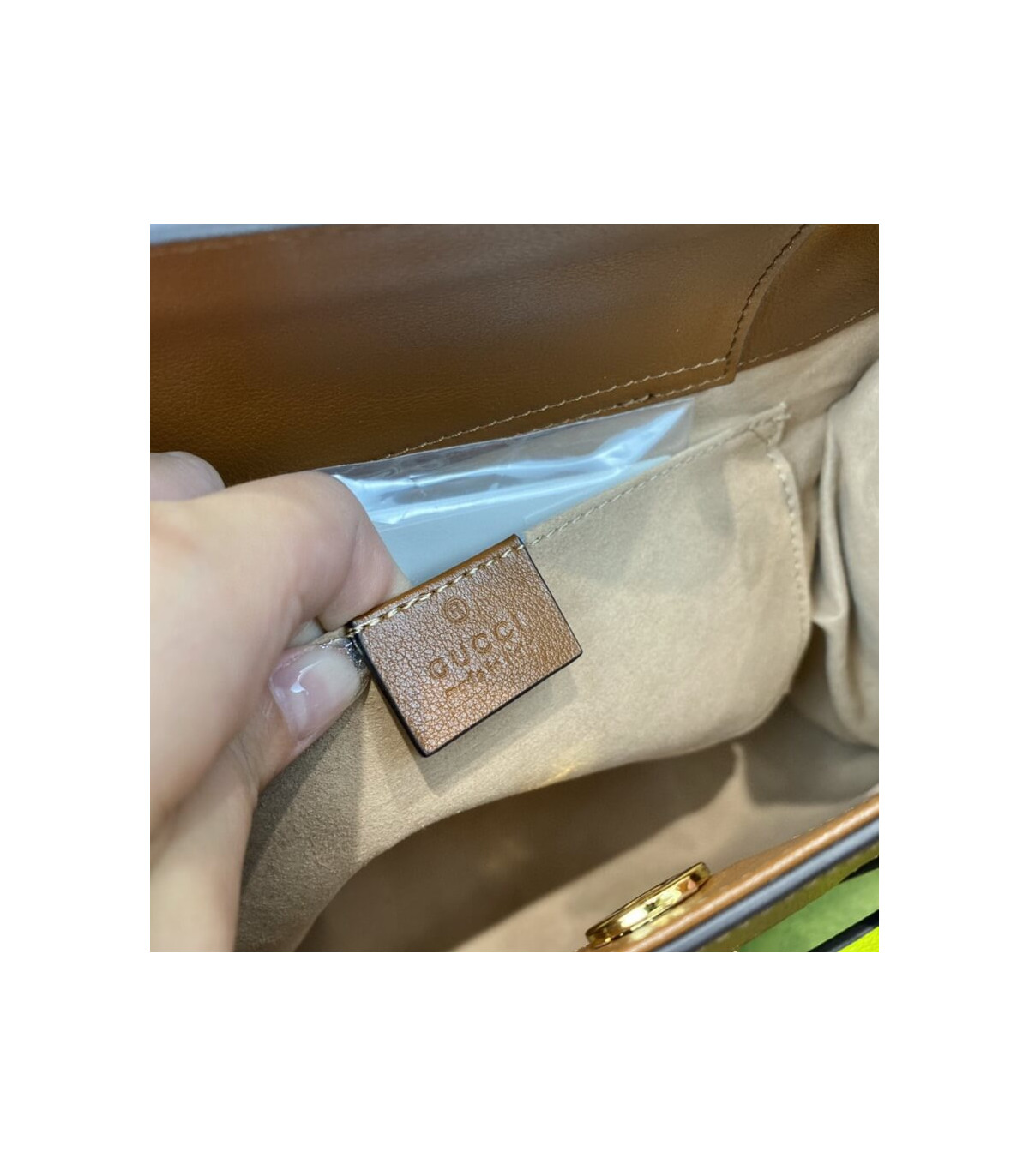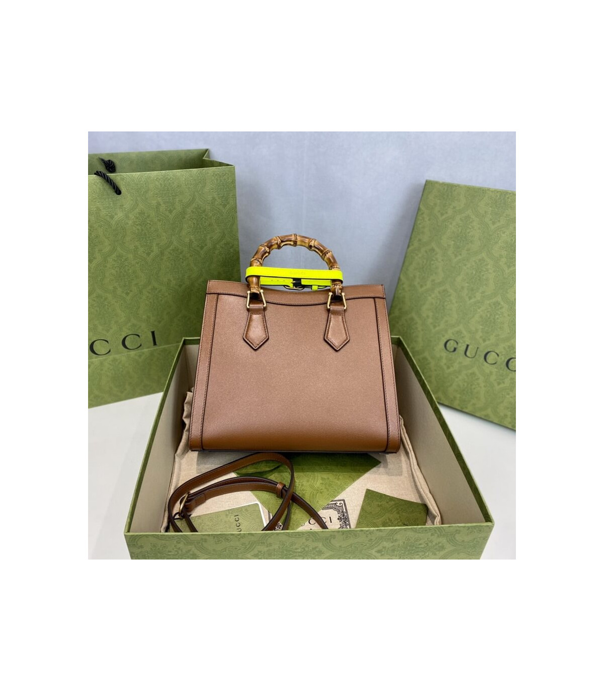 Combining recognizable elements of the House, the small tote bag is defined by its bamboo handles and Double G hardware. Crafted from black leather, the accessory is further accentuated by two neon bands, a playful reference to the bands used to keep handles in shape.