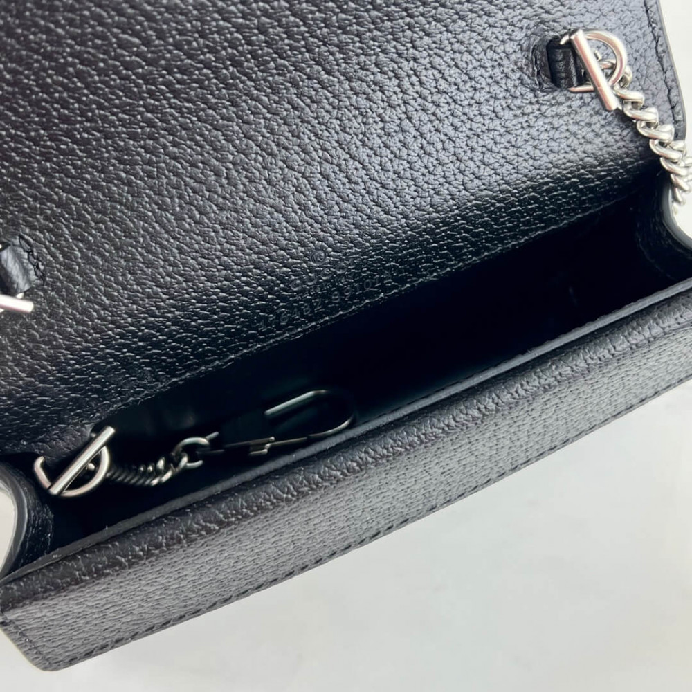 Reminiscent of an archival symbol, the textured tiger head spur is the Dionysus’ defining feature. The feline appears throughout the universe, expressing the House’s fascination with the wild beauty of the natural world. Here, the antique silver-toned hardware is paired with a black and ivory GG denim jacquard.
