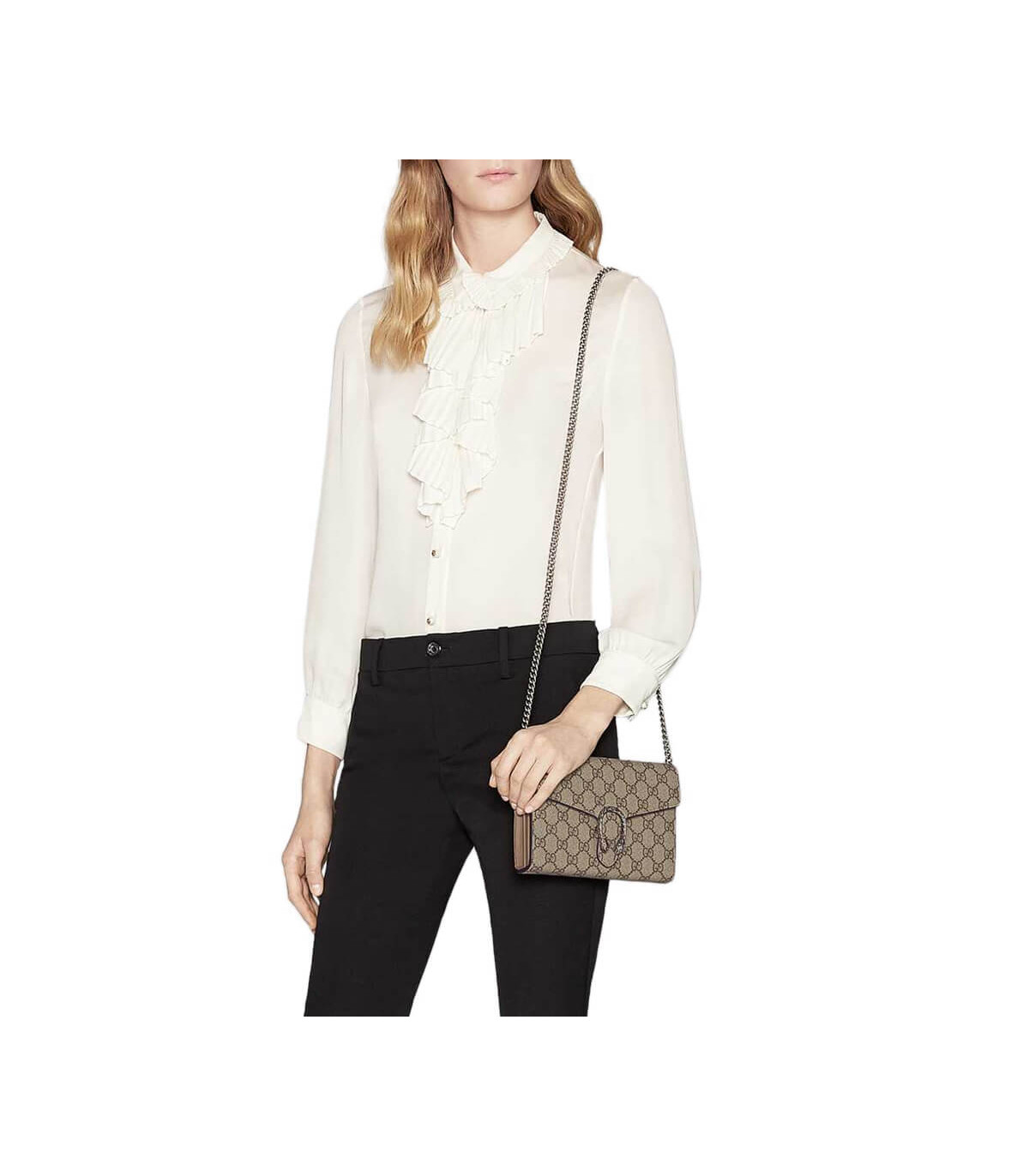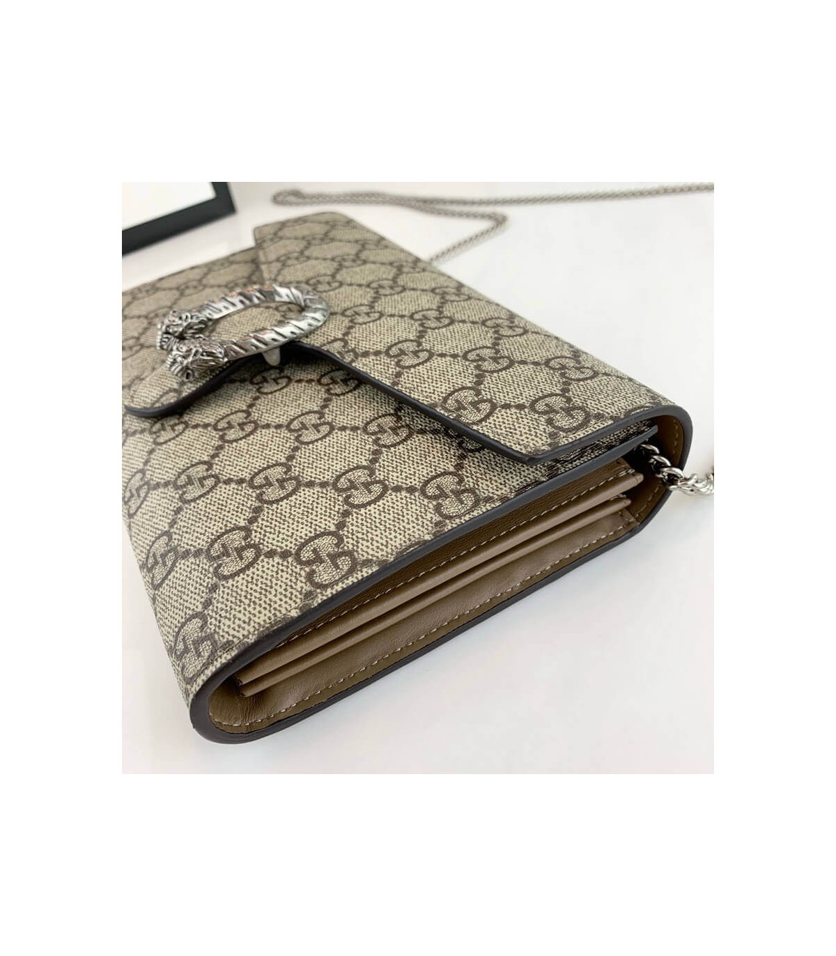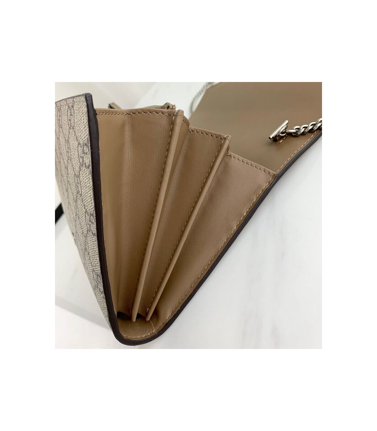 A structured and compact design, this wallet on chain is crafted from beige/ebony GG Supreme canvas with antiqued silver-toned hardware. The signature tiger head spur closure adds iconic flair, while the interior offers ample organization with 16 card slots and multiple compartments. Finished with a taupe leather lining and a detachable chain strap for versatile wear.
