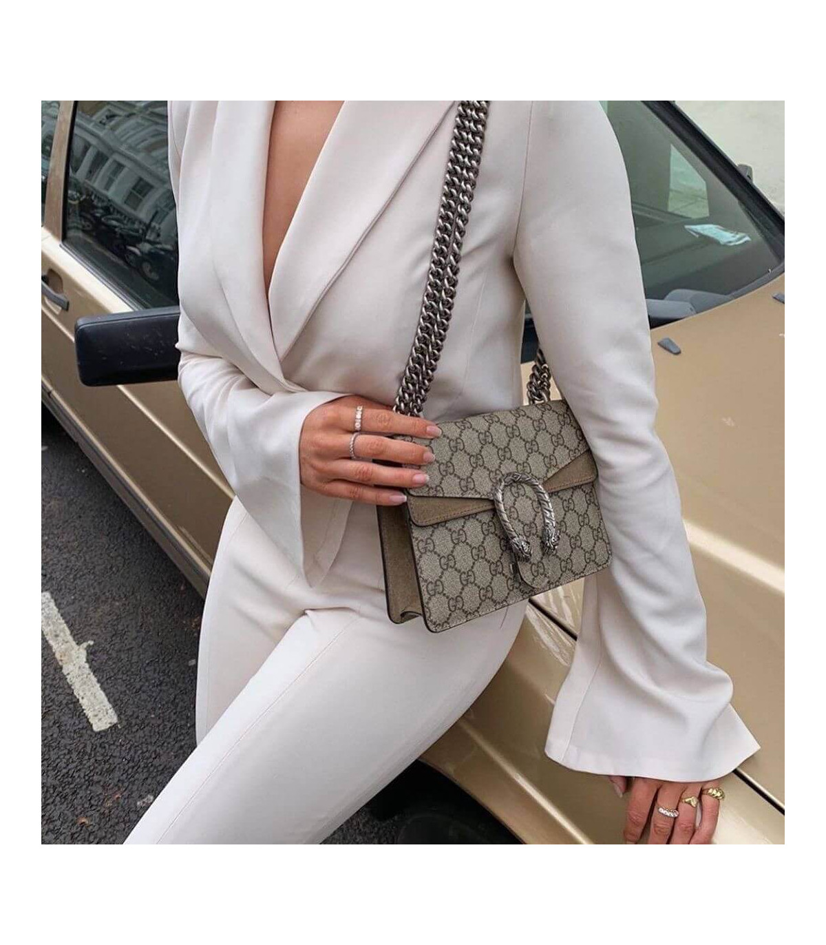 A mini structured bag with our textured tiger head spur closure. The sliding chain strap can be worn multiple ways, changing between a shoulder and a top handle bag.