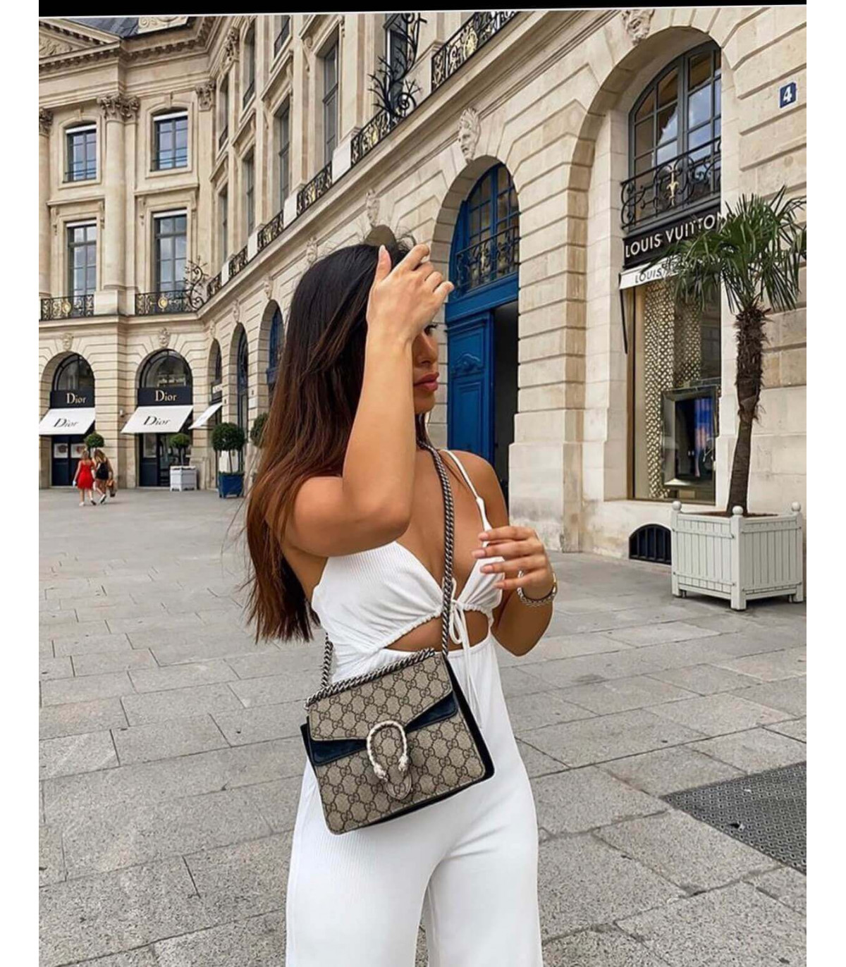 This mini structured bag features Gucci’s iconic tiger head spur closure, crafted from beige/ebony GG Supreme canvas with taupe suede trim. The sliding chain strap offers multiple styling options, worn as a shoulder or top handle bag. Elegant hand-painted edges and hand-stitched details complete the design.