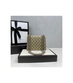 A refined mini bag crafted in beige/ebony GG Supreme canvas with taupe suede trim, featuring the iconic tiger head spur closure. The sliding chain strap offers styling flexibility—wear it as a shoulder or top handle bag. Detailed with hand-painted edges and a pocket under the flap for added function.