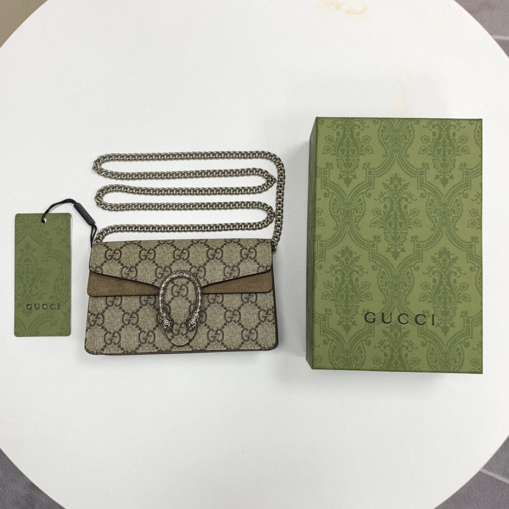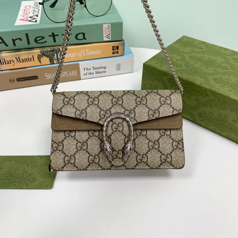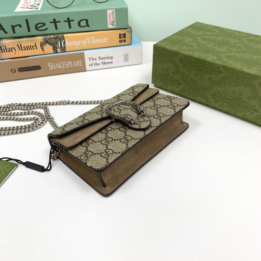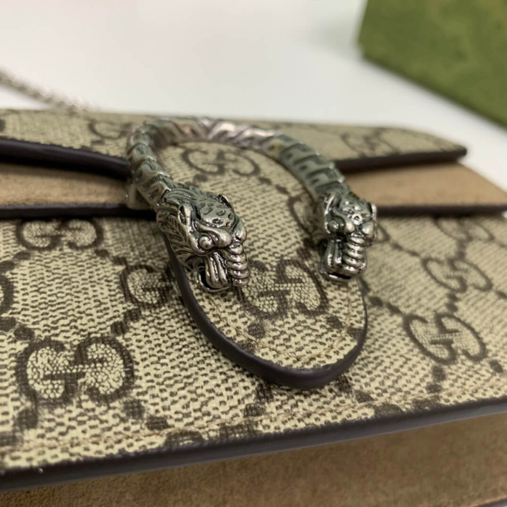 A structured GG Supreme canvas chain super mini bag with a key ring that can be used to attach this bag to a separate larger bag. The closure has the textured tiger head spur closure-a unique detail referencing the Greek god Dionysus, who in myth is said to have crossed the river Tigris on a tiger sent to him by Zeus.