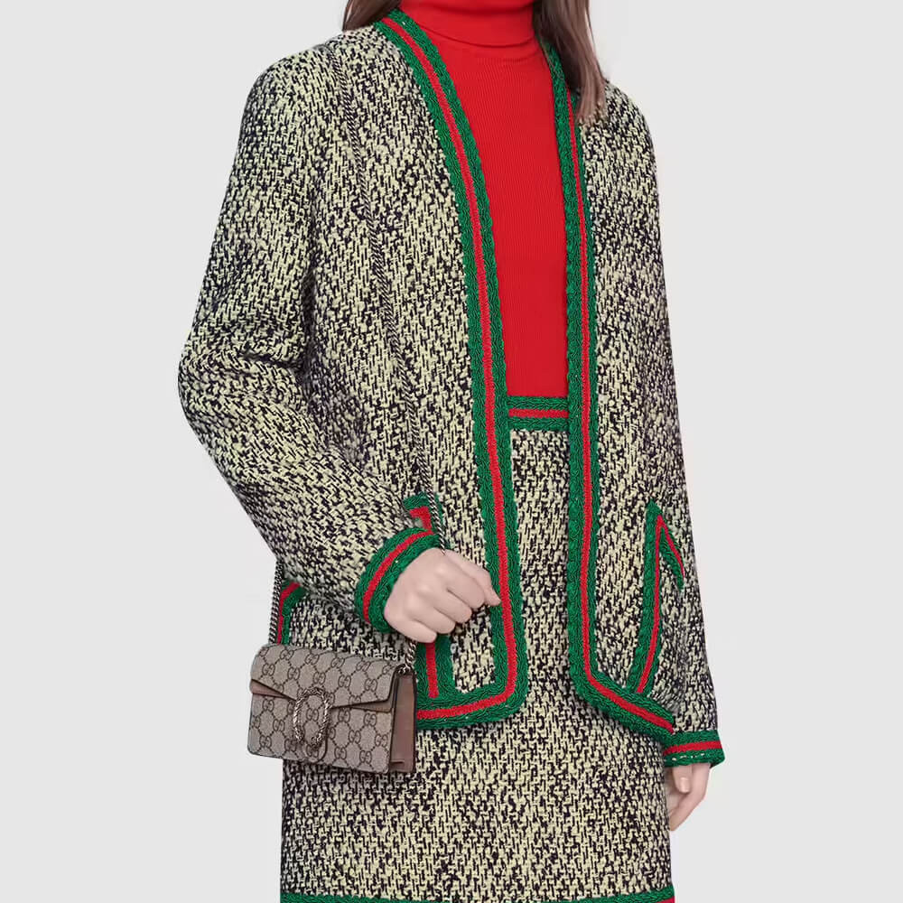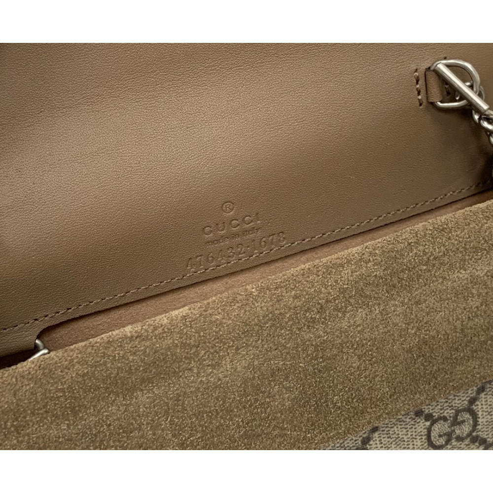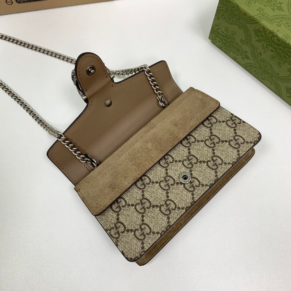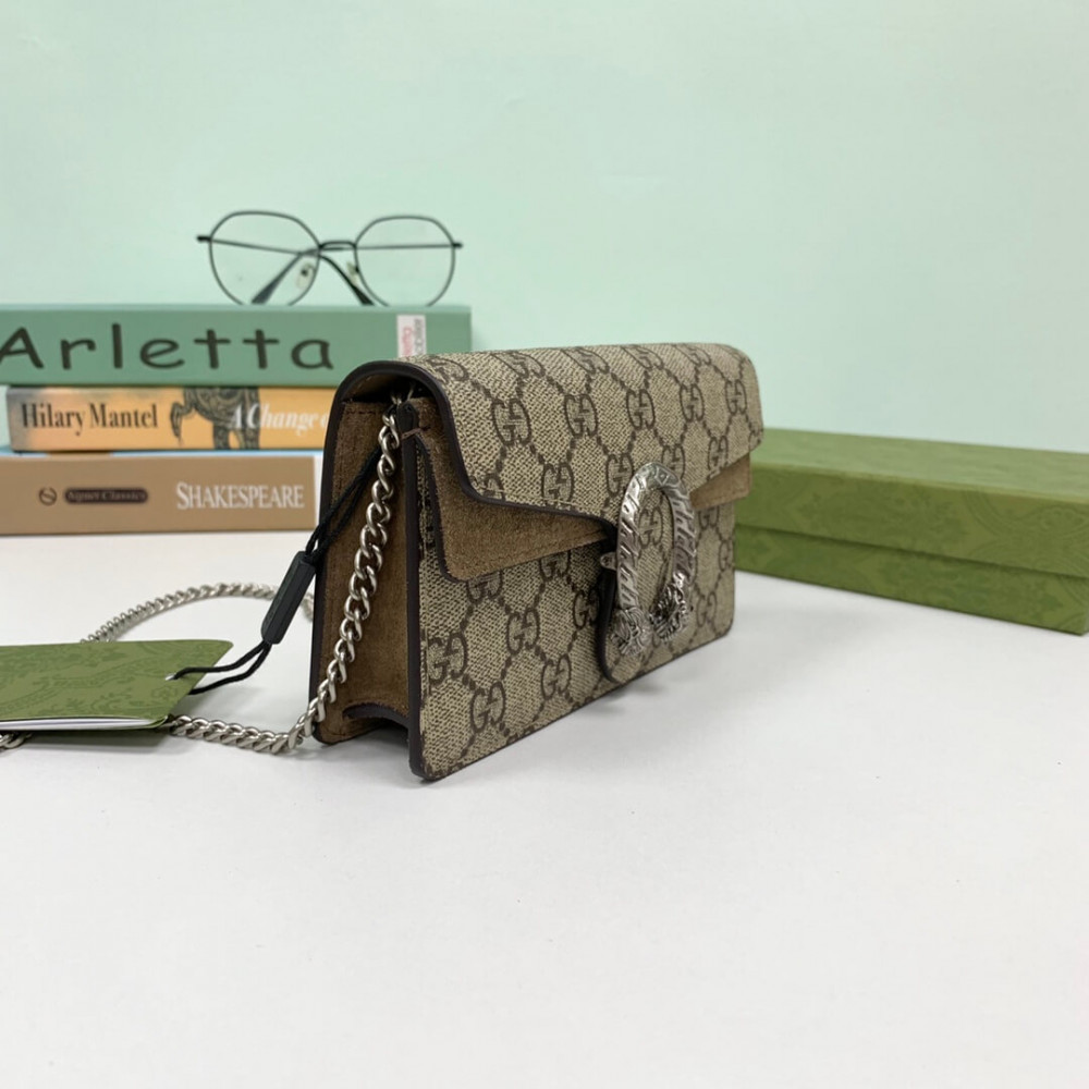 A structured GG Supreme canvas chain super mini bag with a key ring that can be used to attach this bag to a separate larger bag. The closure has the textured tiger head spur closure-a unique detail referencing the Greek god Dionysus, who in myth is said to have crossed the river Tigris on a tiger sent to him by Zeus.