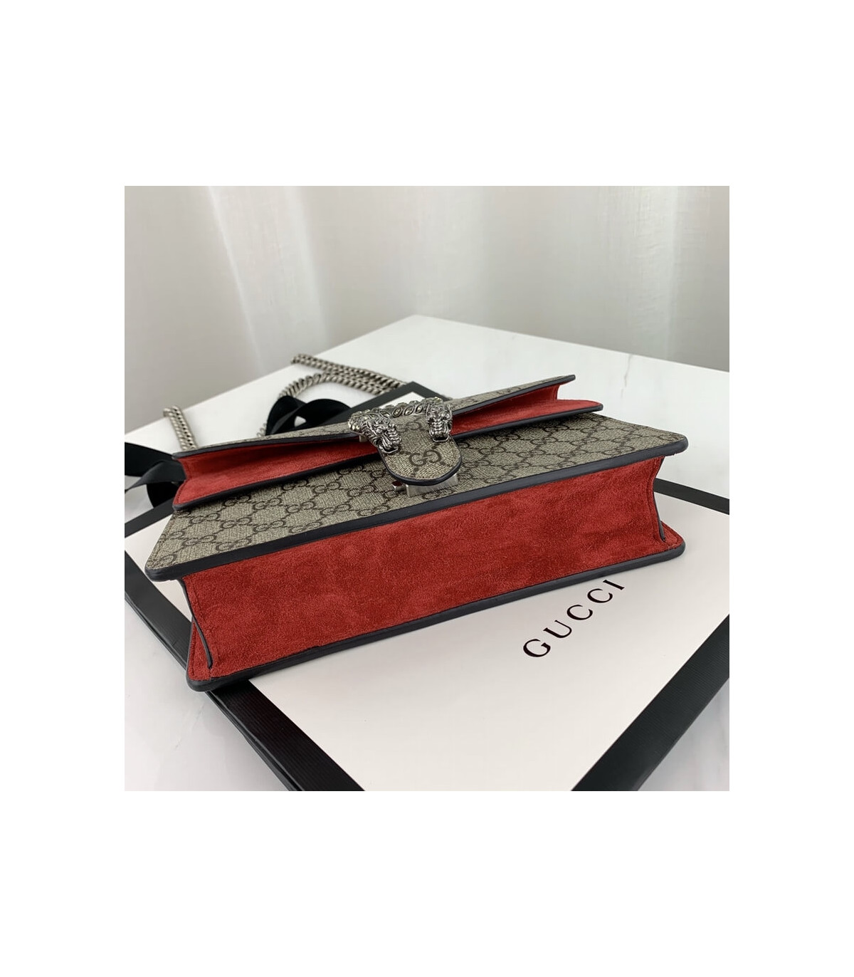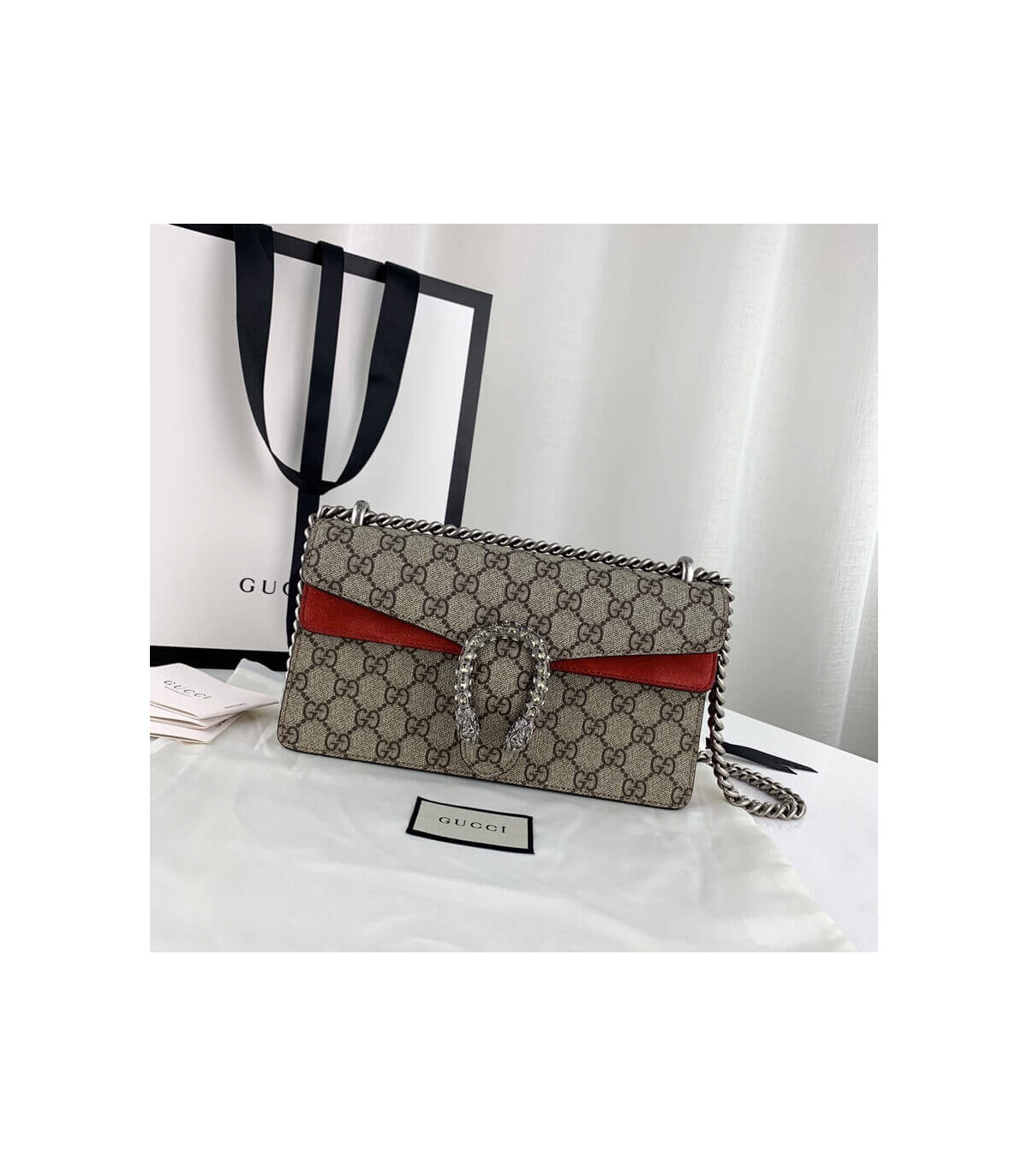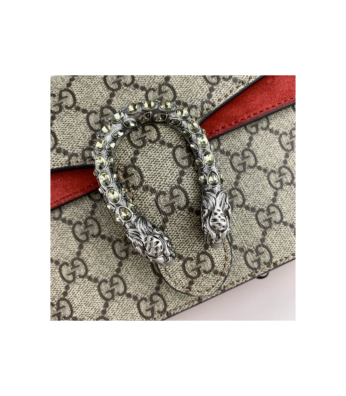 Crafted as a 1:1 rep of the original, this small Dionysus shoulder bag features the signature GG Supreme canvas paired with rich red suede trim. The iconic tiger head closure—adorned with sparkling crystals—pays homage to the myth of Dionysus. A sliding chain strap offers styling versatility as both a shoulder and top handle bag.