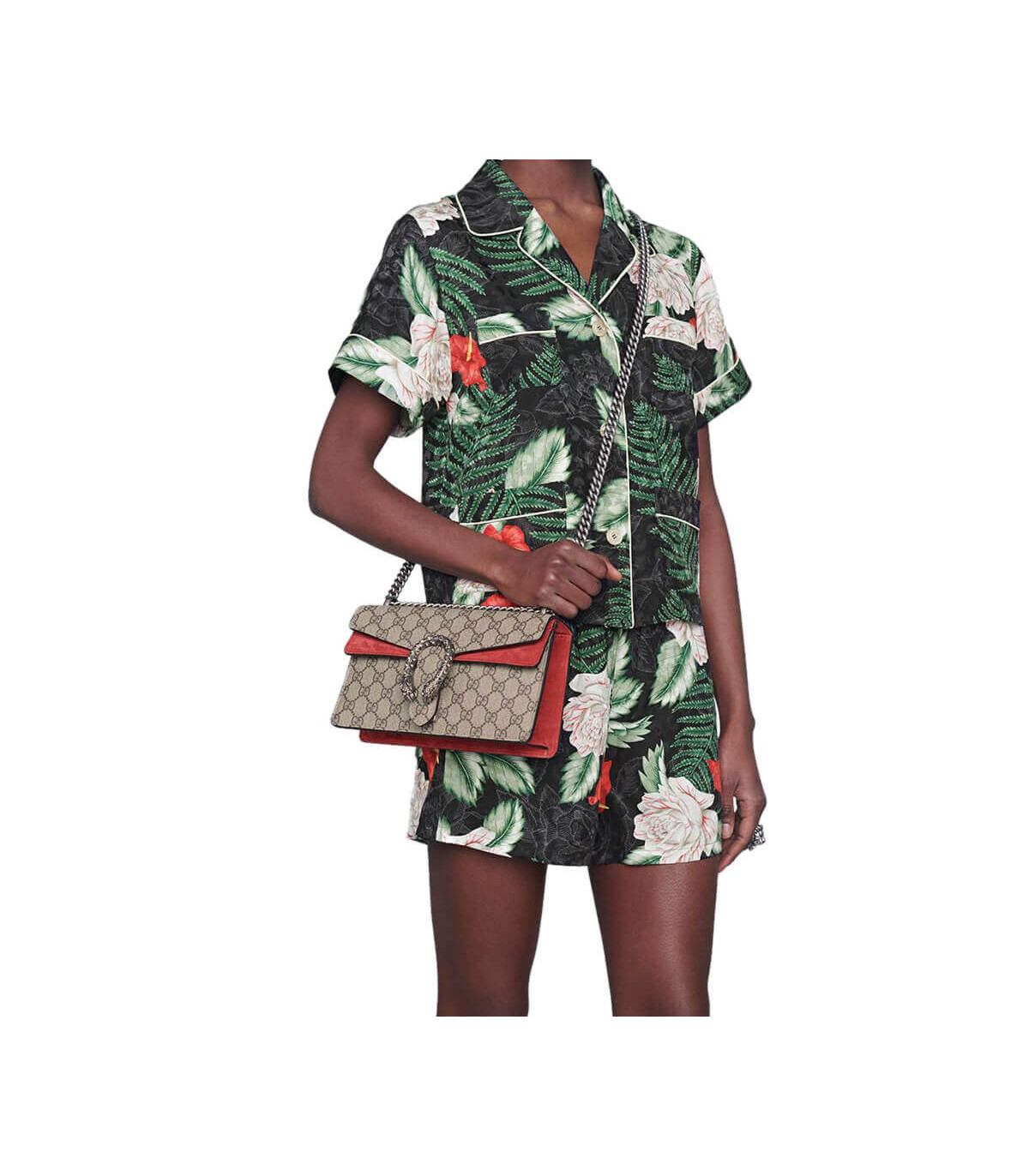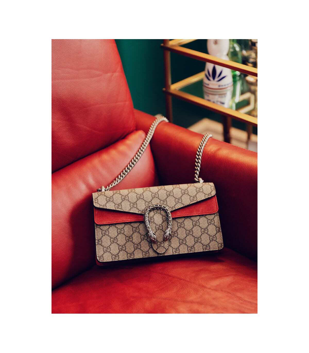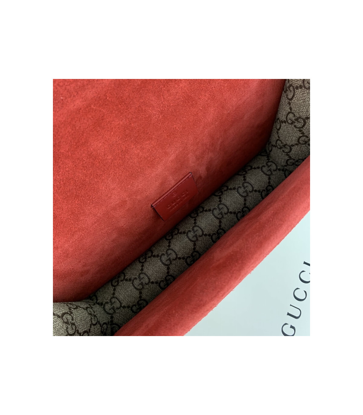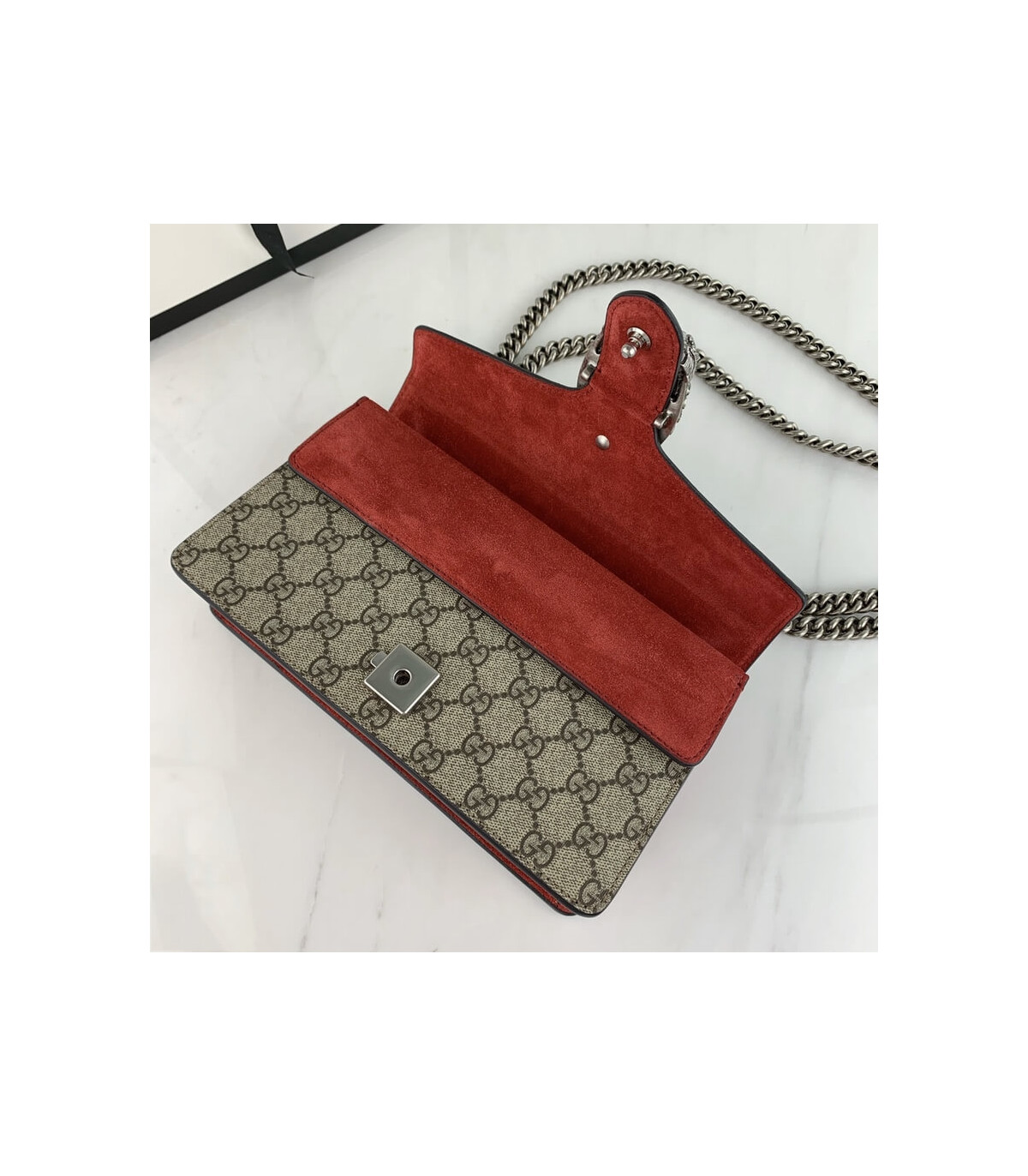 Crafted as a 1:1 rep of the original, this small Dionysus shoulder bag features the signature GG Supreme canvas paired with rich red suede trim. The iconic tiger head closure—adorned with sparkling crystals—pays homage to the myth of Dionysus. A sliding chain strap offers styling versatility as both a shoulder and top handle bag.