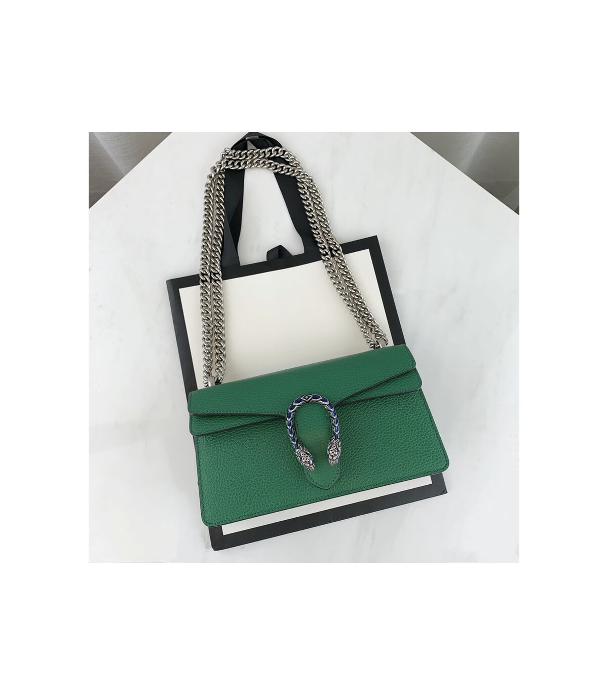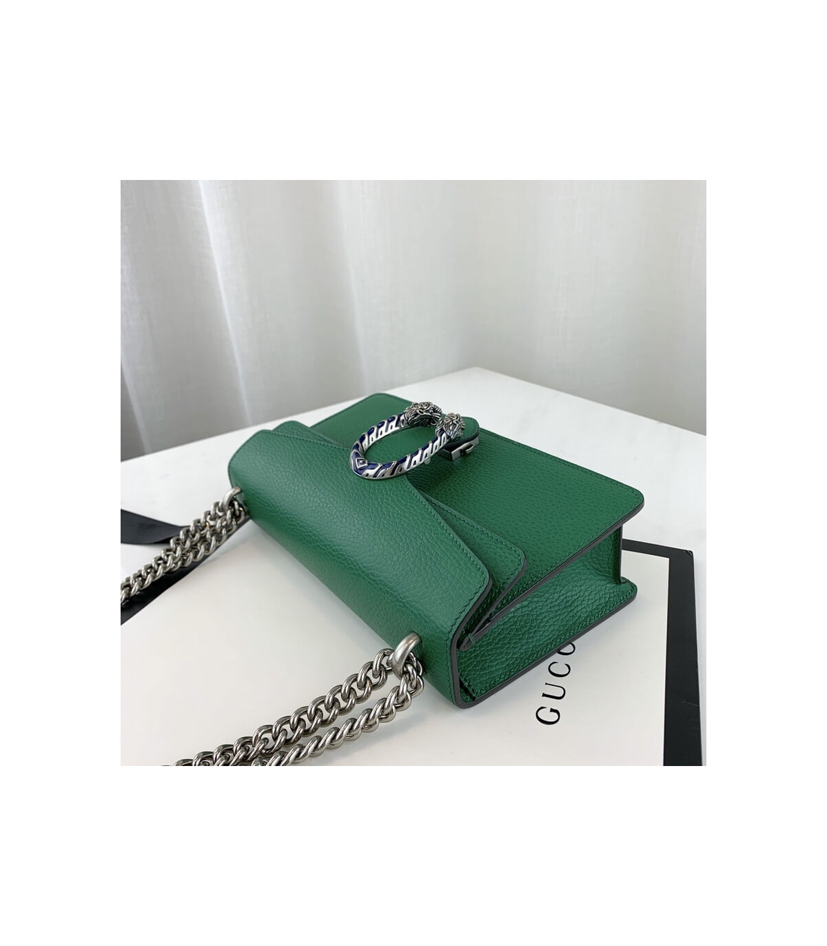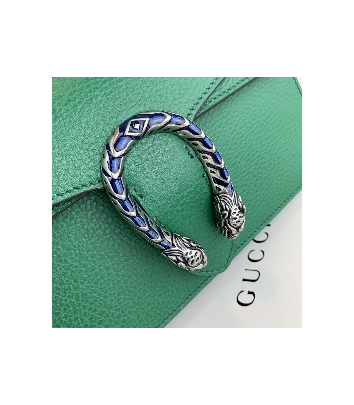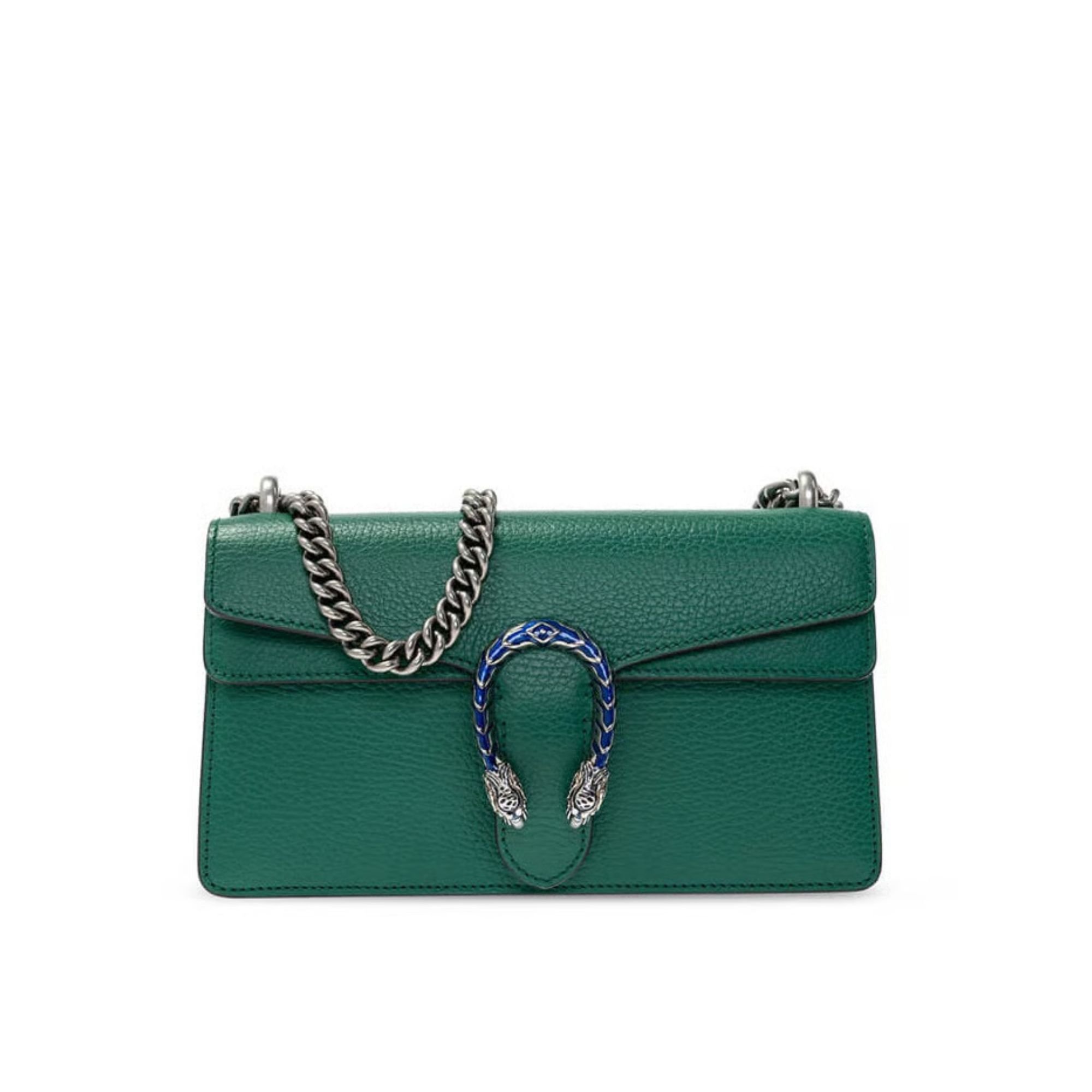 Part of the Epilogue message of timeless style, this small Dionysus bag is crafted from green textured leather and accented with antique silver-toned hardware. The signature tiger head closure is reimagined with striking electric blue enamel, adding a bold touch to this beloved House design. Versatile and iconic, the sliding chain strap can be styled as a shoulder or top handle bag.