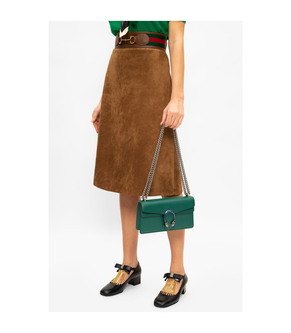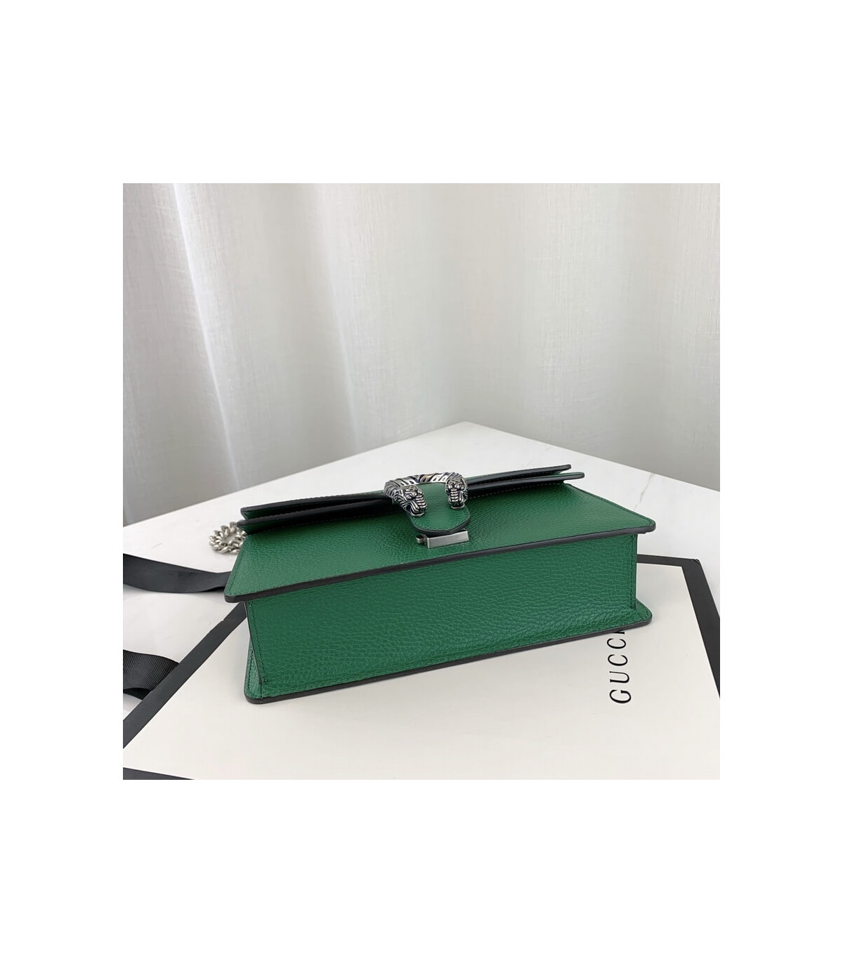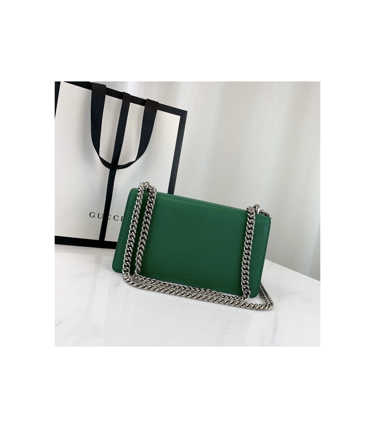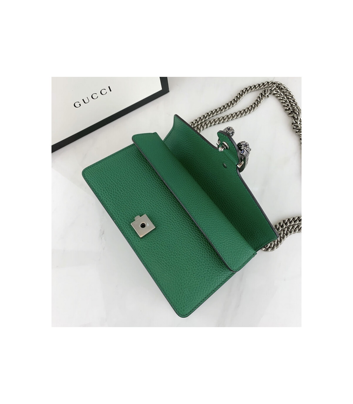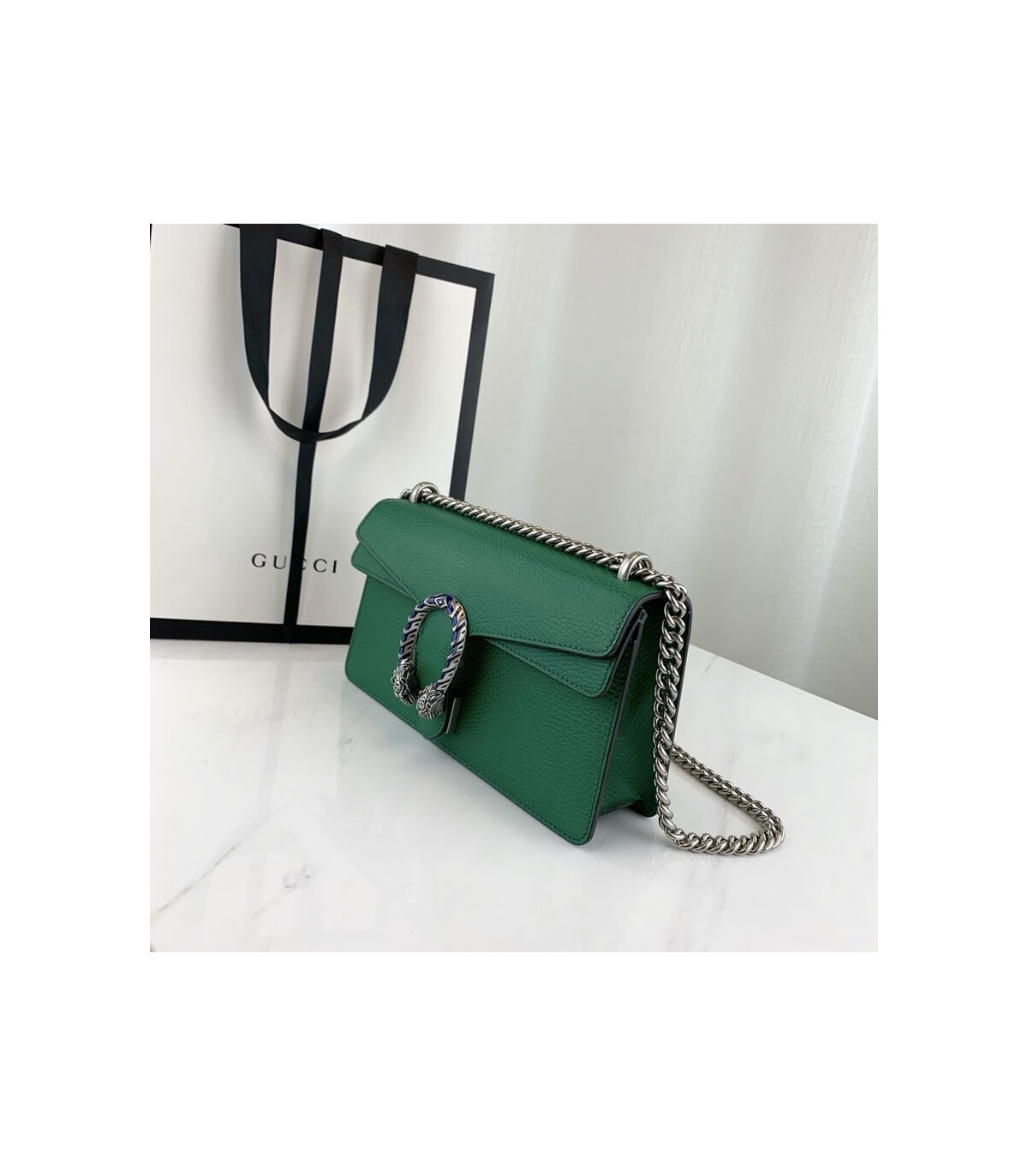 Part of the Epilogue message of timeless style, this small Dionysus bag is crafted from green textured leather and accented with antique silver-toned hardware. The signature tiger head closure is reimagined with striking electric blue enamel, adding a bold touch to this beloved House design. Versatile and iconic, the sliding chain strap can be styled as a shoulder or top handle bag.
