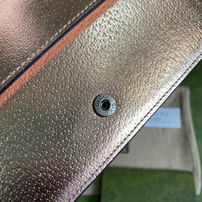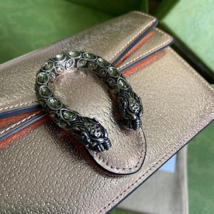 The structured super mini bag is introduced in metallic silver leather, with a key ring that can be used to attach the bag to a separate larger bag. The closure features the textured tiger head spur—the unique detail defines the line, referencing the Greek god Dionysus, who in myth is said to have crossed the river Tigris on a tiger sent to him by Zeus.