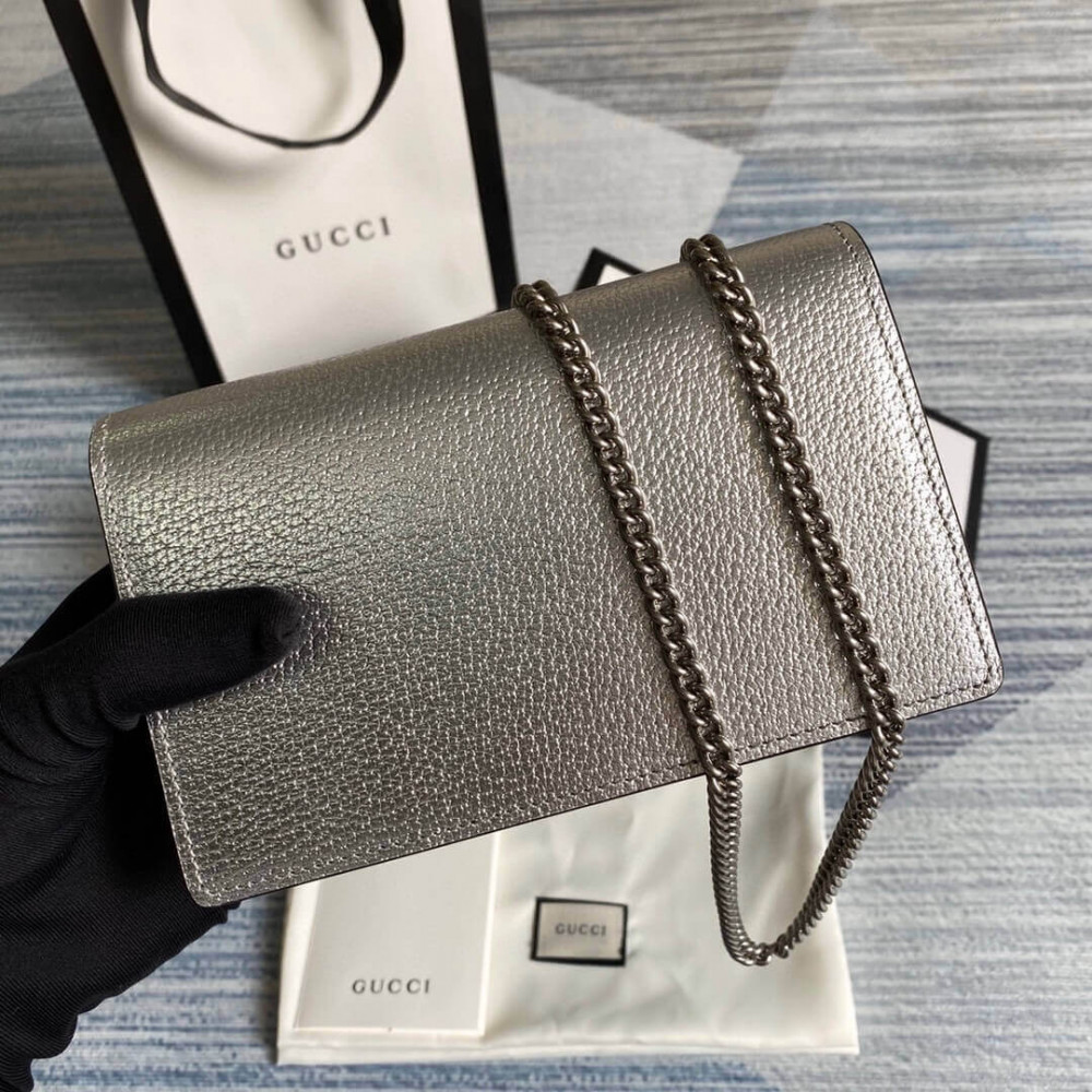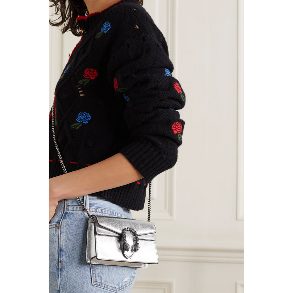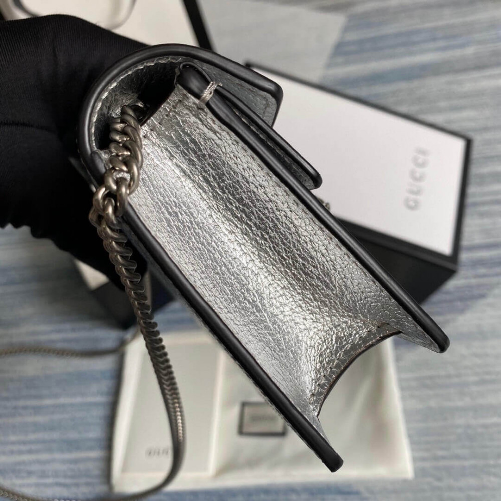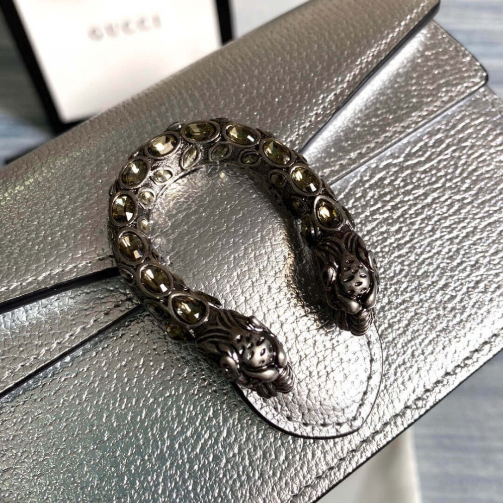The structured super mini bag is introduced in metallic silver leather, with a key ring that can be used to attach the bag to a separate larger bag. The closure features the textured tiger head spur—the unique detail defines the line, referencing the Greek god Dionysus, who in myth is said to have crossed the river Tigris on a tiger sent to him by Zeus.