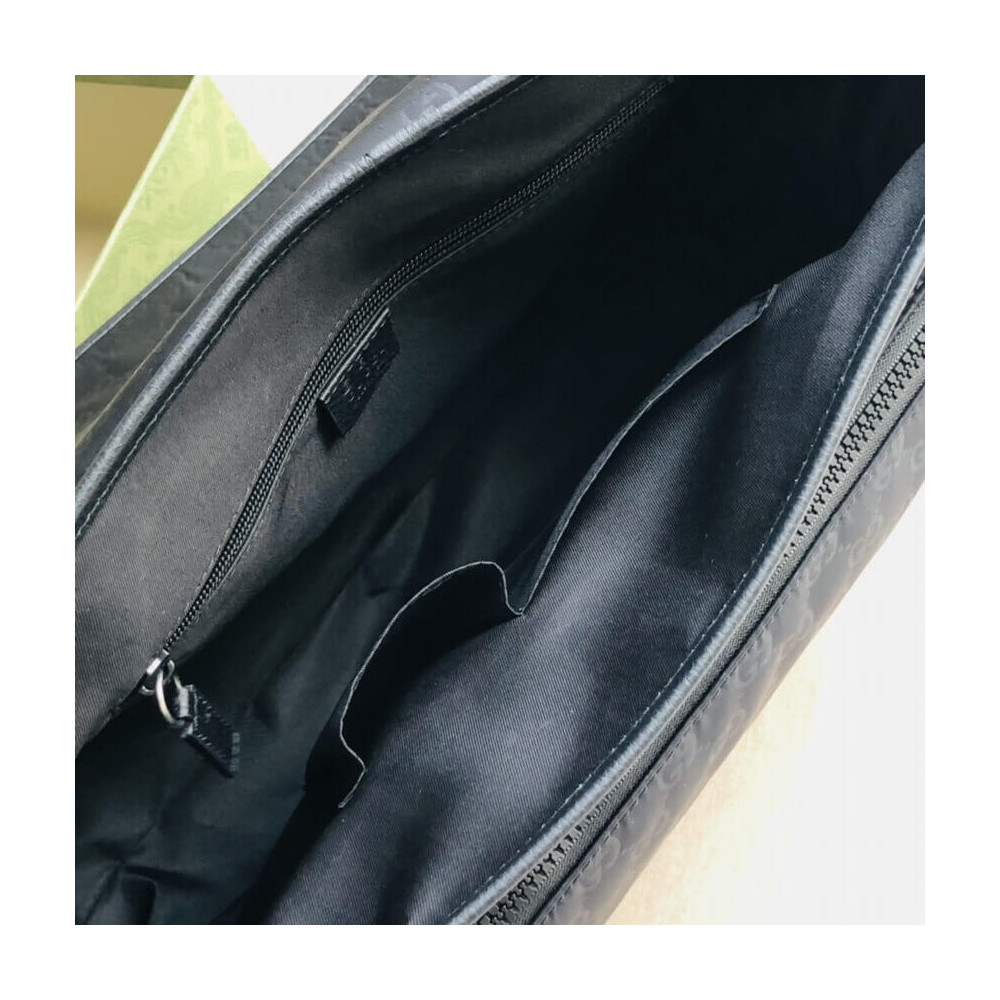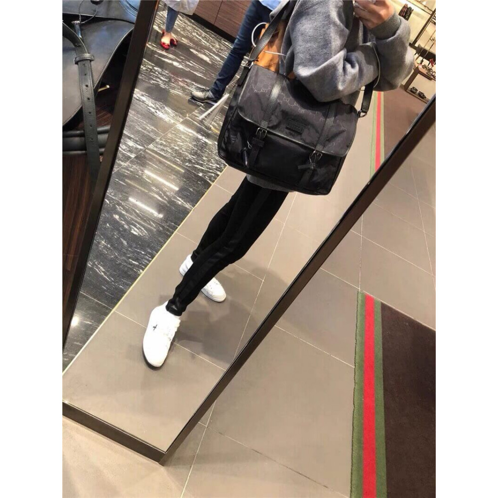 This stylish messenger bag is crafted of luxurious textured nylon in navy blue. The bag features an adjustable leather shoulder strap with silver hardware, and a facing flap with leather belts.