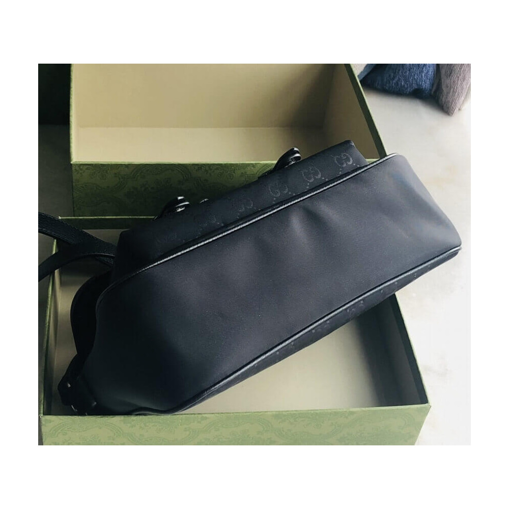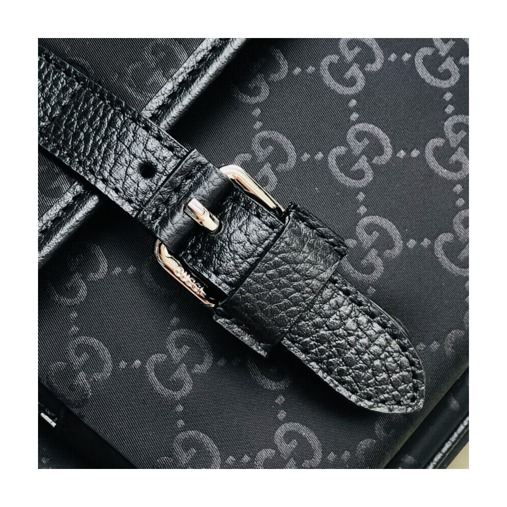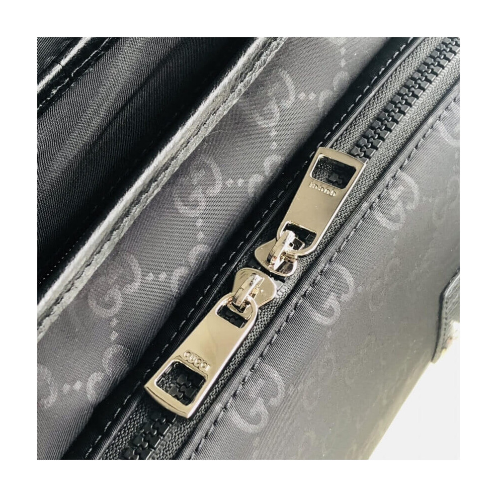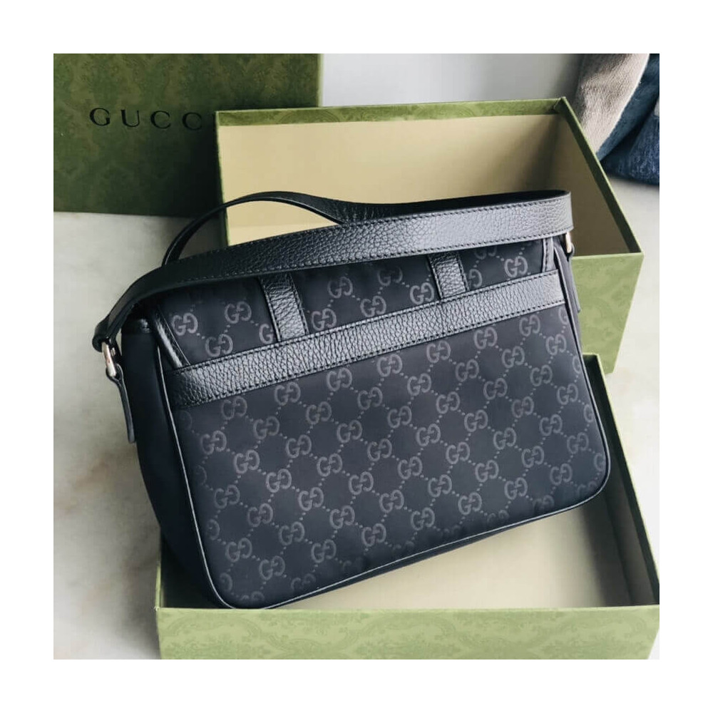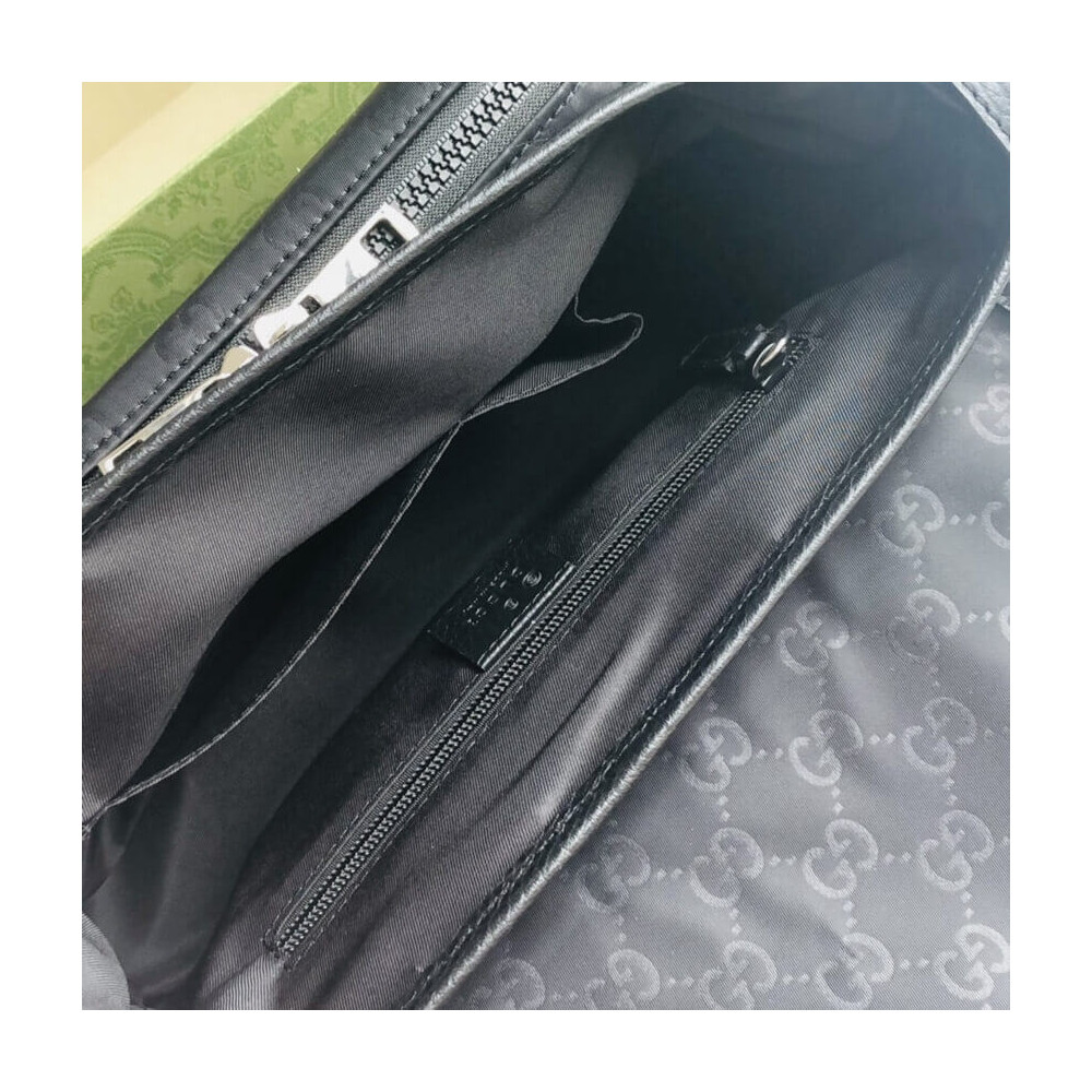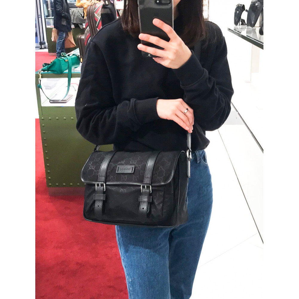 – Made of nylon; Adjustable leather shoulder strap; Silver hardware; Interior slip and zip pockets