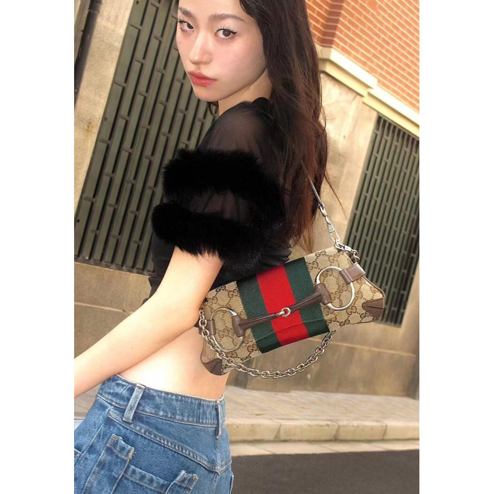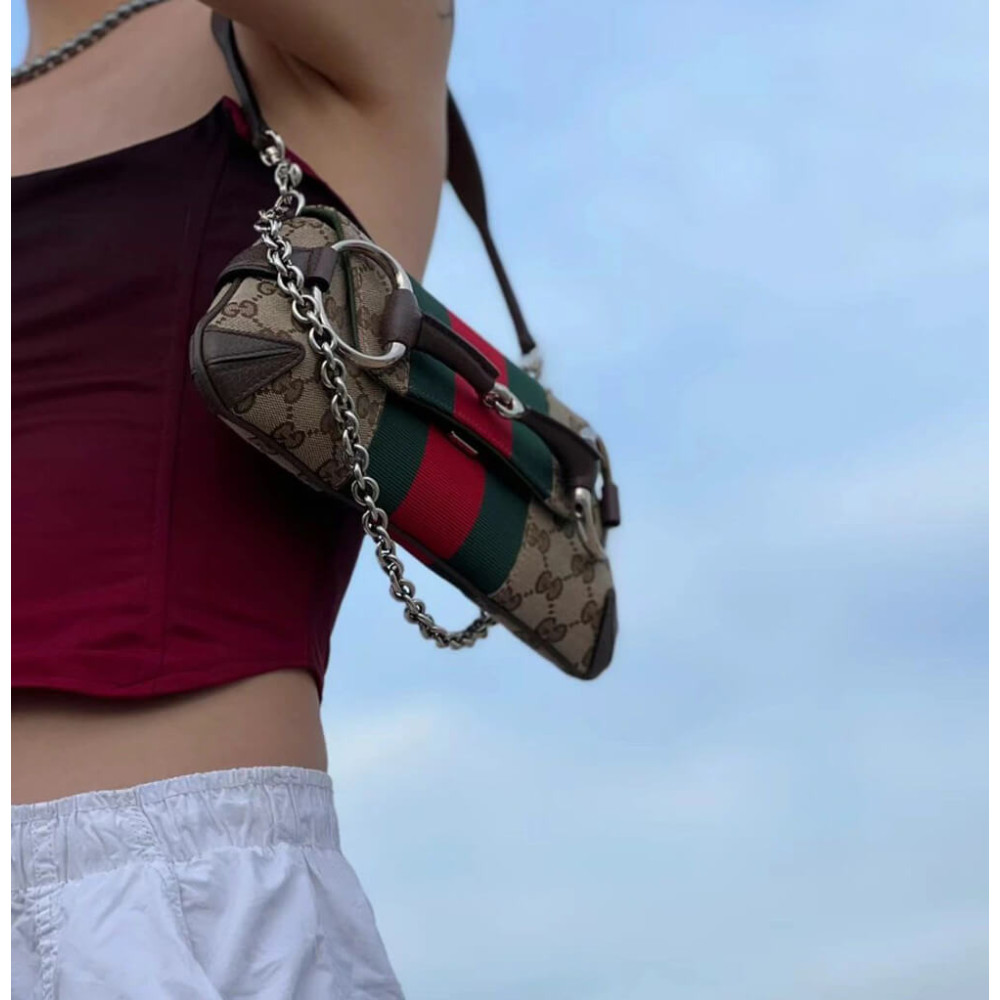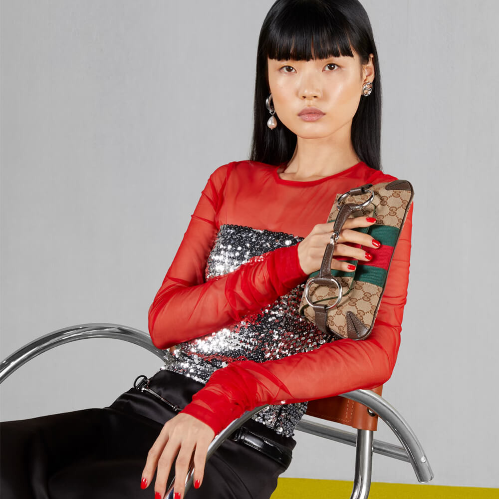 Gucci successfully recalls its past by connecting the archives to the present day. Adorned with a maxi Horsebit, first made popular during the early ‘2000s, this silhouette continues to be one of the most recognizable handbags of the House. Revisited for the Fall Winter 2023 collection, it is presented in various colors and textures that follow a contemporary approach.