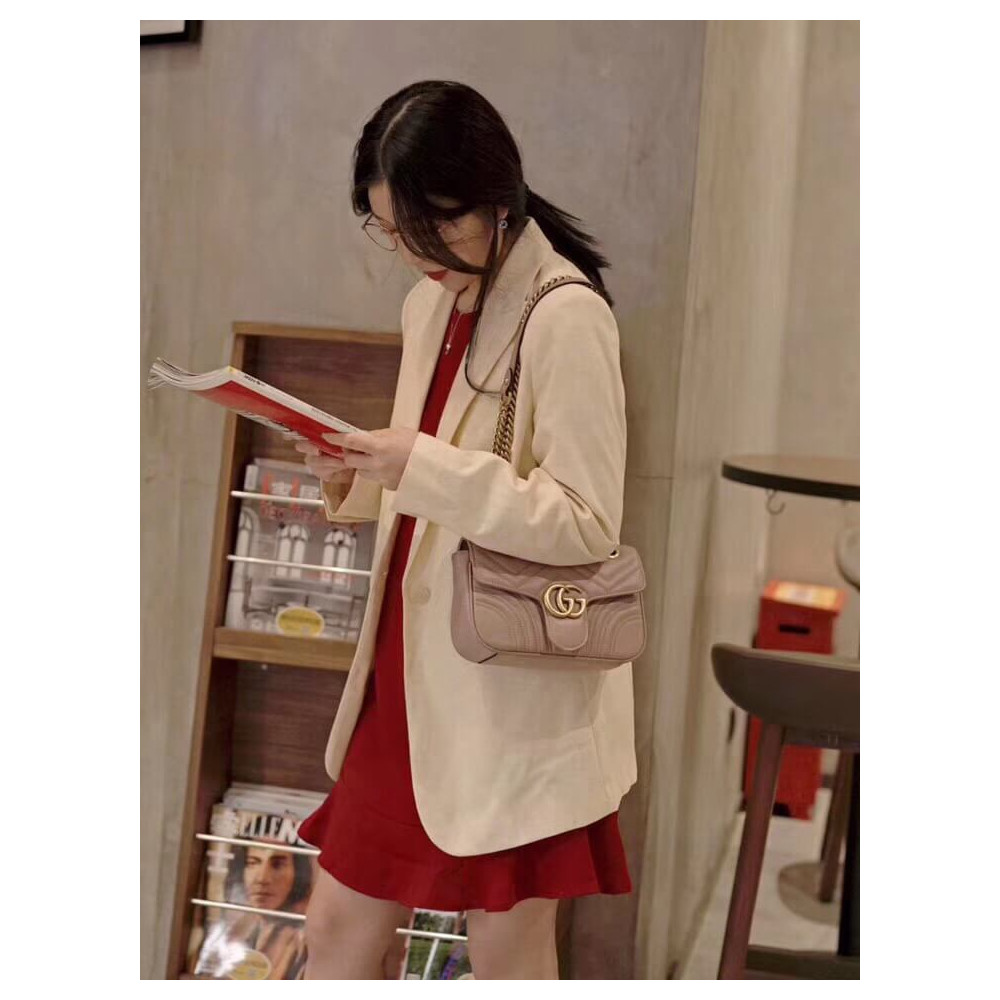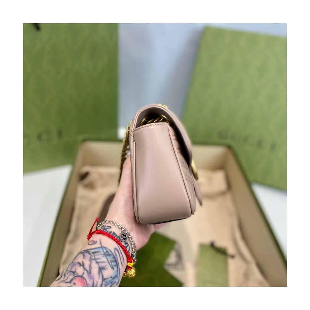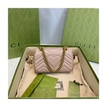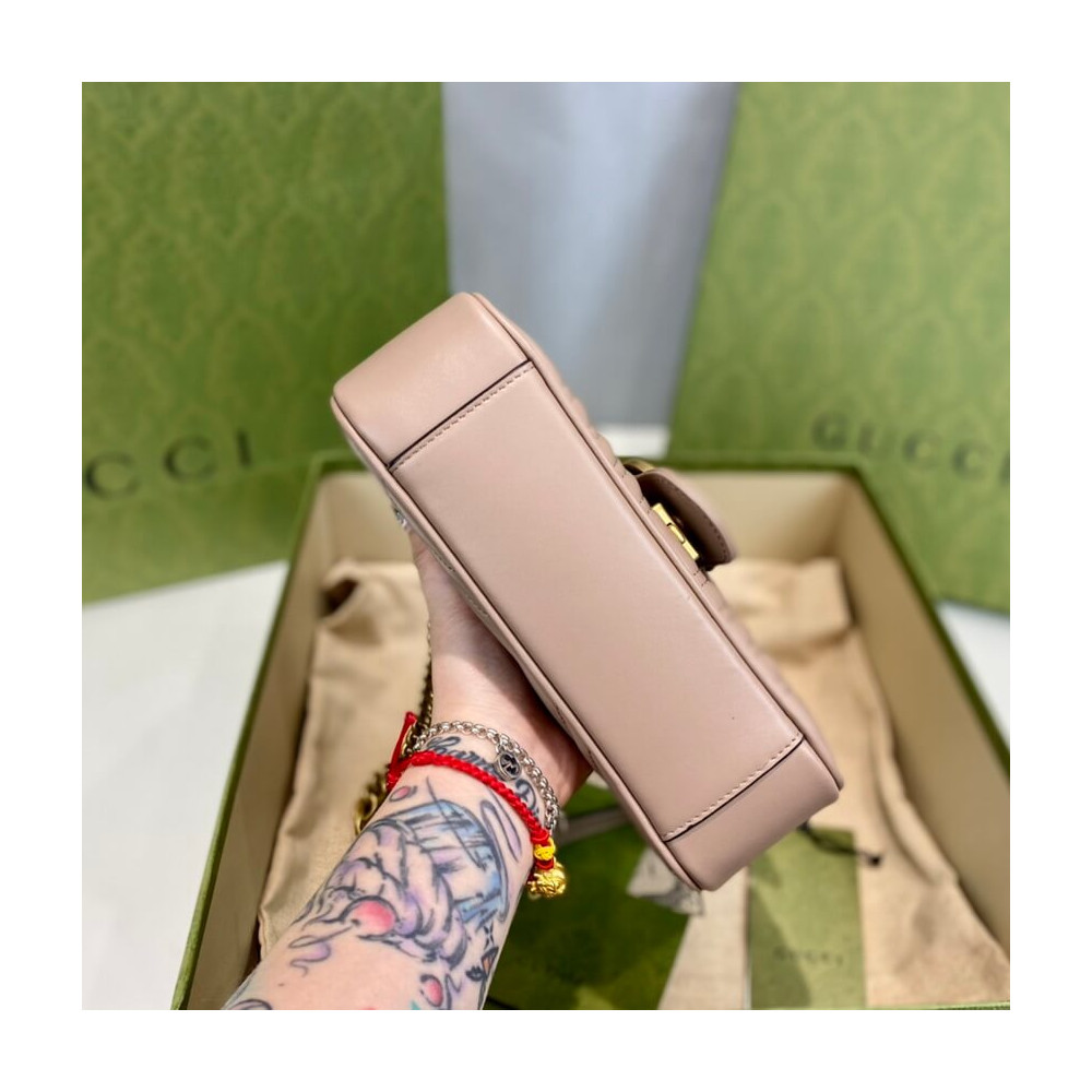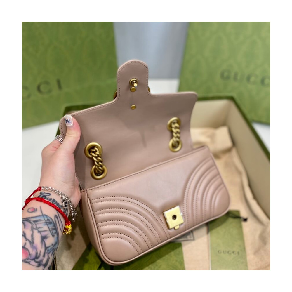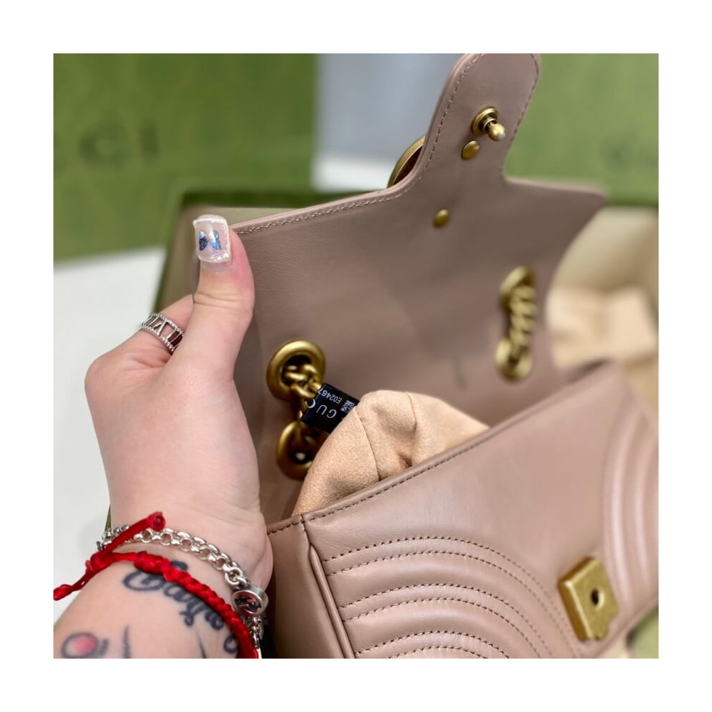 The mini GG Marmont chain shoulder bag has a softly structured shape and an oversized flap closure with Double G hardware. The sliding chain strap can be worn multiple ways, changing between a shoulder and a top handle bag. Made in matelassé chevron leather with a heart on the back.