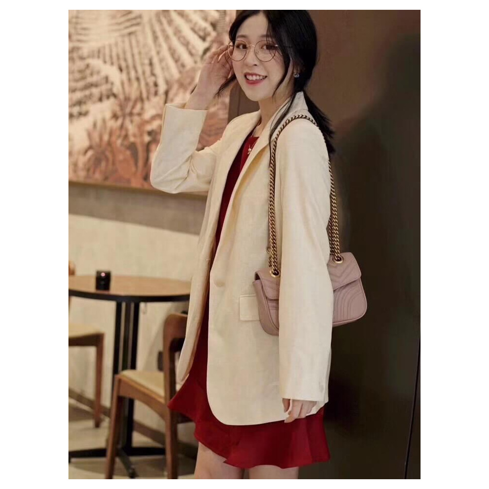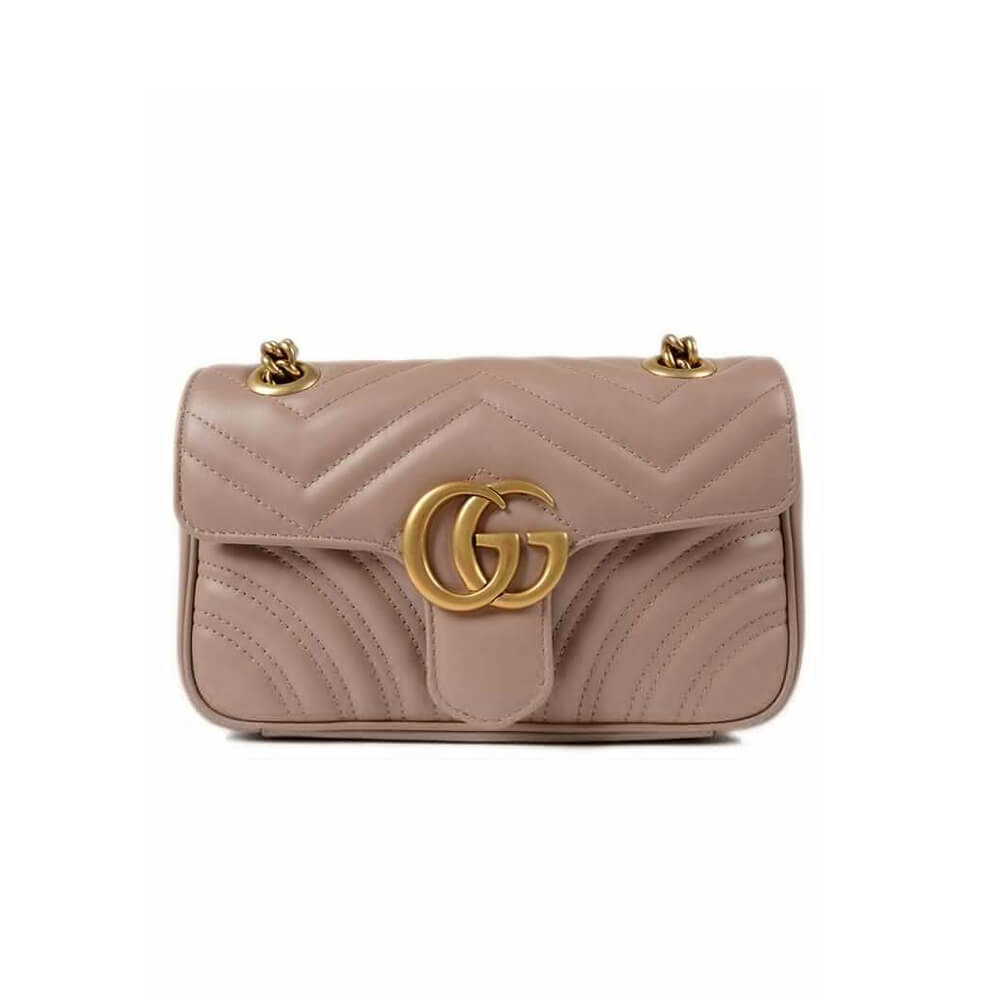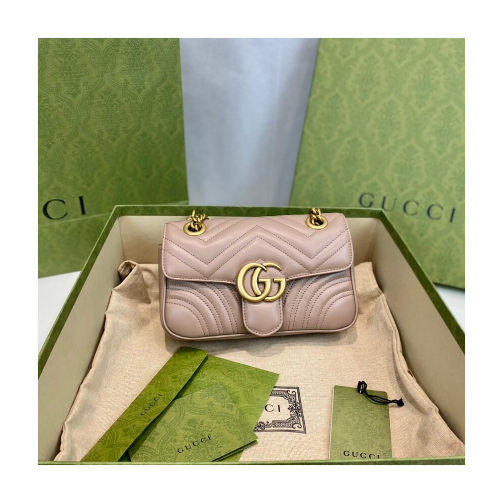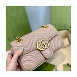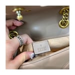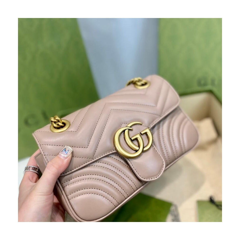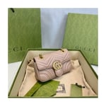 The mini GG Marmont chain shoulder bag has a softly structured shape and an oversized flap closure with Double G hardware. The sliding chain strap can be worn multiple ways, changing between a shoulder and a top handle bag. Made in matelassé chevron leather with a heart on the back.
