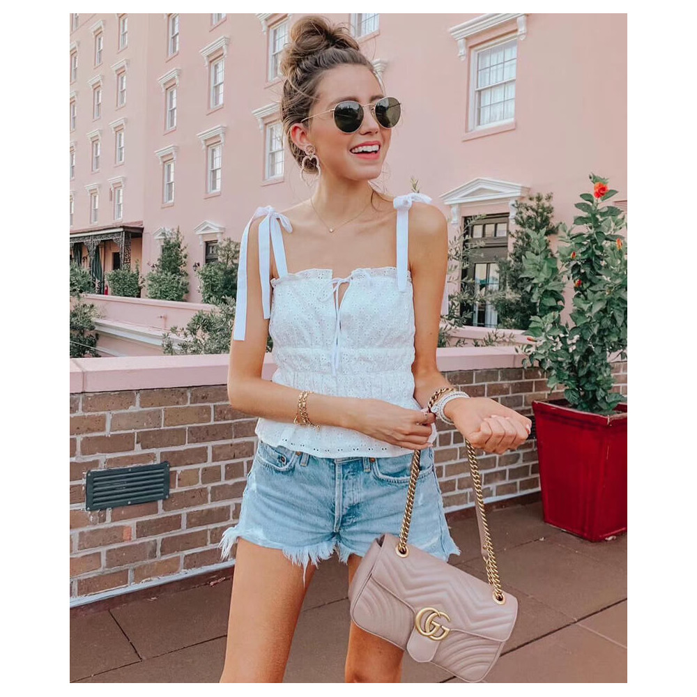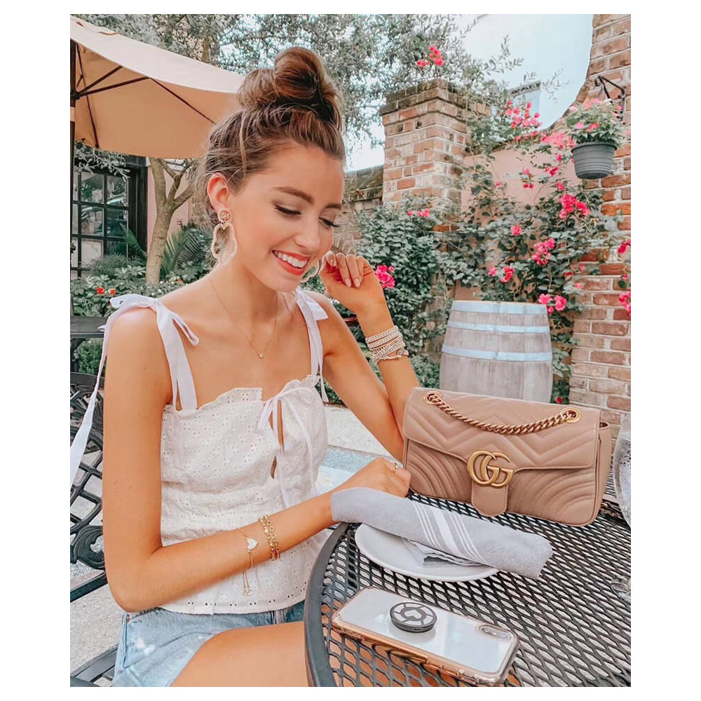 – Sliding chain strap can be worn as a shoulder strap with 22″ drop or can be worn as a top handle with 12″ drop