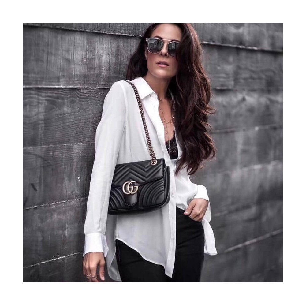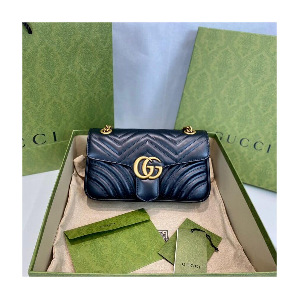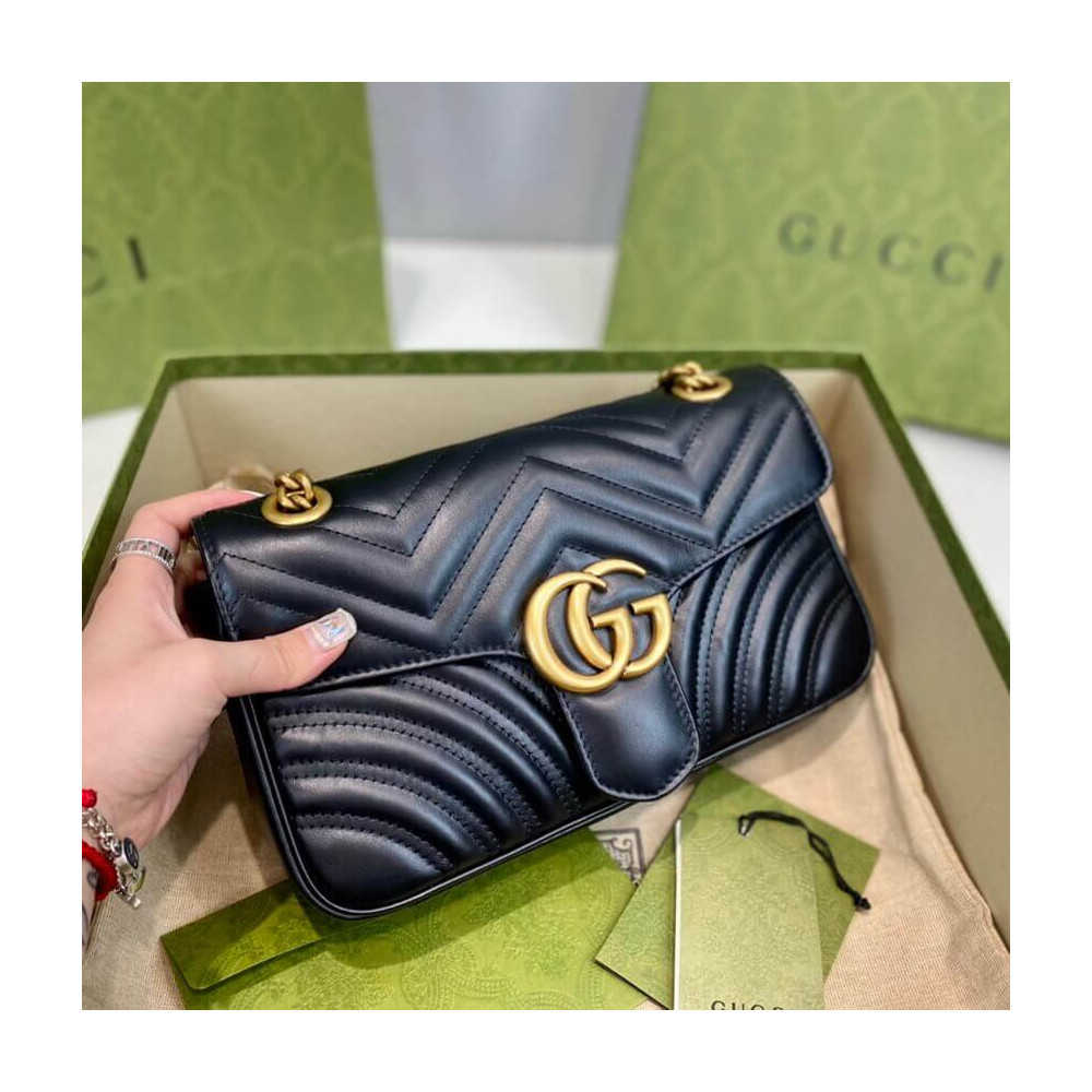 The small GG Marmont chain shoulder bag has a softly structured shape and an oversized flap closure with Double G hardware. The sliding chain strap can be worn multiple ways, changing between a shoulder and a top handle bag. Made in matelassé chevron leather with a heart on the back.