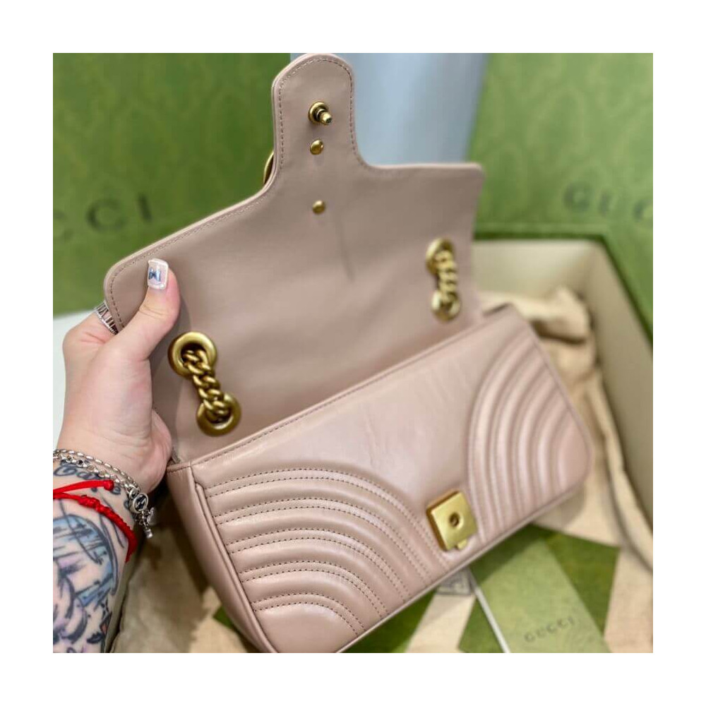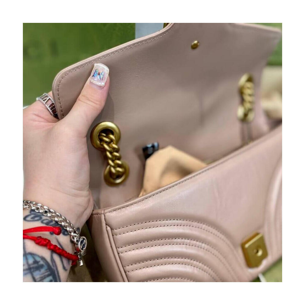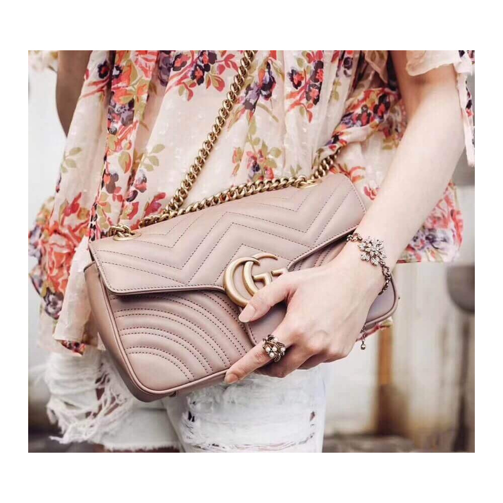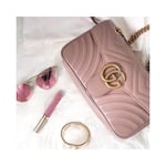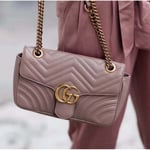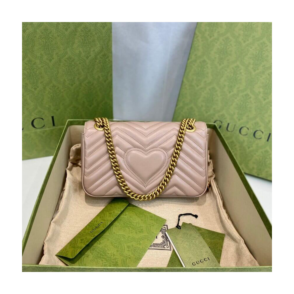 The small GG Marmont chain shoulder bag has a softly structured shape and an oversized flap closure with Double G hardware. The sliding chain strap can be worn multiple ways, changing between a shoulder and a top handle bag. Made in matelassé chevron leather with a heart on the back.