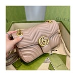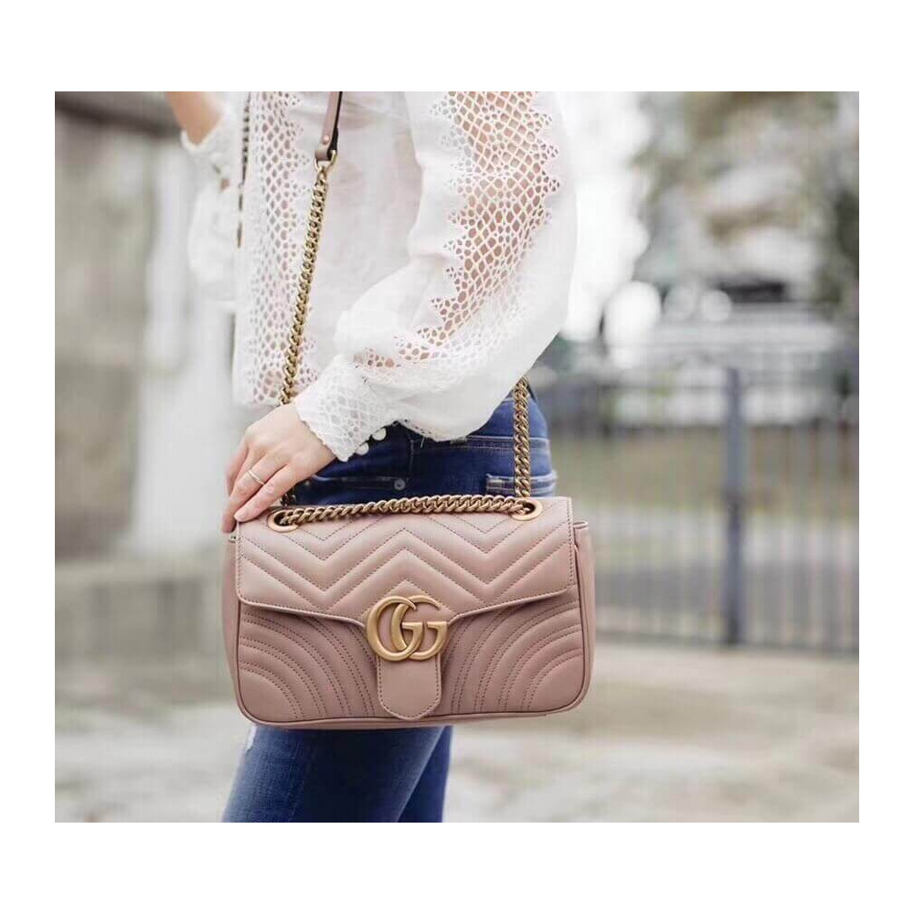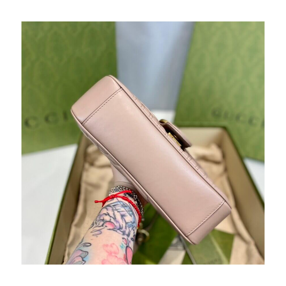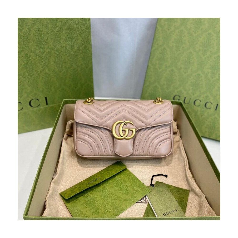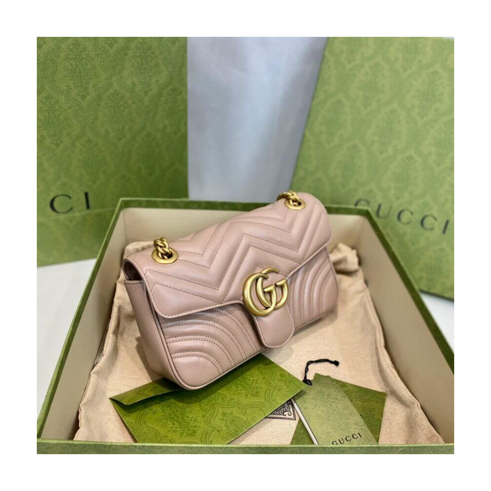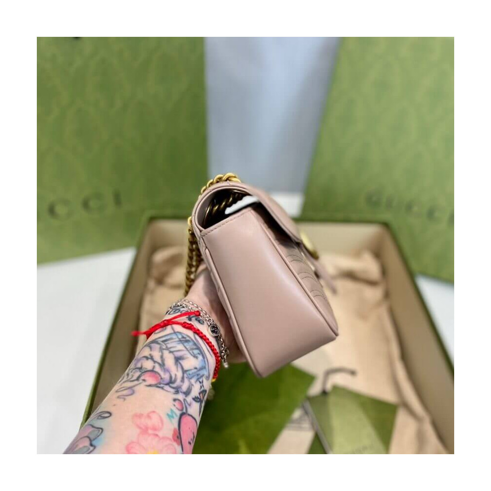 The small GG Marmont chain shoulder bag has a softly structured shape and an oversized flap closure with Double G hardware. The sliding chain strap can be worn multiple ways, changing between a shoulder and a top handle bag. Made in matelassé chevron leather with a heart on the back.