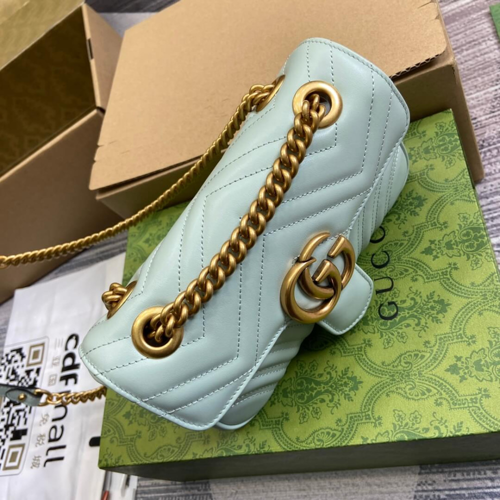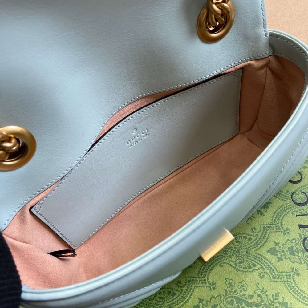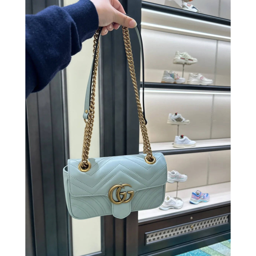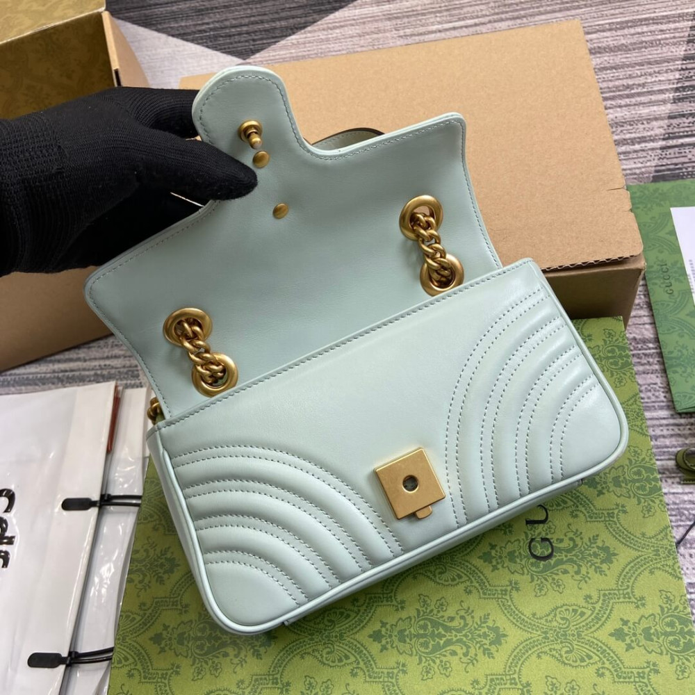 Made in matelassé chevron leather in a soft shade of pale green, the now recognizable GG Marmont mini bag has a softly structured shape and a flap closure with Double G hardware. Designed to be worn multiple ways, the chain strap slides to change between a shoulder and a top handle bag.