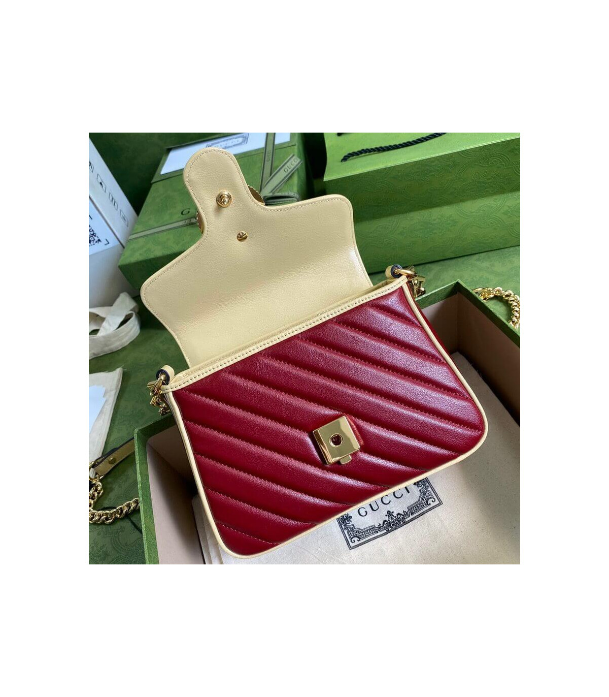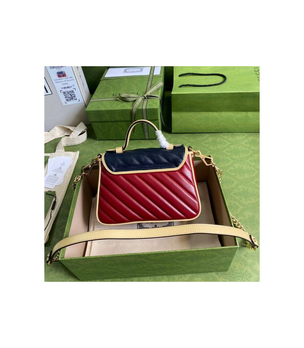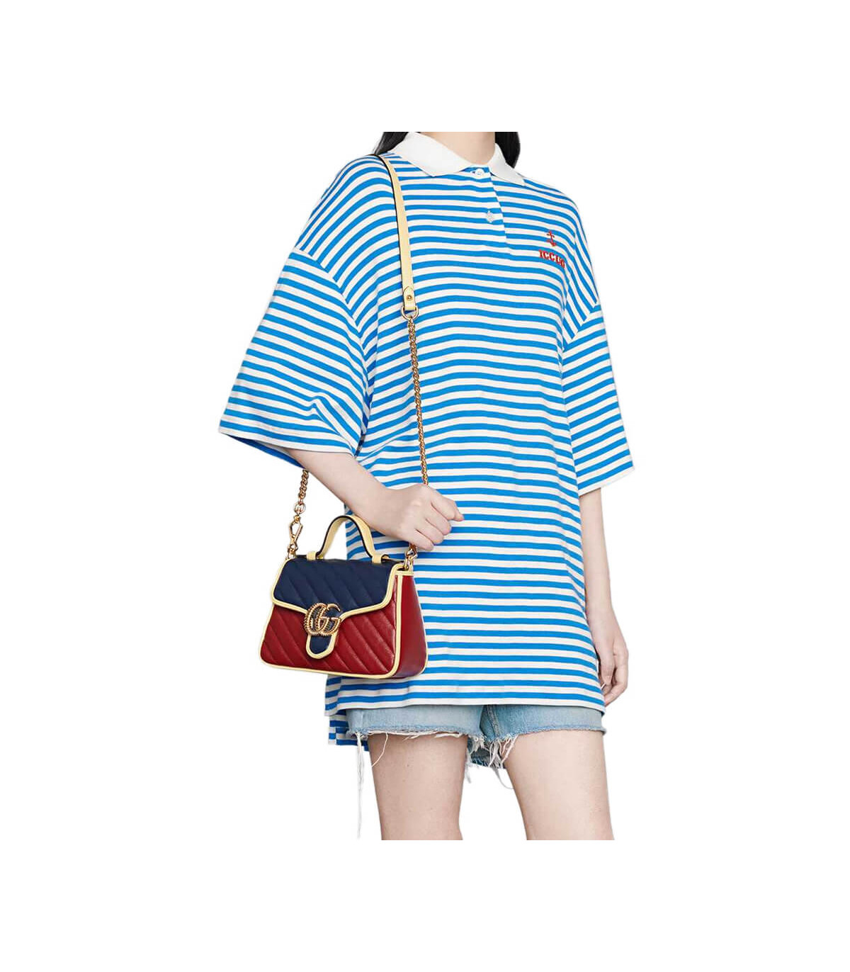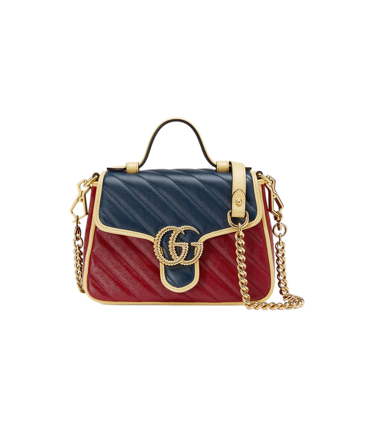 Soft shades appear throughout the latest collections, adding a whimsical feel. The GG Marmont bag is presented in diagonal matelassé quilted leather in soft shades of butter and blue. The mini top handle’s distinct softly structured shape is outlined in black piping, highlighting its flap closure.