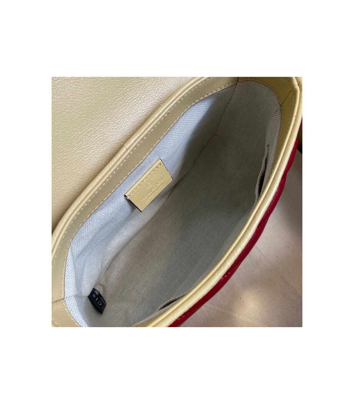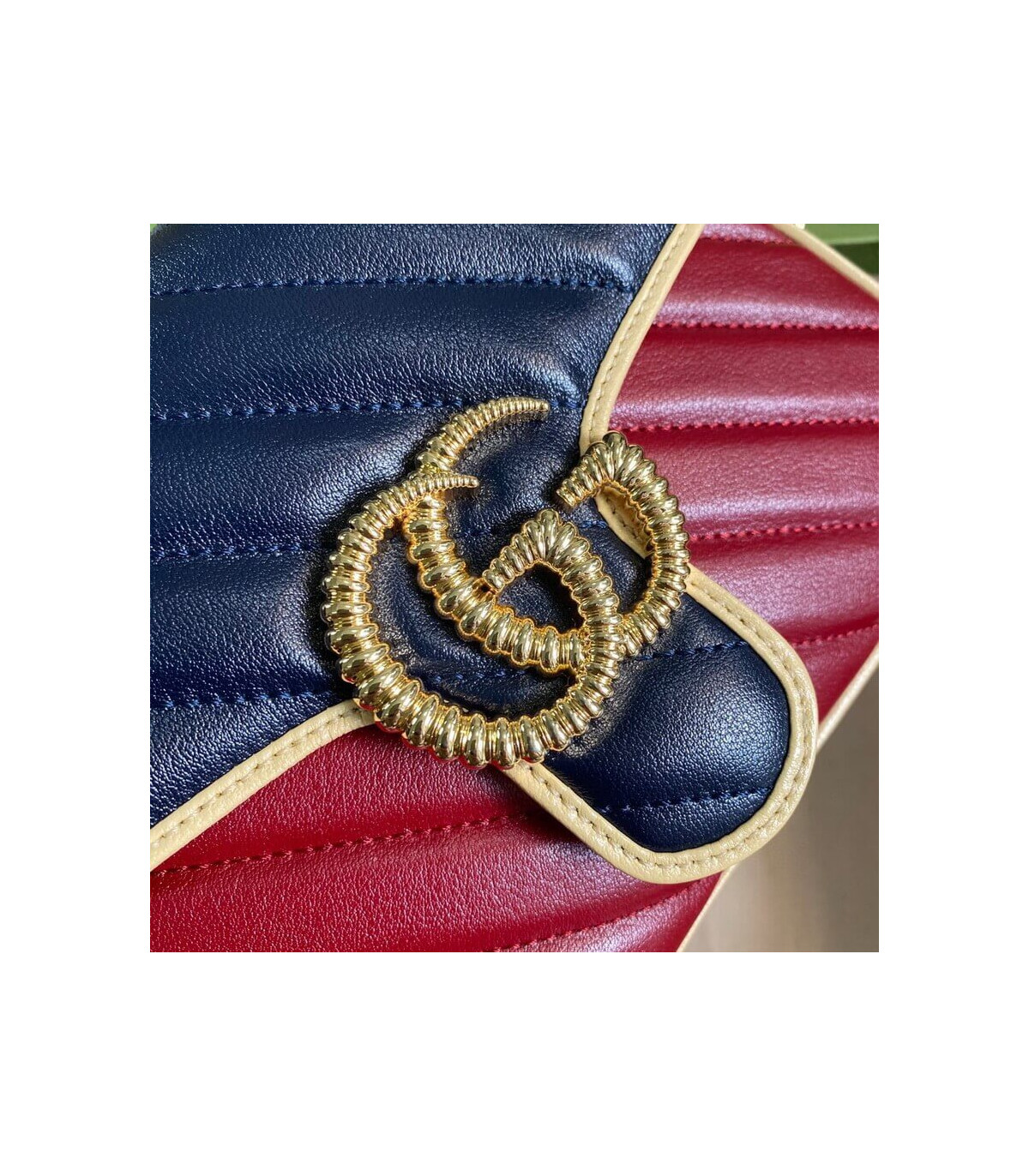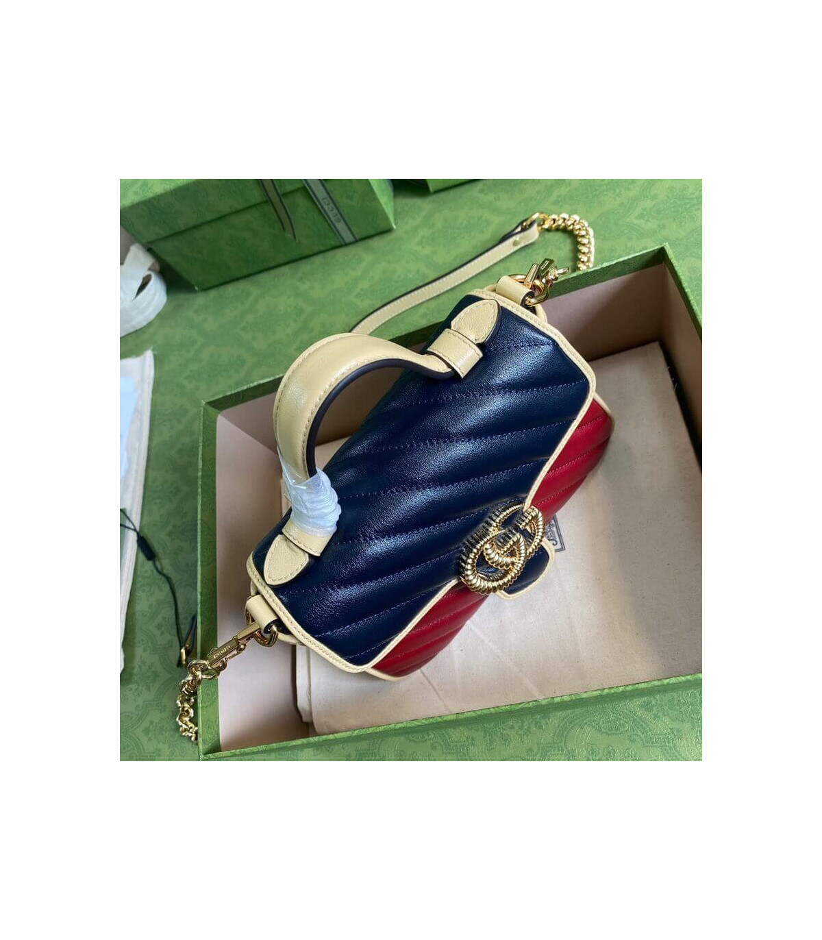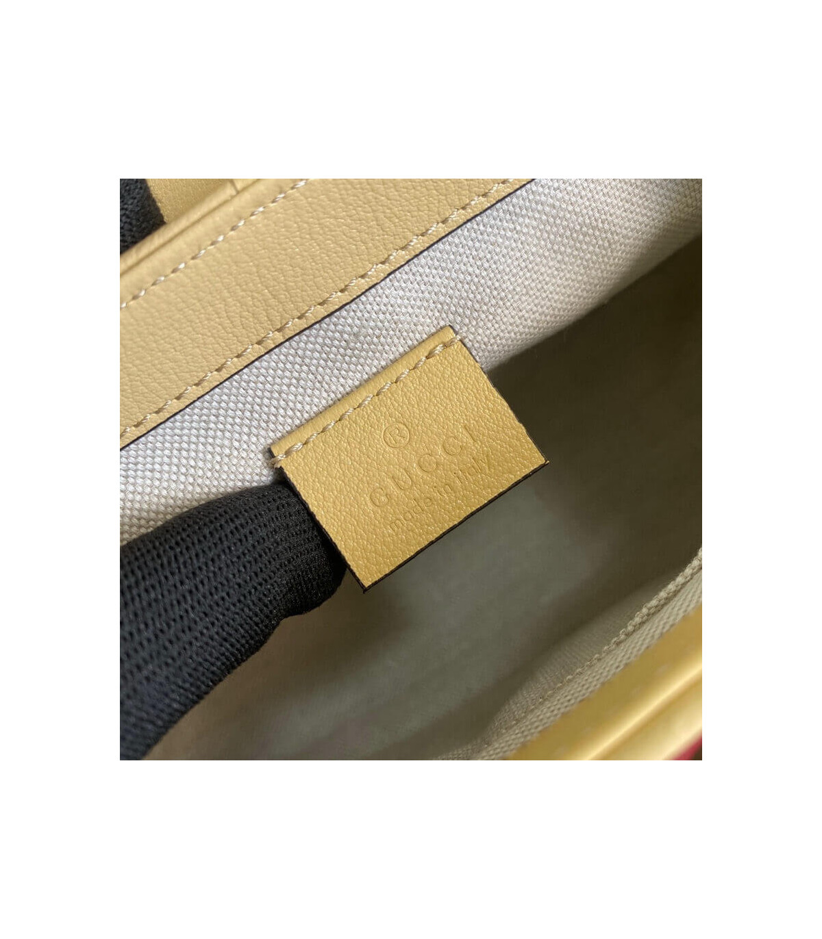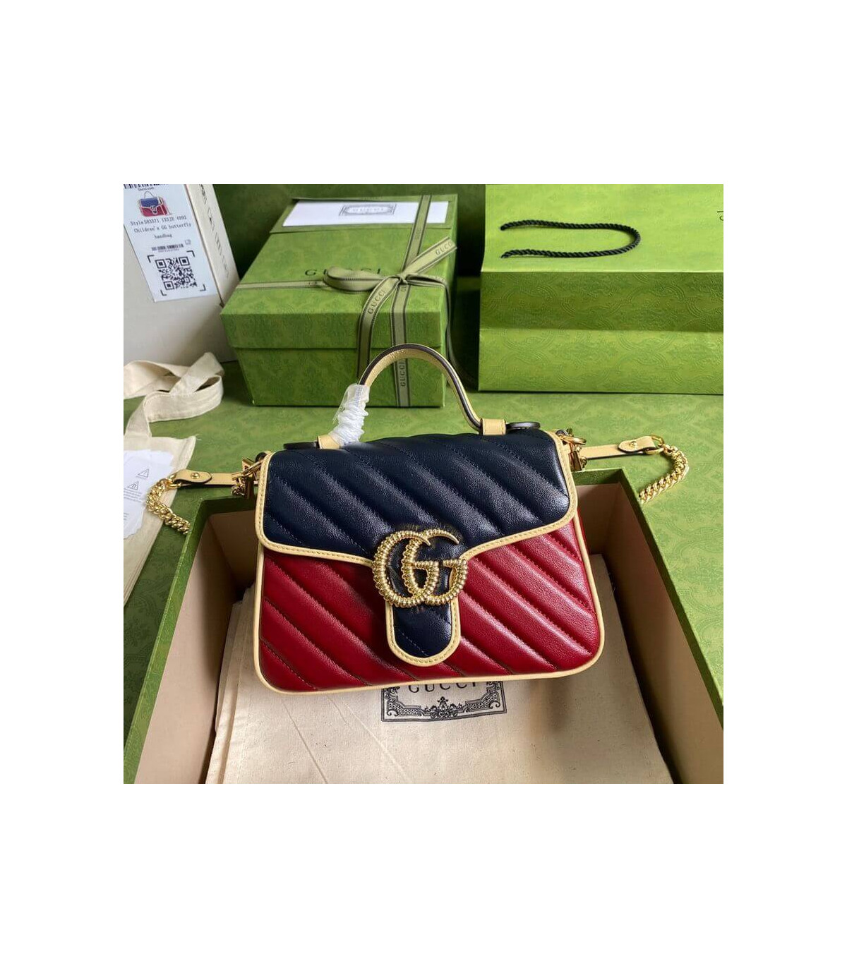 Soft shades appear throughout the latest collections, adding a whimsical feel. The GG Marmont bag is presented in diagonal matelassé quilted leather in soft shades of butter and blue. The mini top handle’s distinct softly structured shape is outlined in black piping, highlighting its flap closure.