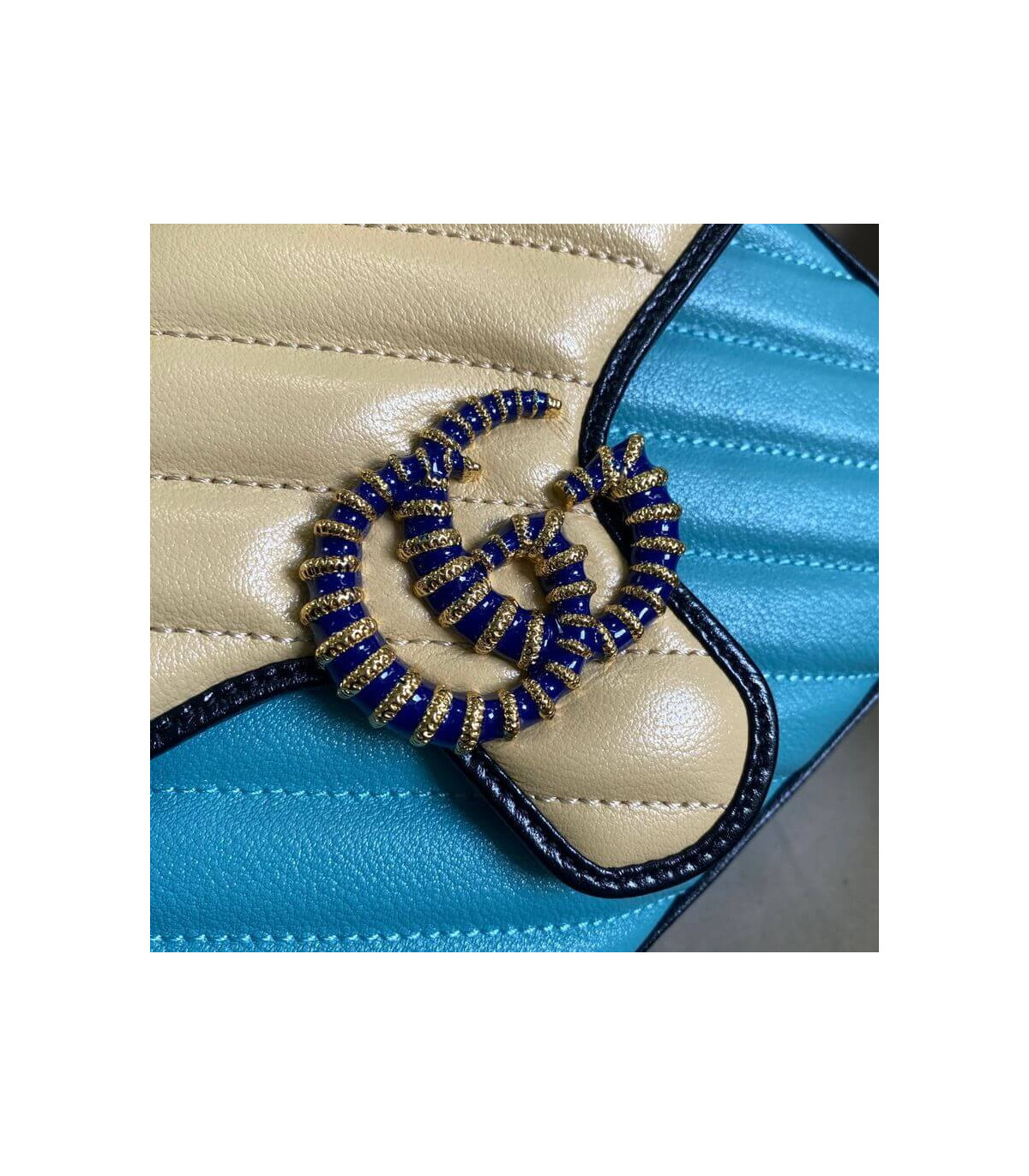 Soft shades appear throughout the latest collections, adding a whimsical feel. The GG Marmont bag is presented in diagonal matelassé quilted leather in soft shades of butter and blue. The mini top handle’s distinct softly structured shape is outlined in black piping, highlighting its flap closure.