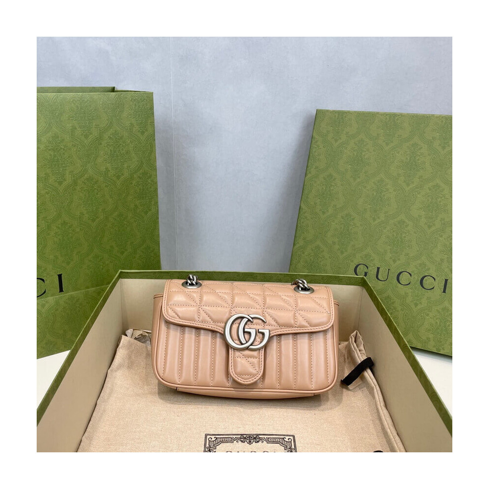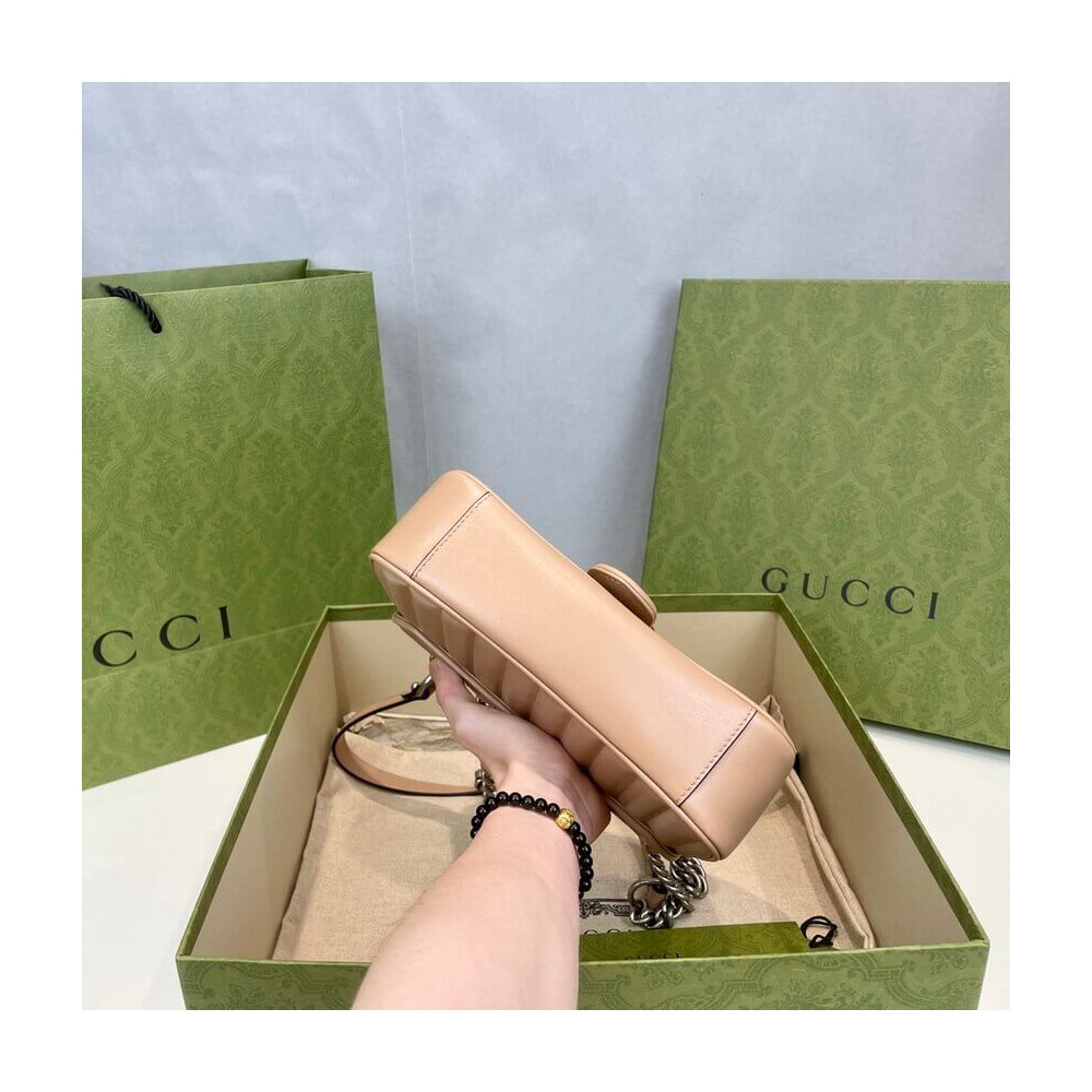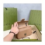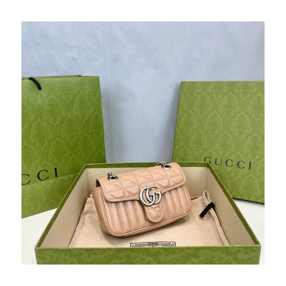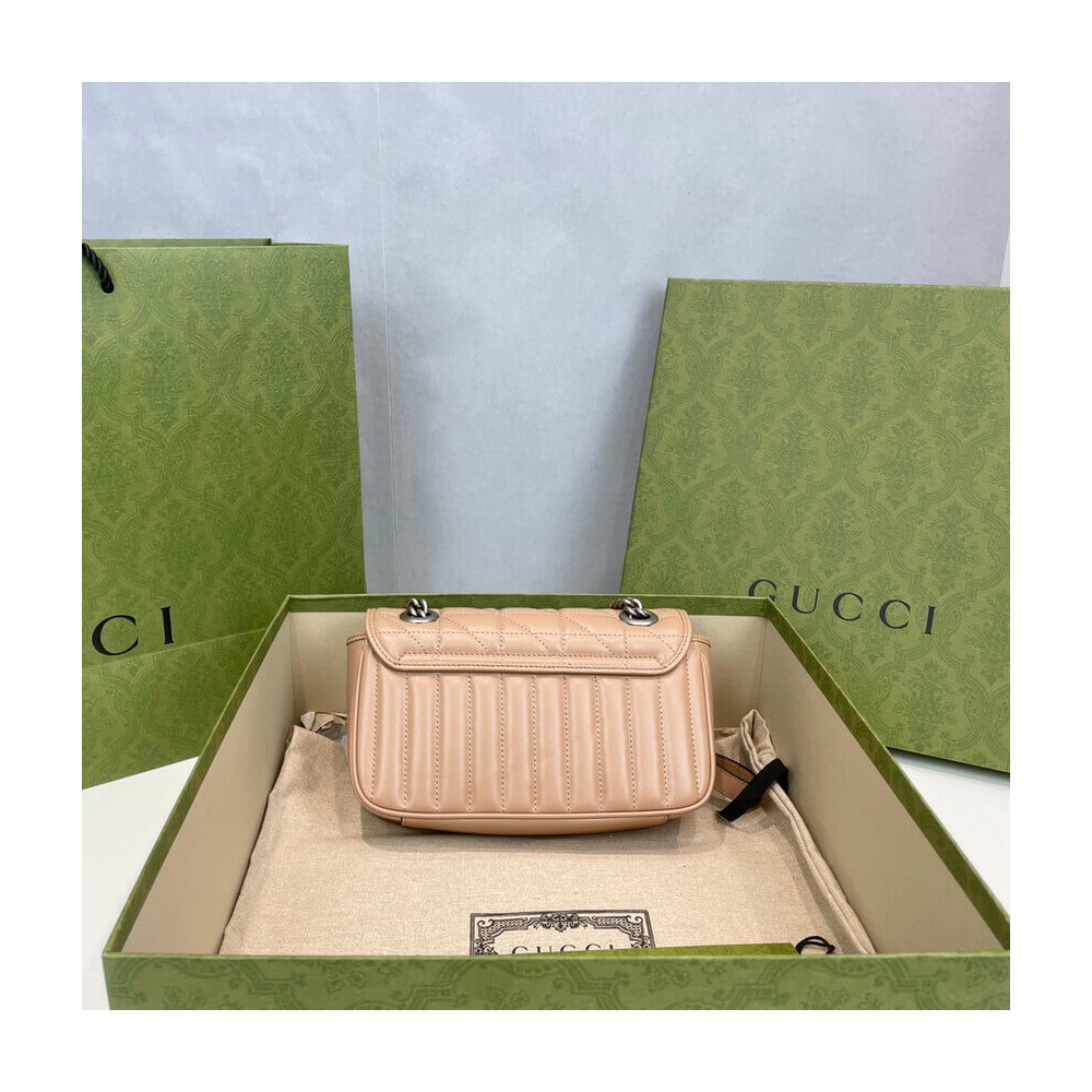 The Gucci Aria collection is an exploration of the House’s most emblematic codes and symbols. A member of the Beloved family, the GG Marmont is synonymous with its matelassé leather and monogram hardware. Here, the mini shoulder bag is reimagined with a new geometric take on its signature finish that combines vertical and diagonal motifs.