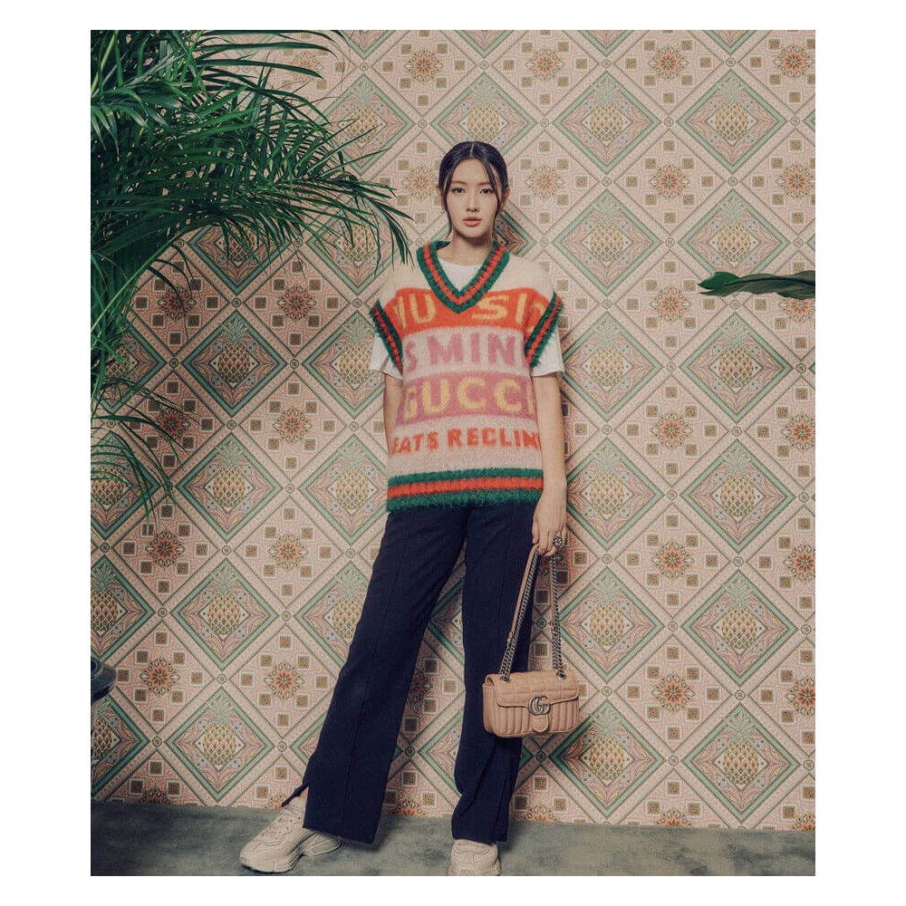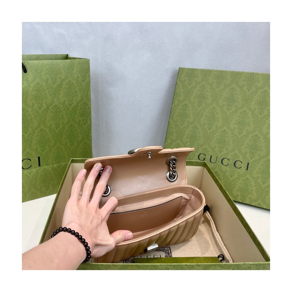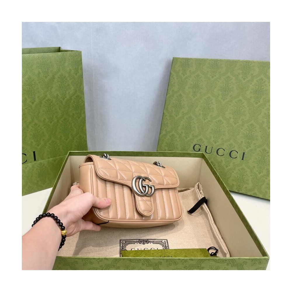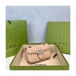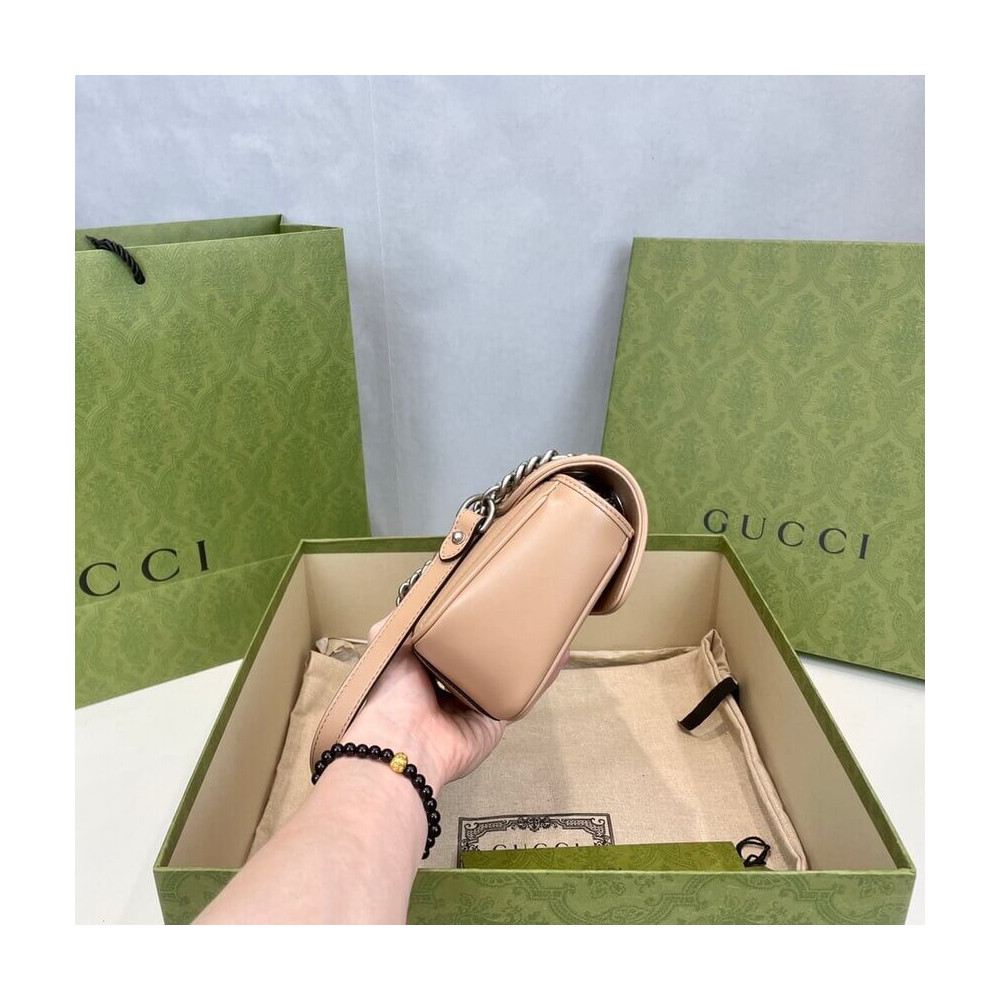 The Gucci Aria collection is an exploration of the House’s most emblematic codes and symbols. A member of the Beloved family, the GG Marmont is synonymous with its matelassé leather and monogram hardware. Here, the mini shoulder bag is reimagined with a new geometric take on its signature finish that combines vertical and diagonal motifs.
