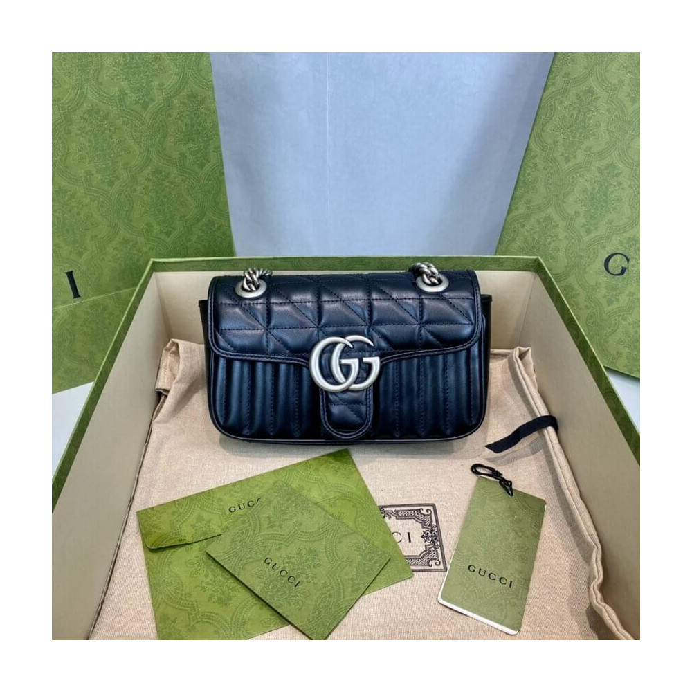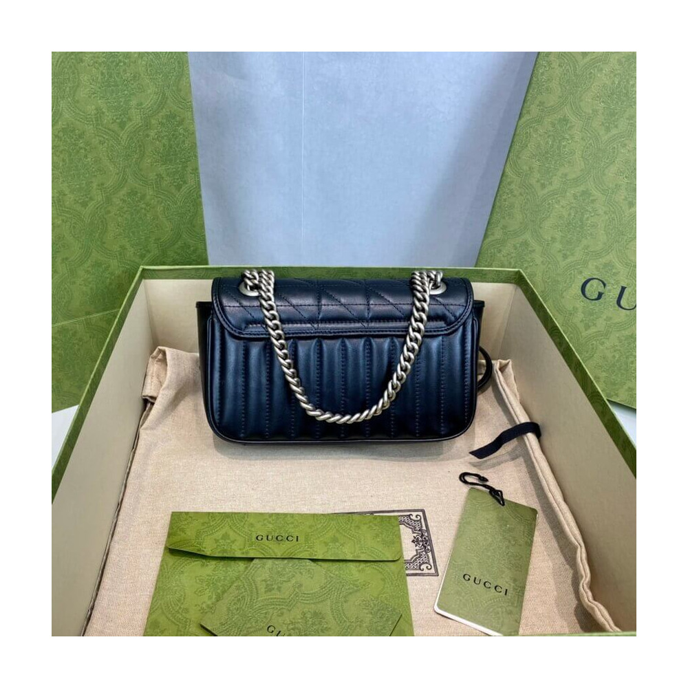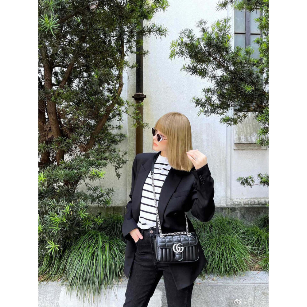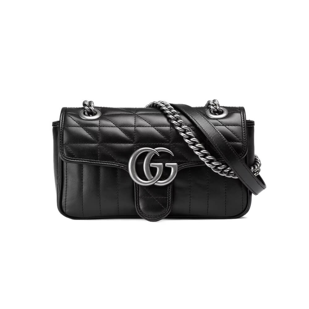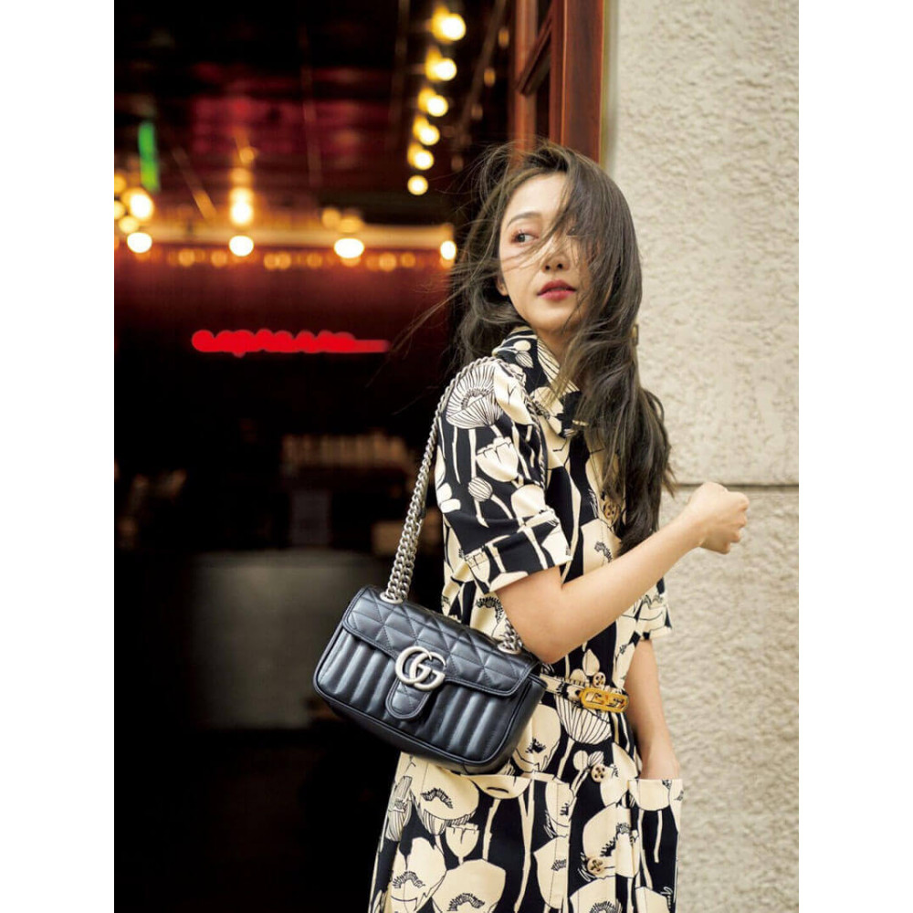 The Gucci Aria collection is an exploration of the House’s most emblematic codes and symbols. A member of the Beloved family, the GG Marmont is synonymous with its matelassé leather and monogram hardware. Here, the mini shoulder bag is reimagined with a new geometric take on its signature finish that combines vertical and diagonal motifs.