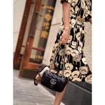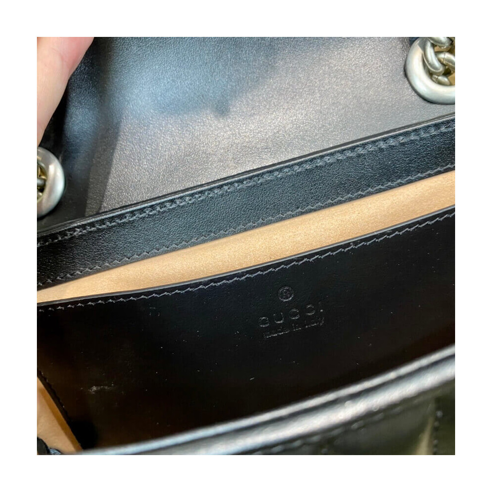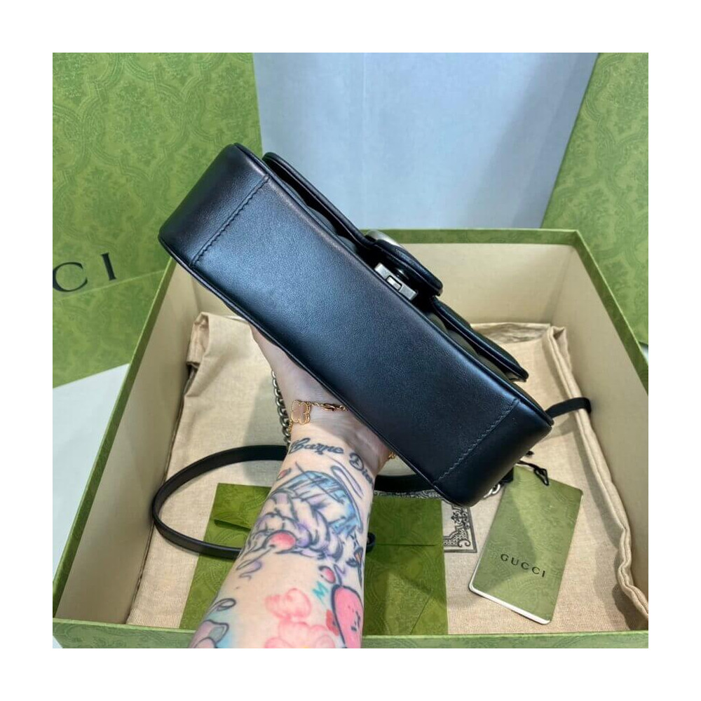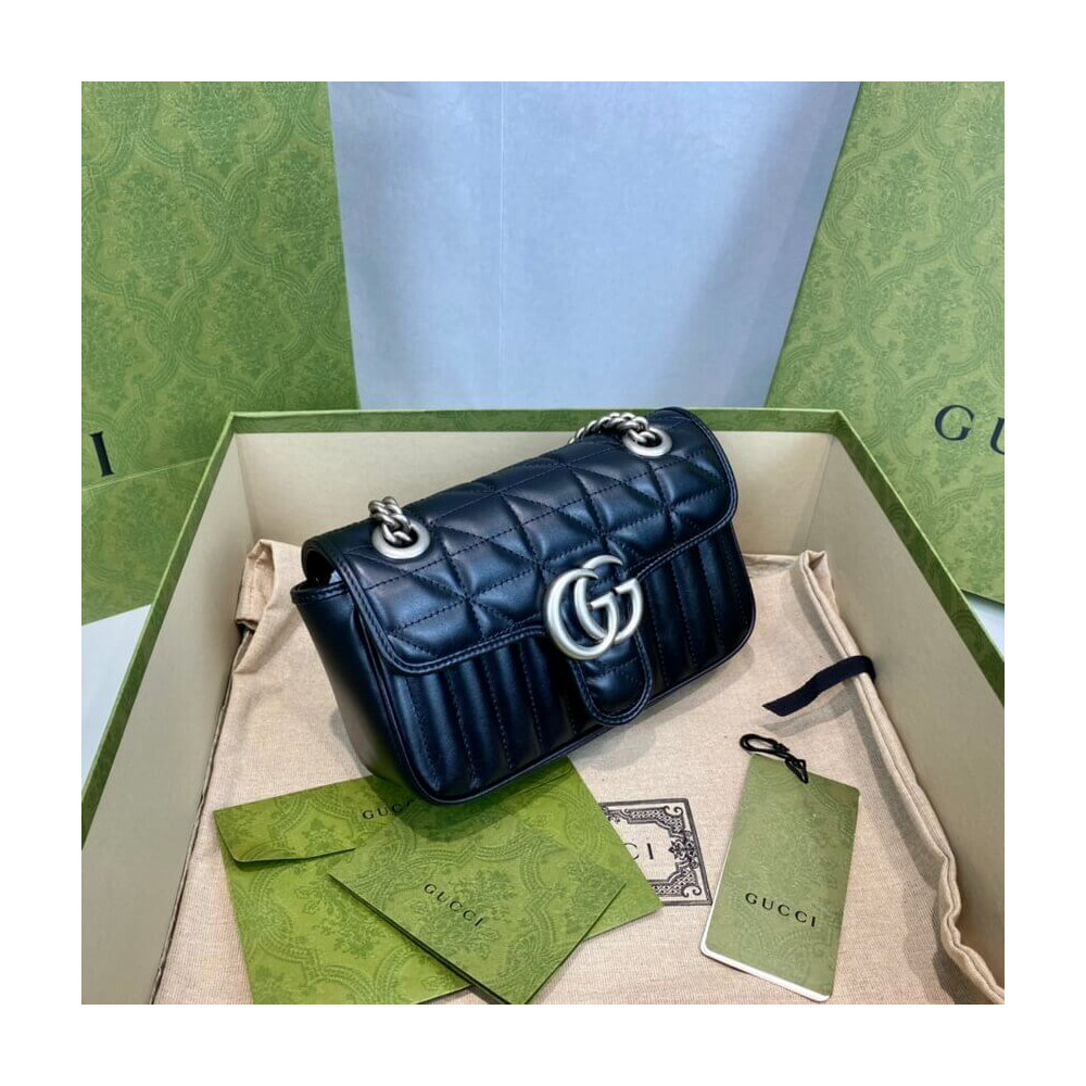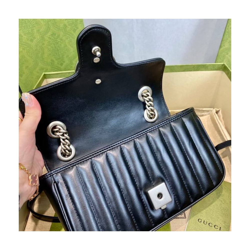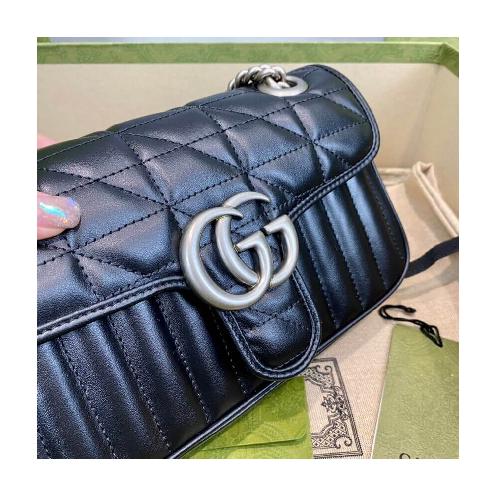 The Gucci Aria collection is an exploration of the House’s most emblematic codes and symbols. A member of the Beloved family, the GG Marmont is synonymous with its matelassé leather and monogram hardware. Here, the mini shoulder bag is reimagined with a new geometric take on its signature finish that combines vertical and diagonal motifs.