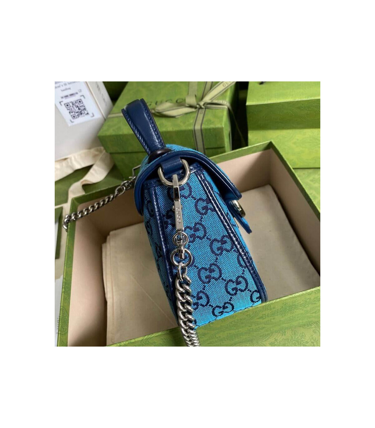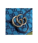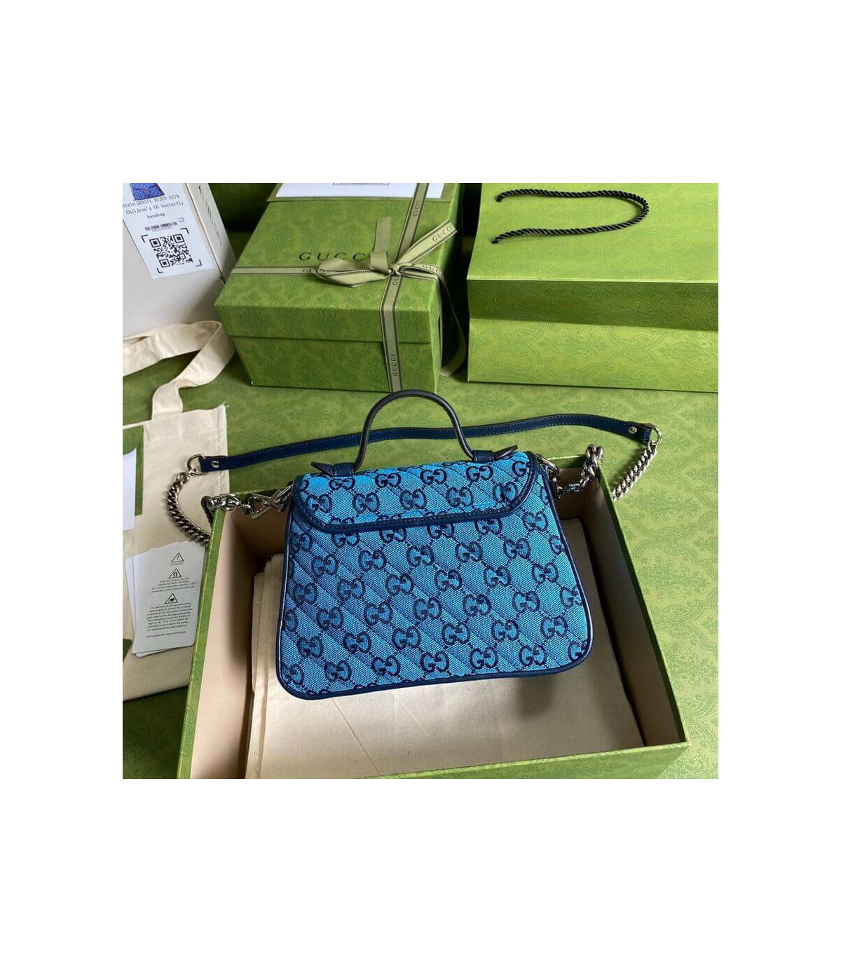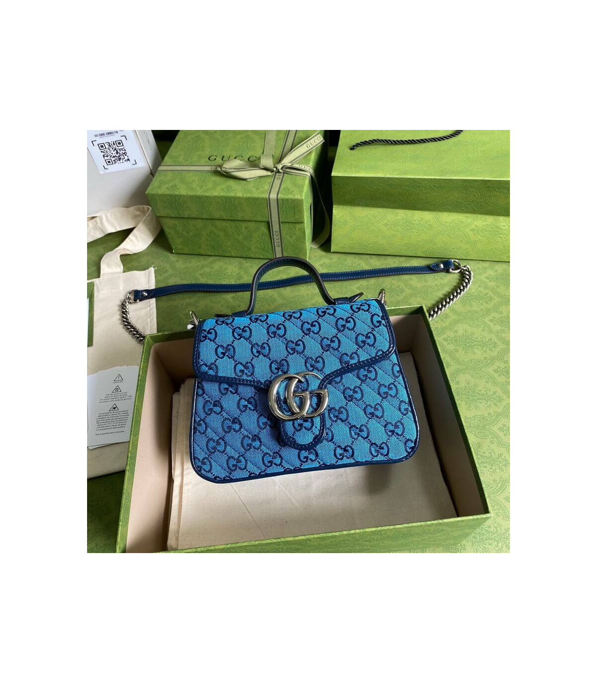 Embracing the new possibilities that lie within variations of the Gucci archives, various pieces throughout the collection provide a new lens through which to view the emblematic GG rhombi motif. Already an evolution of the House logo, it is once again reimagined in a series of bright colors—a theme that has become synonymous with the Creative Director’s vision. This GG Marmont mini top handle bag is part of the GG Multicolor collection.
