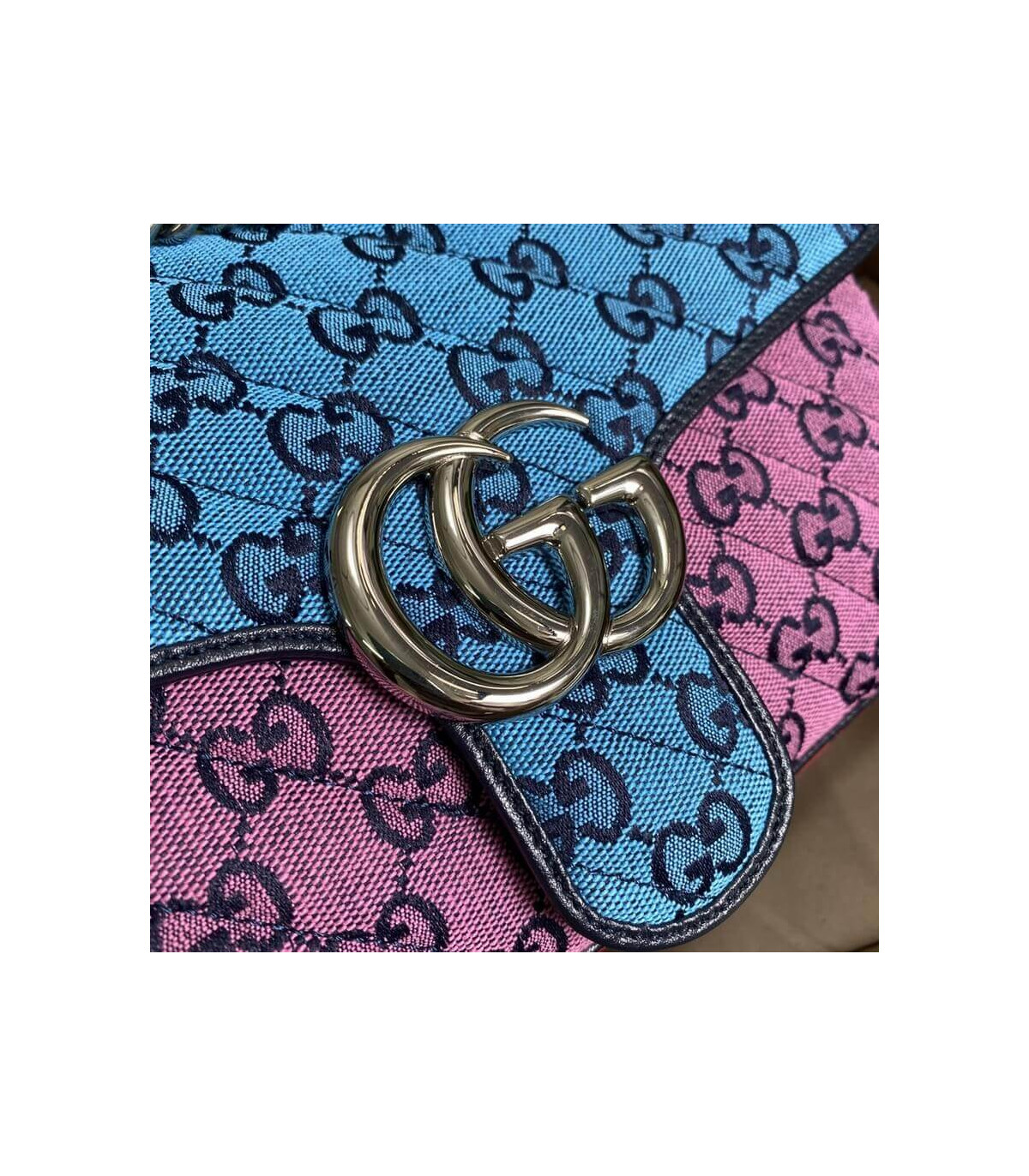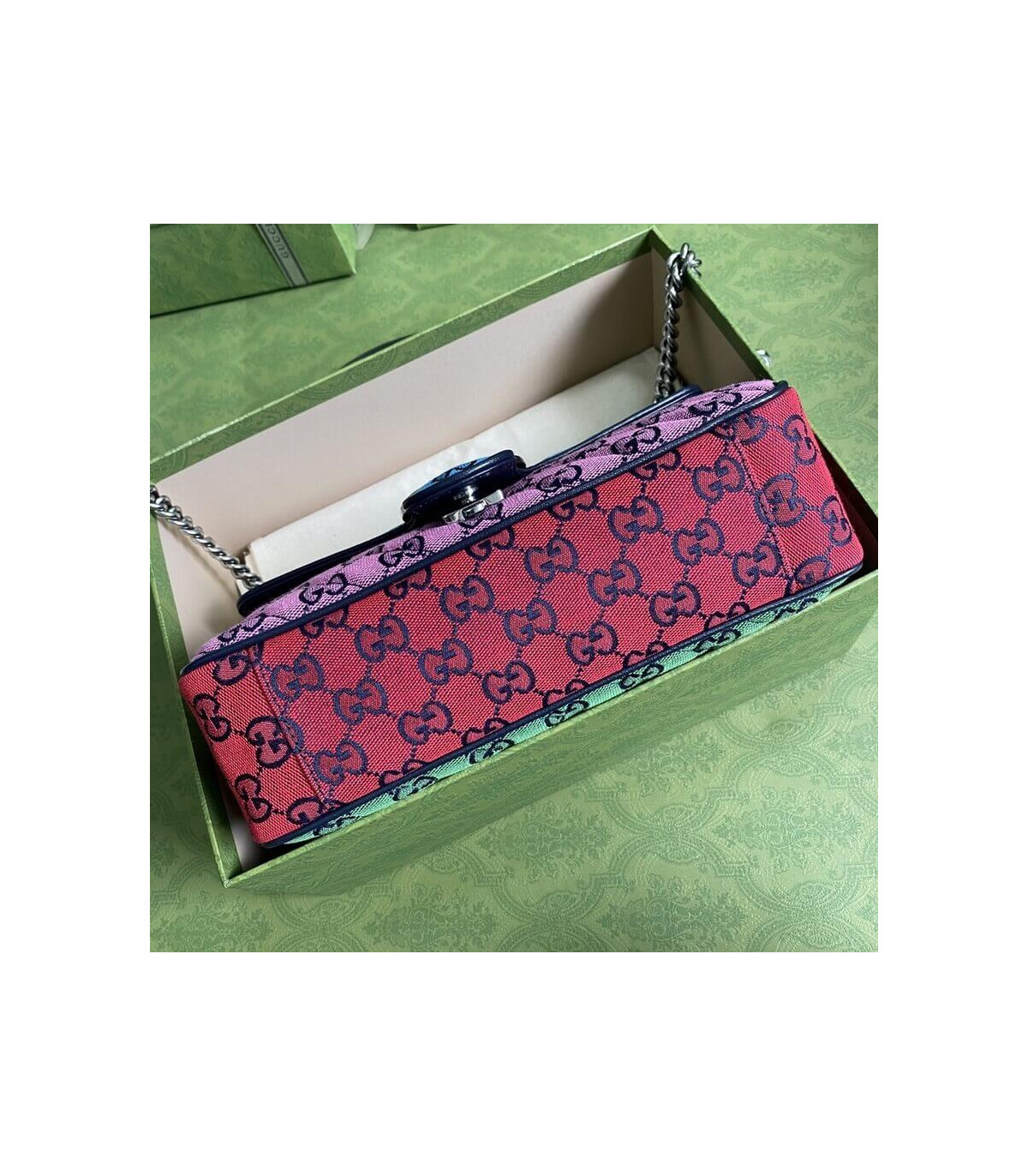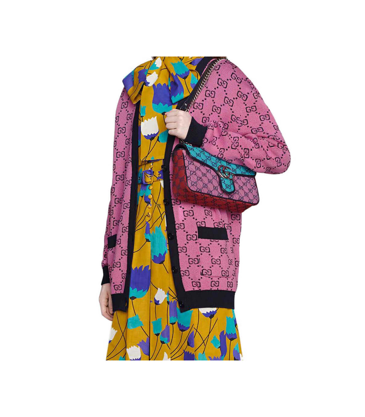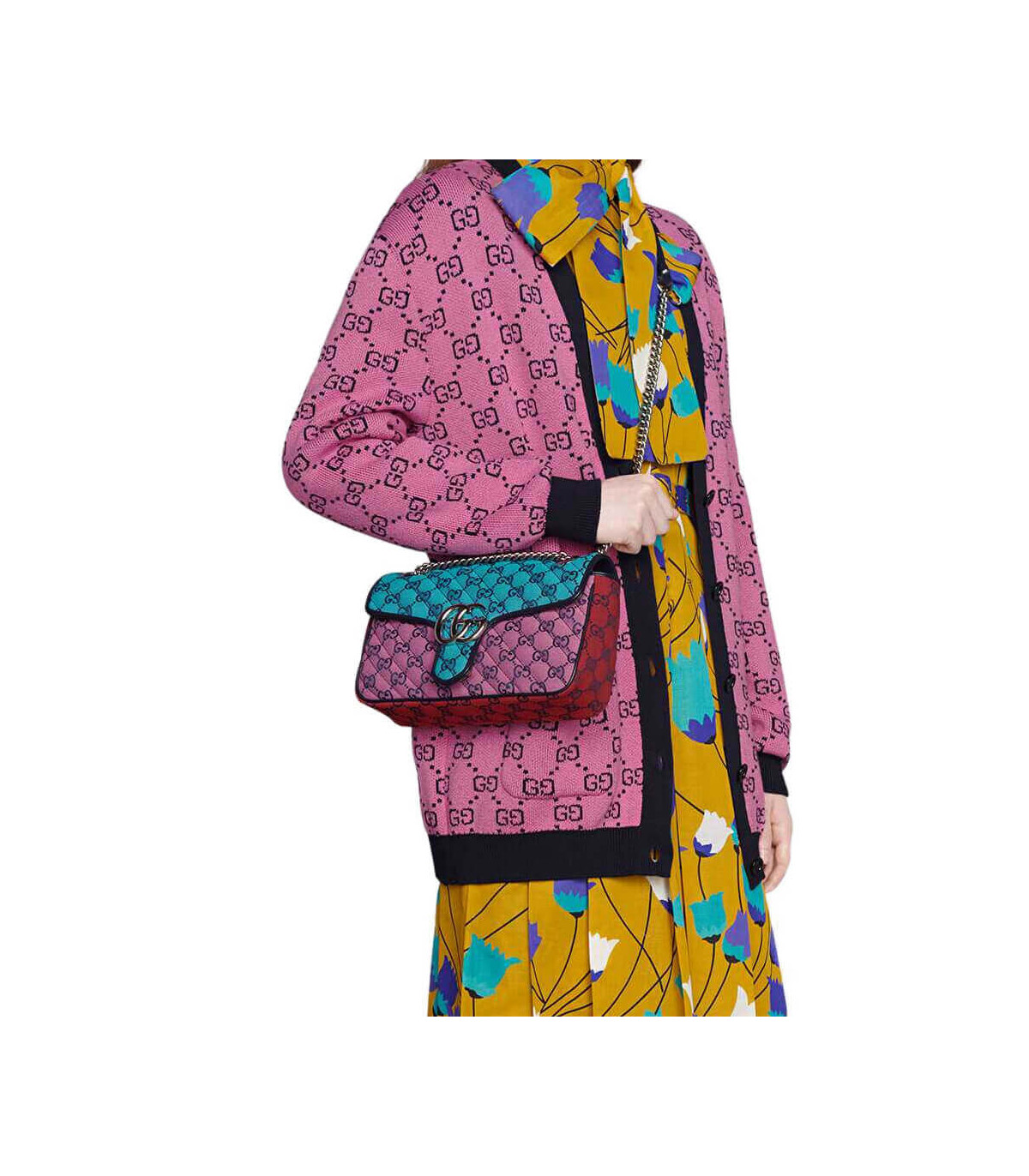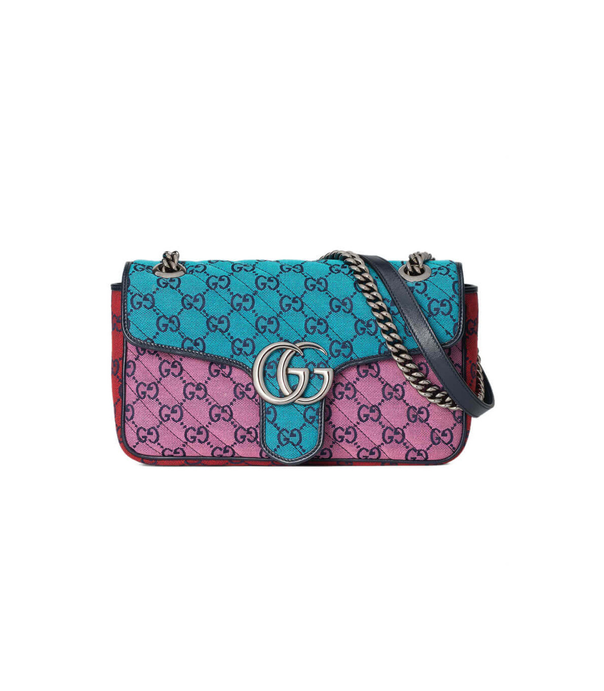 Embracing the new possibilities that lie within variations of the Gucci archives, various pieces throughout the collection provide a new lens through which to view the emblematic GG rhombi motif. Already an evolution of the House logo, it is once again reimagined in a series of bright colours—a theme that has become synonymous with the Creative Director’s vision. This GG Marmont small shoulder bag has an adjustable strap and is part of the GG Multicolour collection.