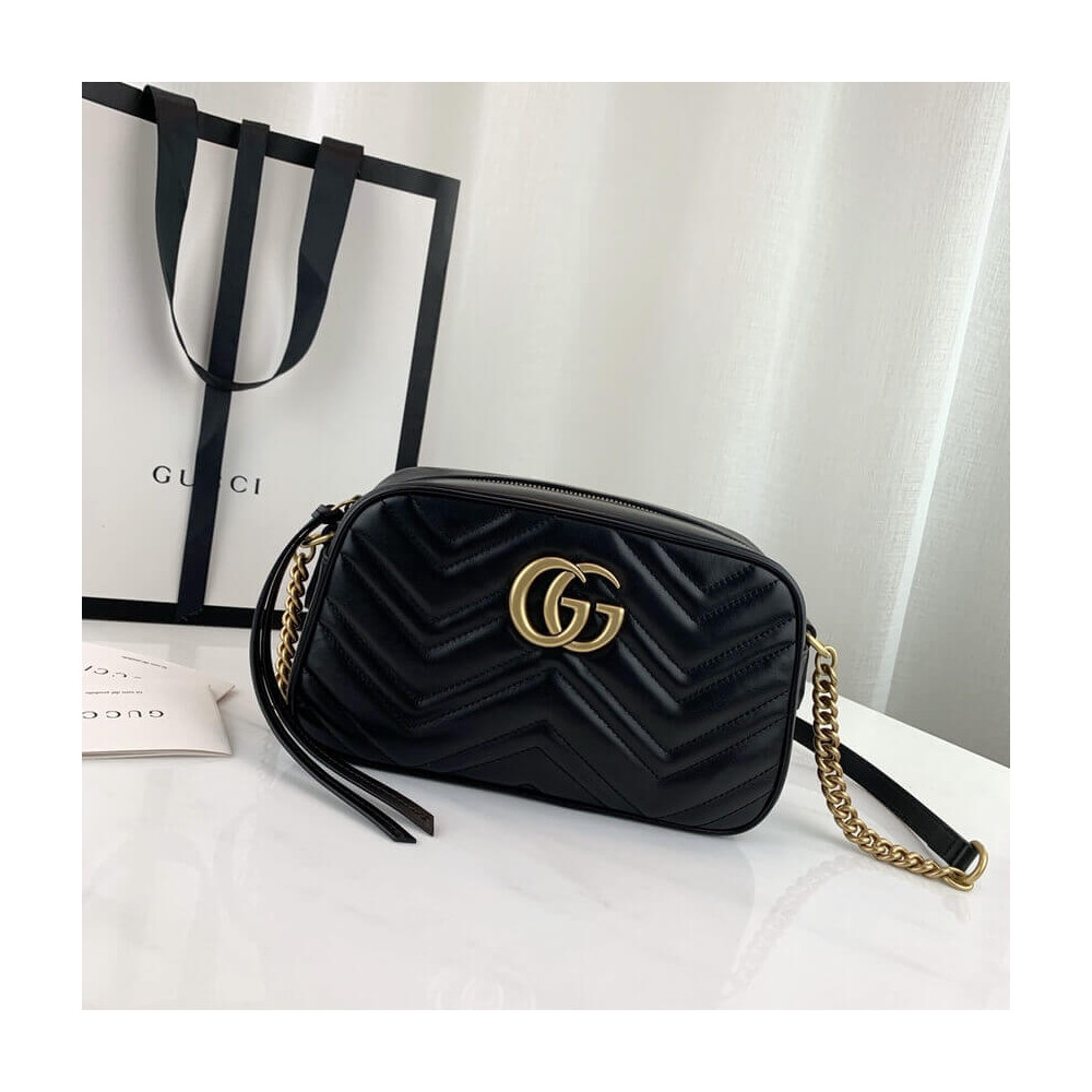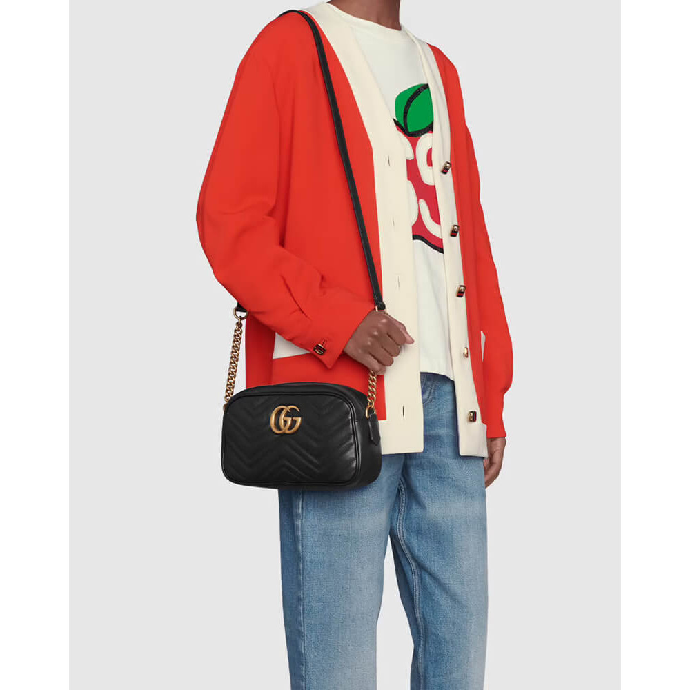The small GG Marmont chain shoulder bag has a softly structured shape and a zip top closure with the Double G hardware. The chain shoulder strap has a leather shoulder detail. Made in matelassé leather with a chevron design and GG on the back.