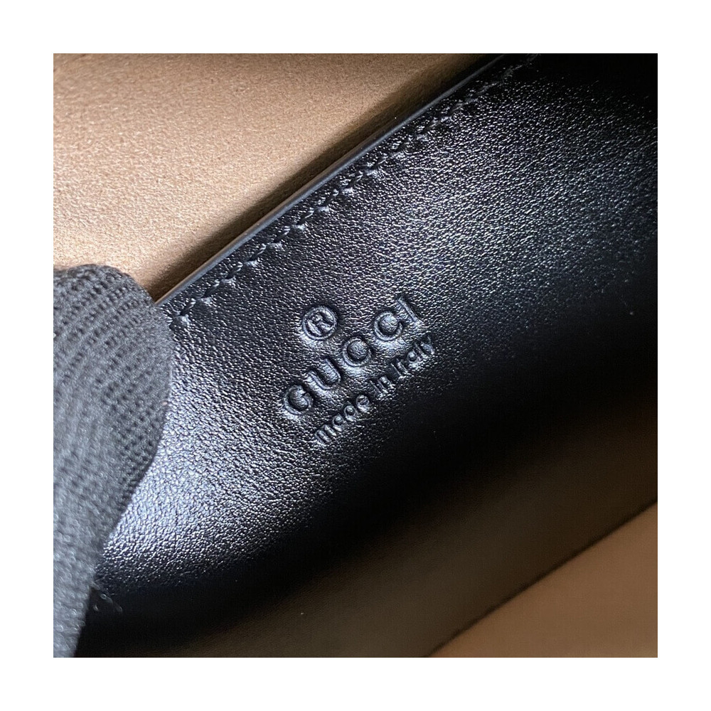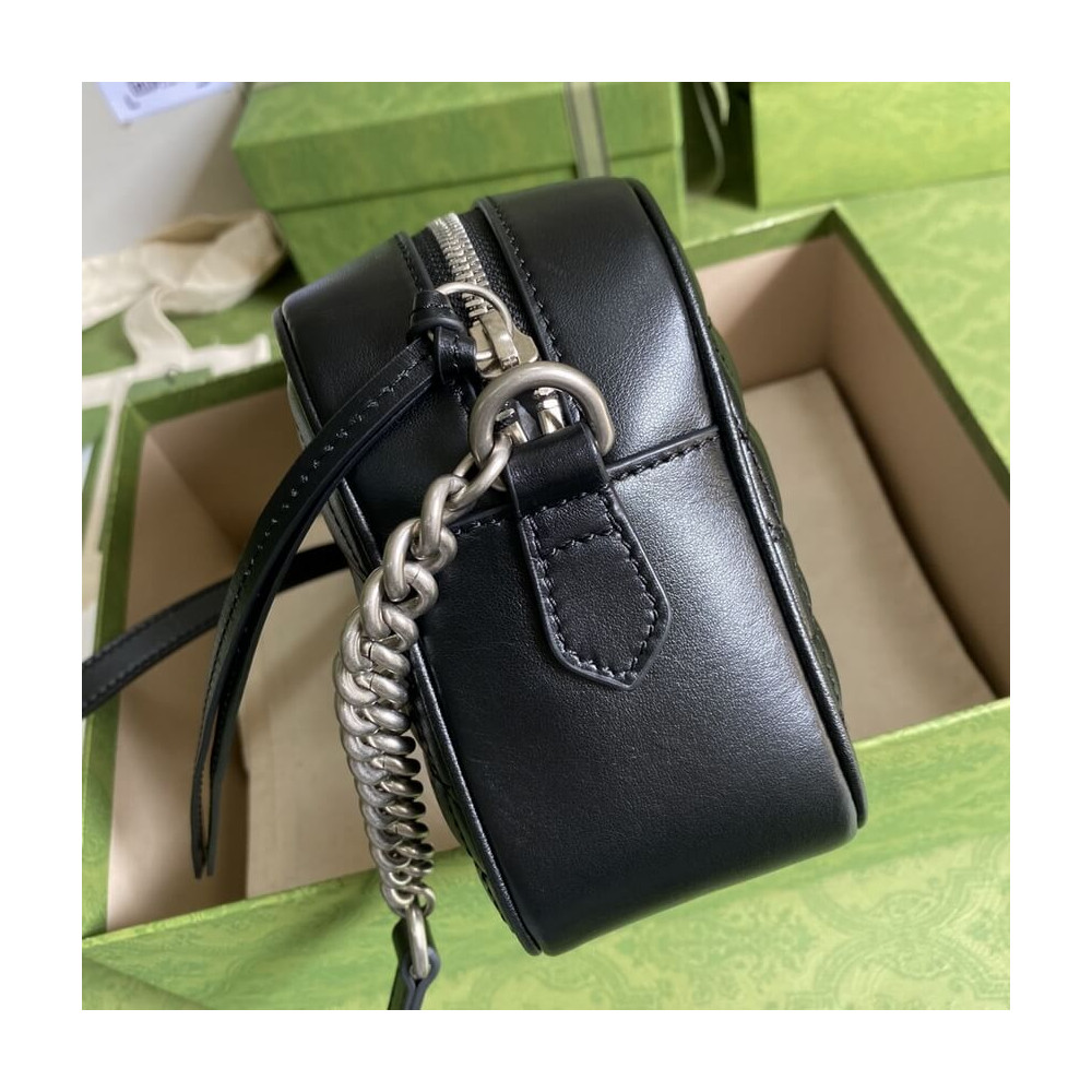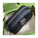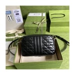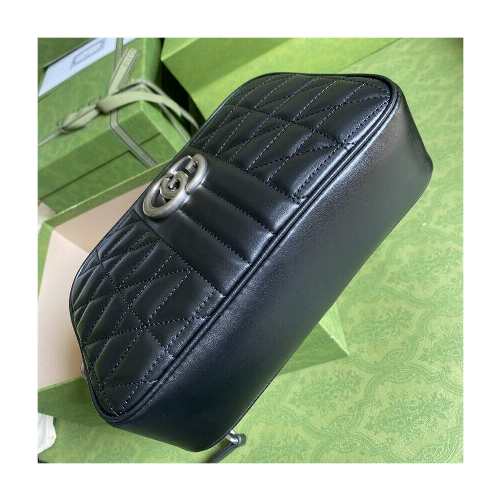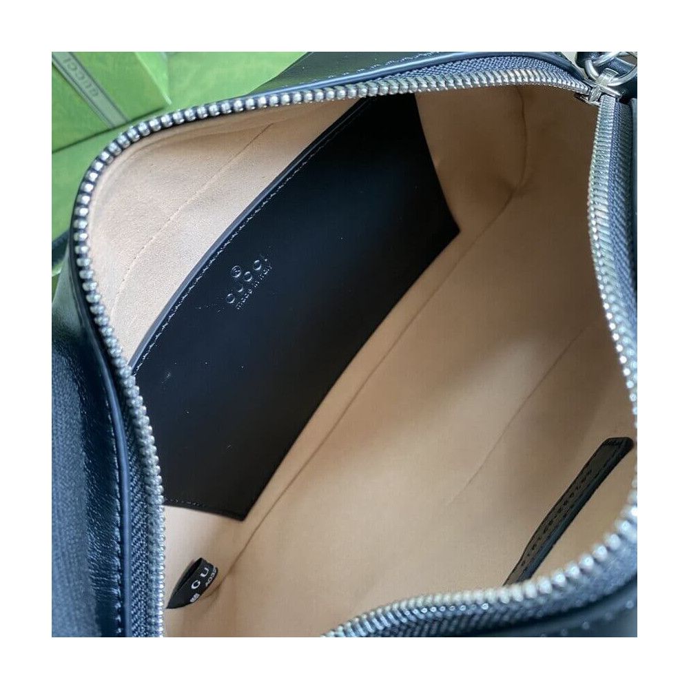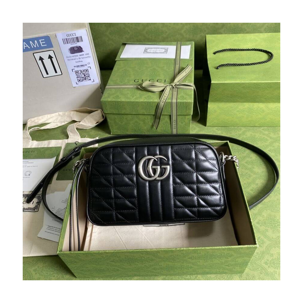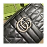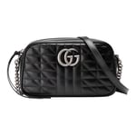 A member of the House’s Beloved lines, the GG Marmont is characterized by the brand’s emblematic monogram hardware and matelassé leather. For The Gucci Aria collection, the style is reimagined with a new geometric approach to the signature material while its Double G hardware is presented with an antique silver-toned finish. The design appears here in the shape of a small shoulder bag in black.