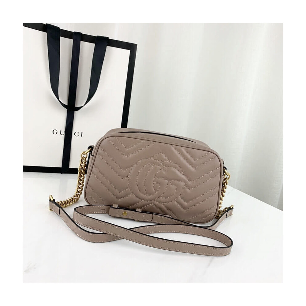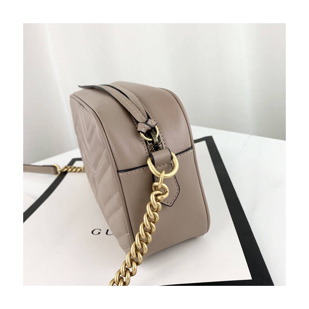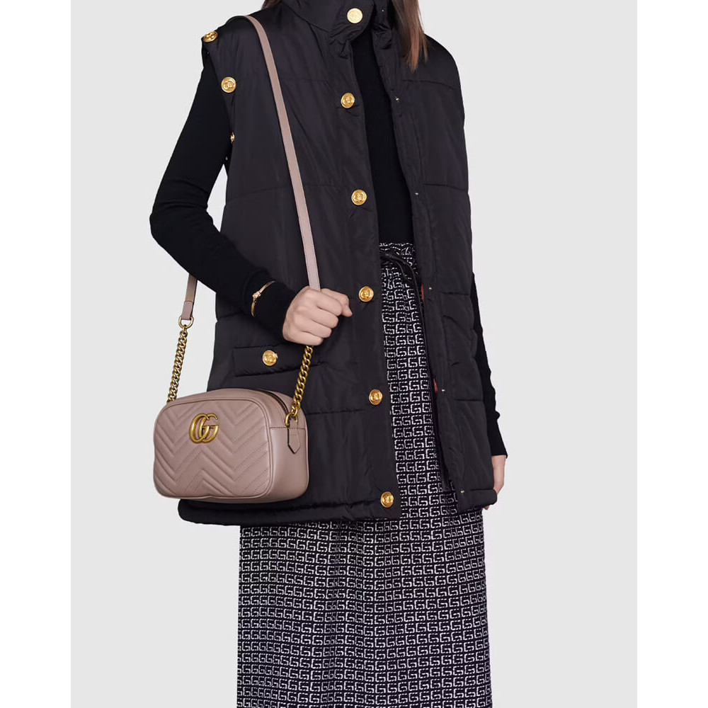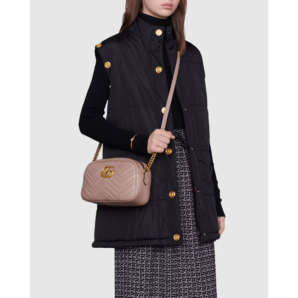 The small GG Marmont chain shoulder bag has a softly structured shape and a zip top closure with the Double G hardware. The chain shoulder strap has a leather shoulder detail. Made in matelassé leather with a chevron design and GG on the back.