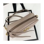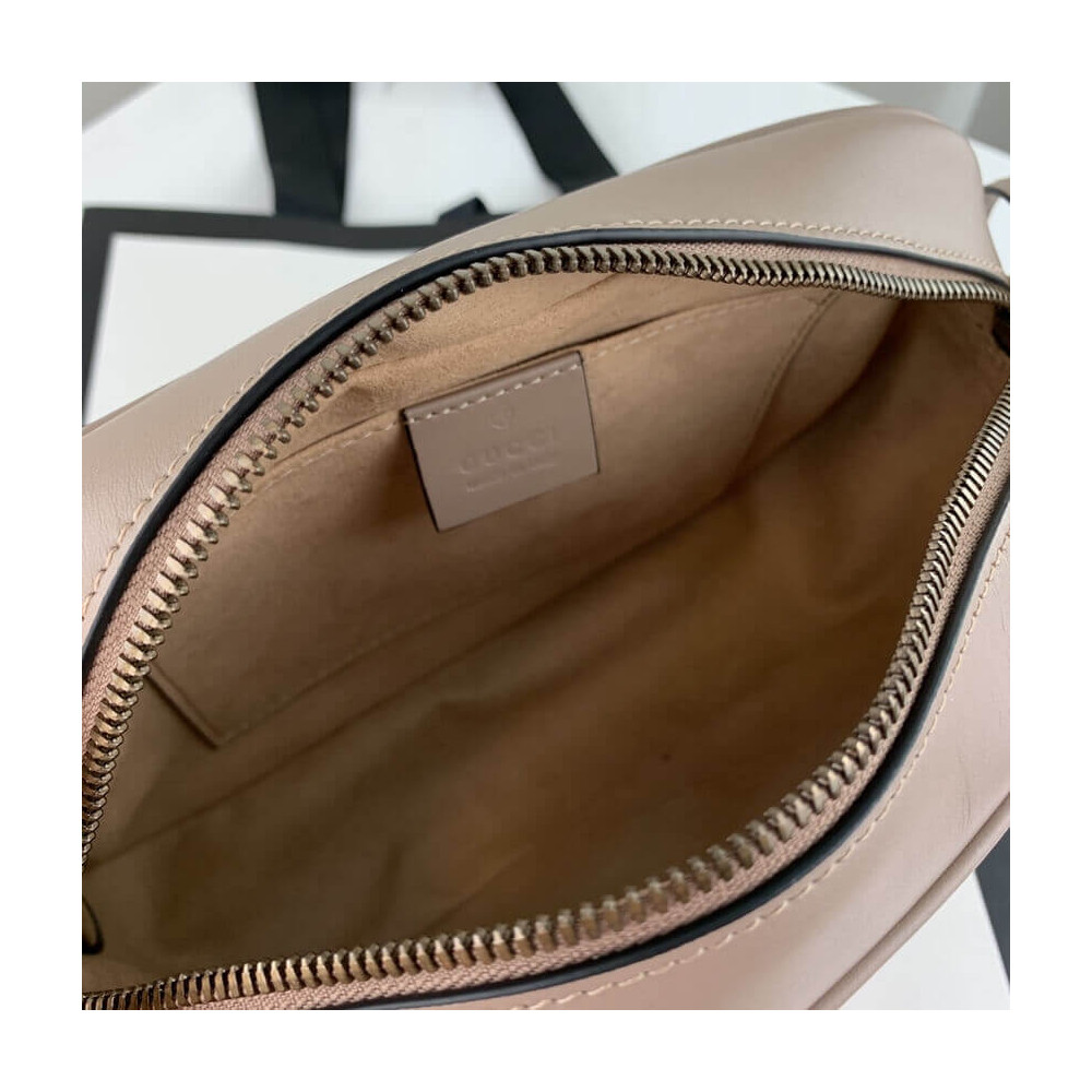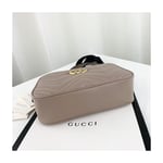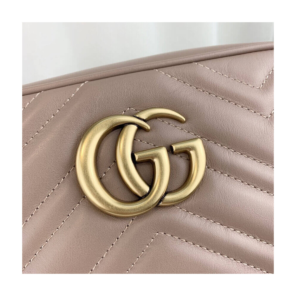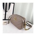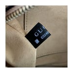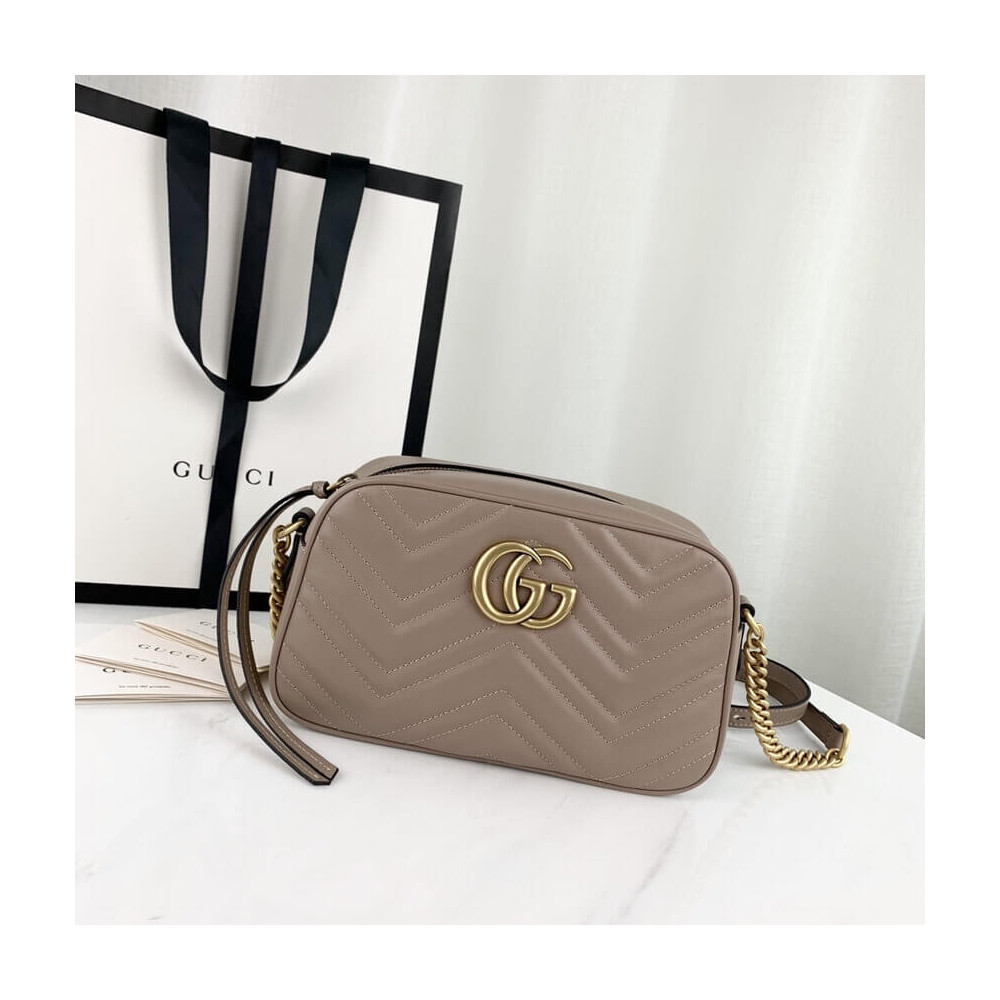 The small GG Marmont chain shoulder bag has a softly structured shape and a zip top closure with the Double G hardware. The chain shoulder strap has a leather shoulder detail. Made in matelassé leather with a chevron design and GG on the back.