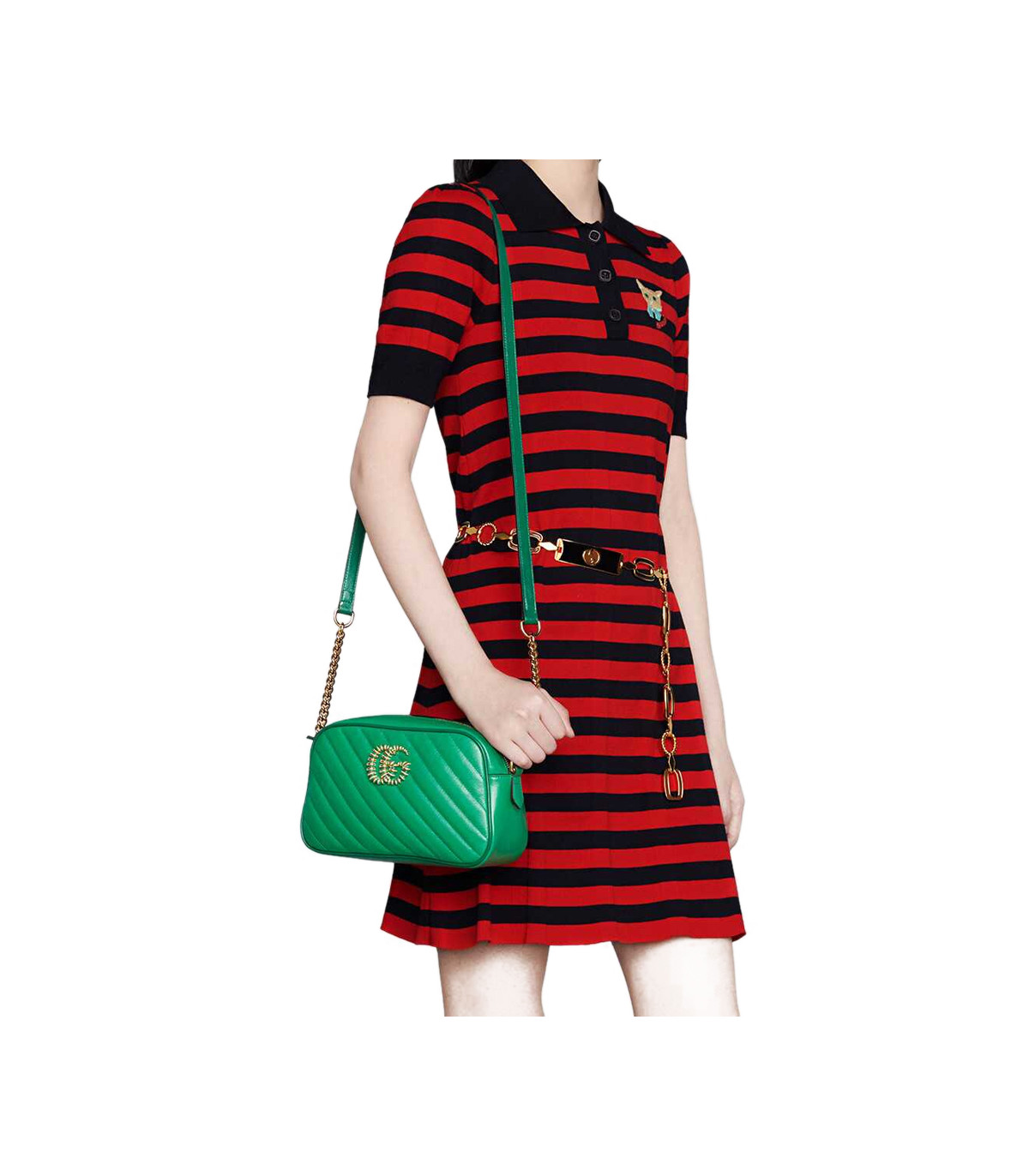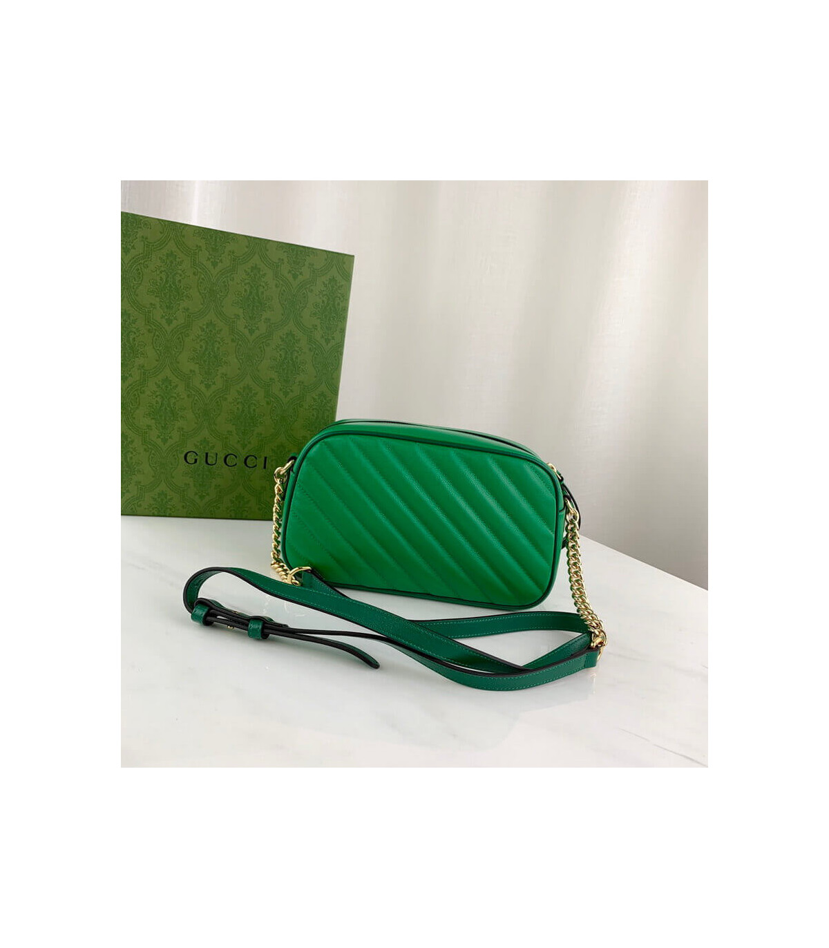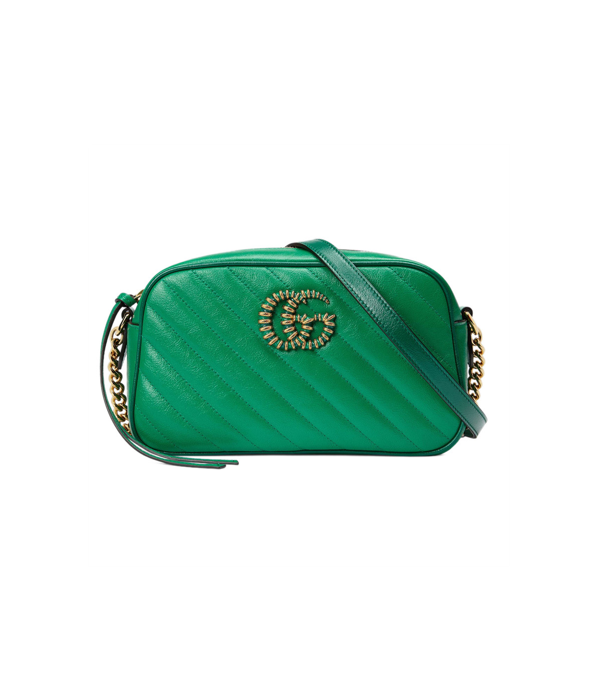 Reminiscent of precious emeralds, the GG Marmont bag is introduced in complementary shades of green leather. The Double G hardware, a signature feature of the line, is enriched with colorful enamel. The rectangular style is completed by a chain shoulder strap, allowing the accessory to be carried crossbody or on the shoulder.