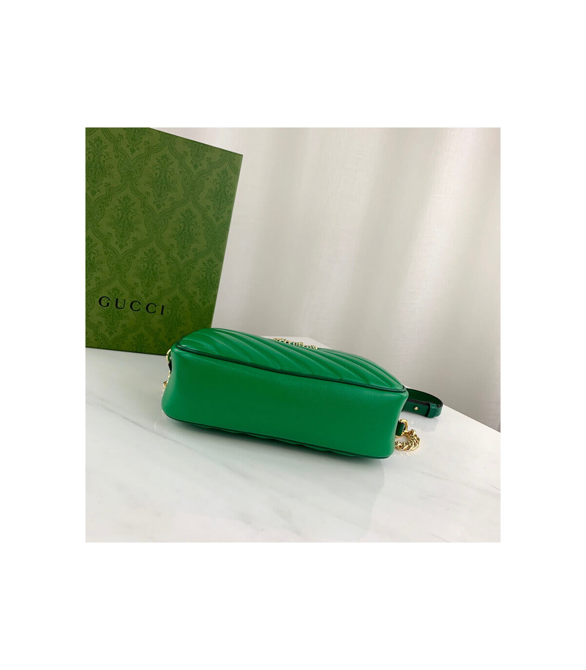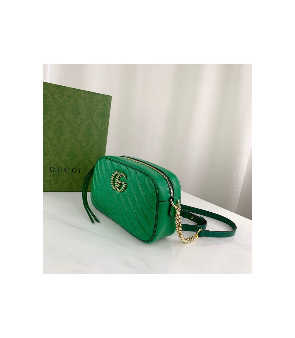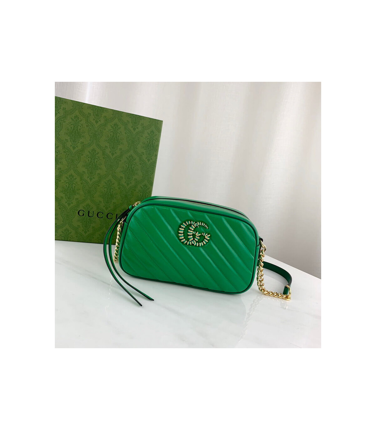 Reminiscent of precious emeralds, the GG Marmont bag is introduced in complementary shades of green leather. The Double G hardware, a signature feature of the line, is enriched with colorful enamel. The rectangular style is completed by a chain shoulder strap, allowing the accessory to be carried crossbody or on the shoulder.