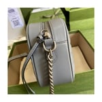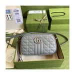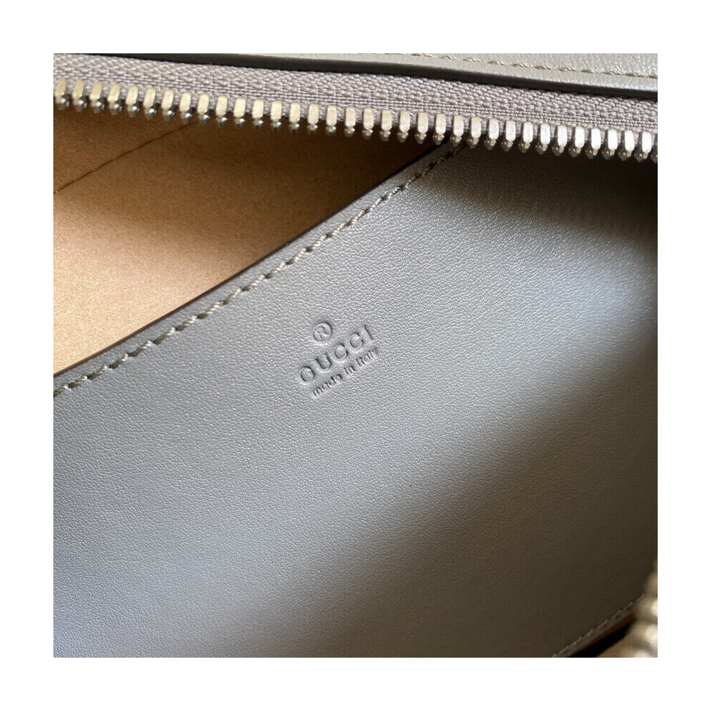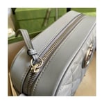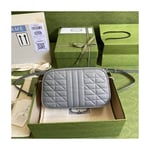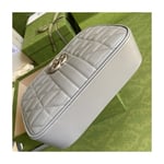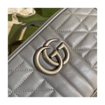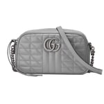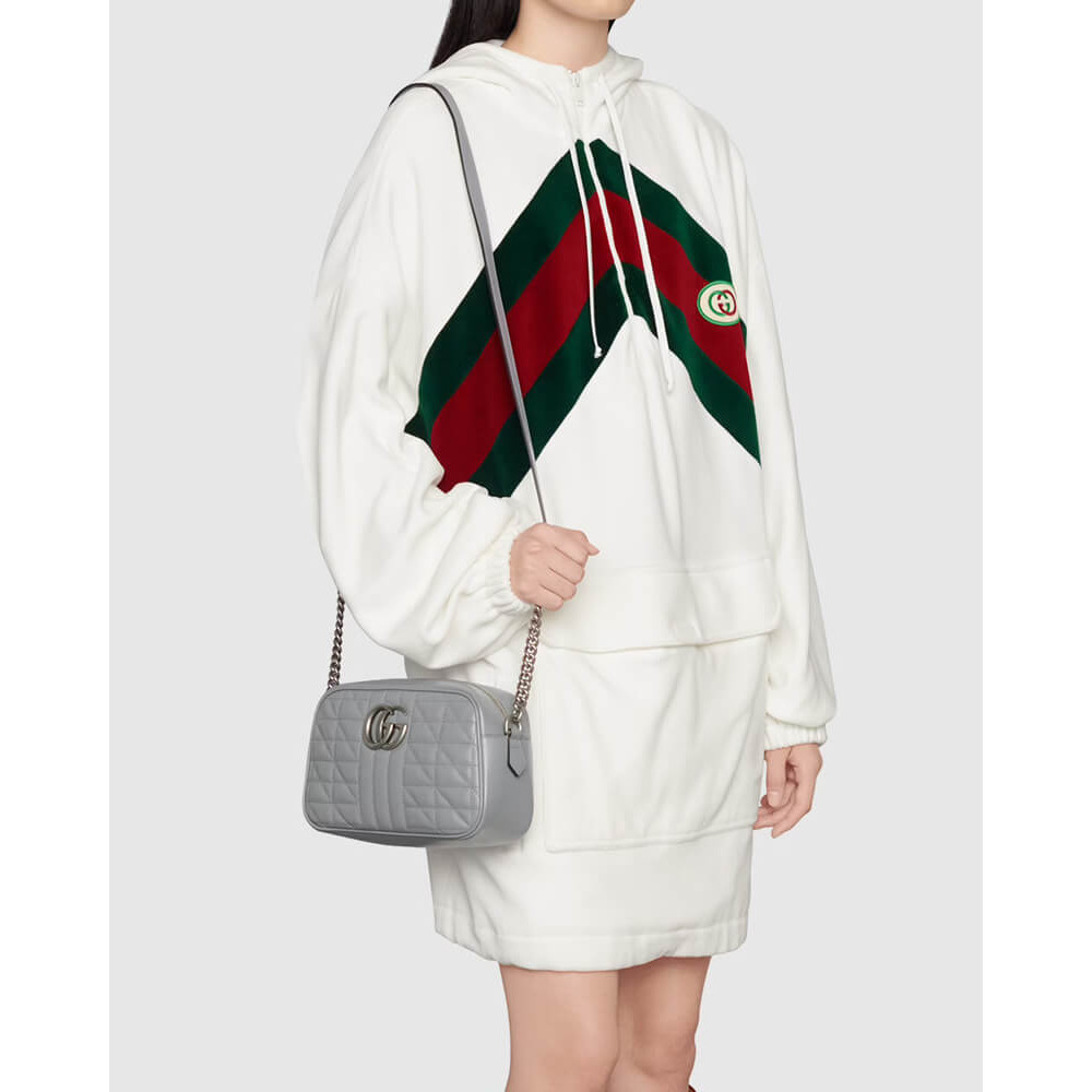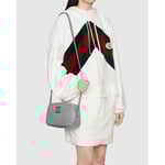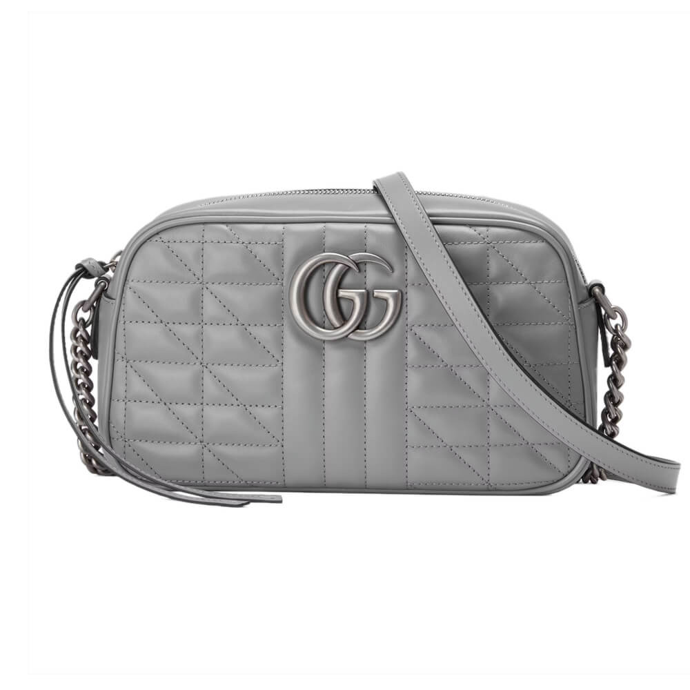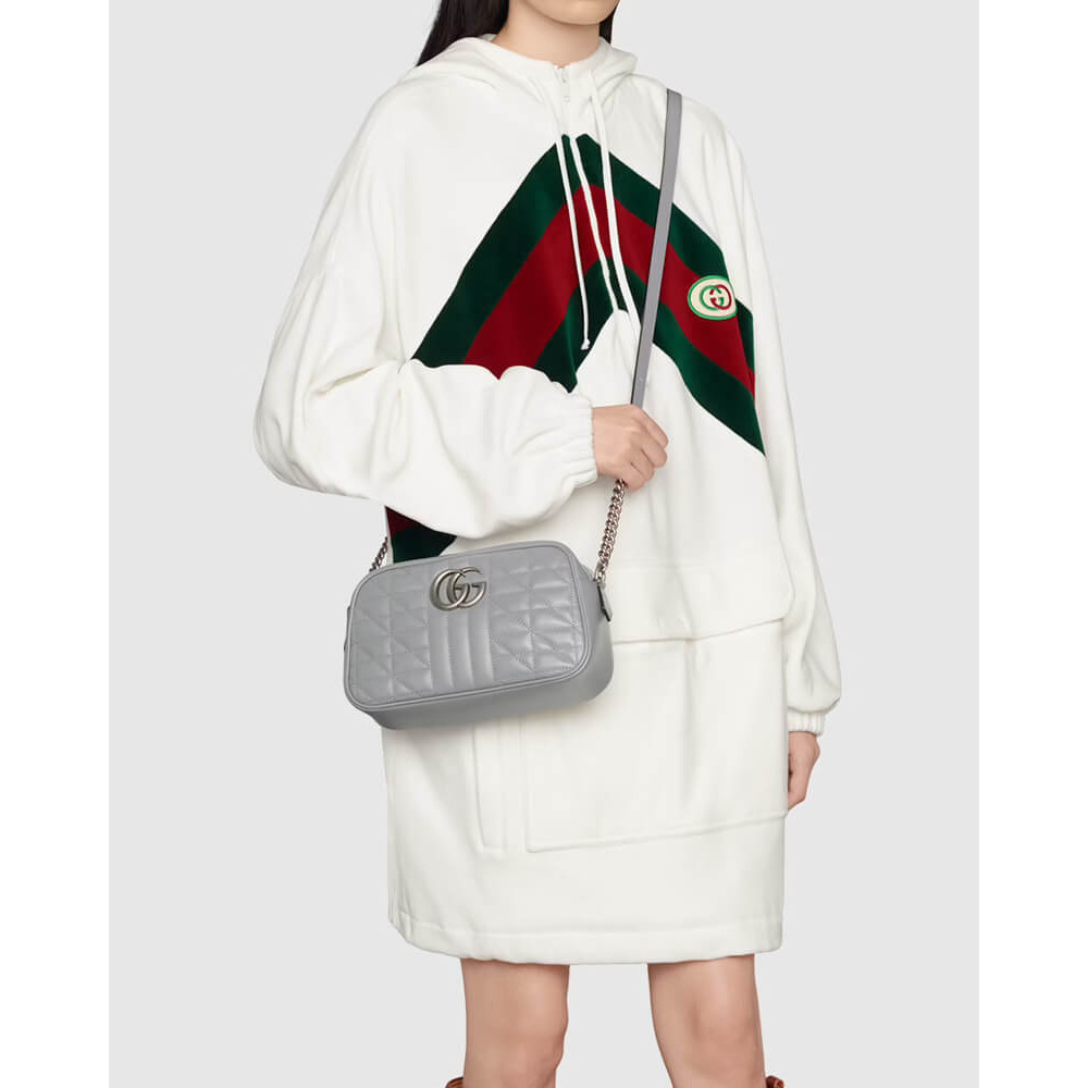 A member of the House’s Beloved lines, the GG Marmont is characterized by the brand’s emblematic monogram hardware and matelassé leather. For The Gucci Aria collection, the style is reimagined with a new geometric approach to the signature material while its Double G hardware is presented with an antique silver-toned finish. The design appears here in the shape of a small shoulder bag in black.