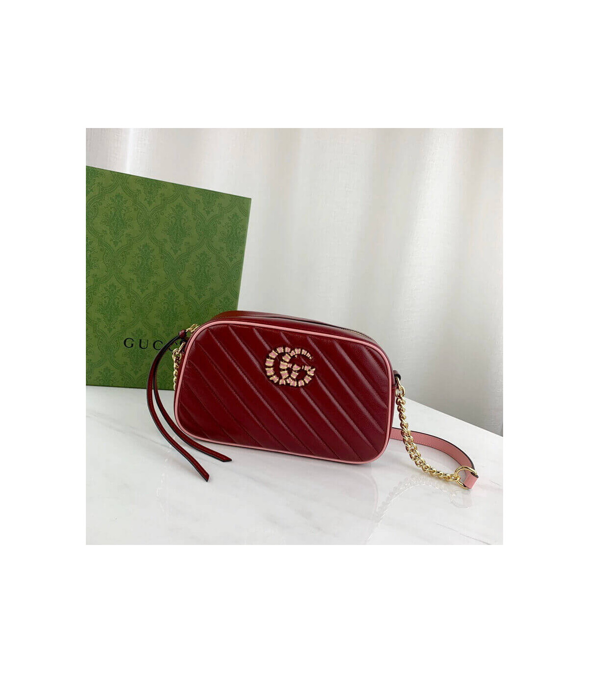 Reminiscent of precious emeralds, the GG Marmont bag is introduced in complementary shades of green leather. The Double G hardware, a signature feature of the line, is enriched with colorful enamel. The rectangular style is completed by a chain shoulder strap, allowing the accessory to be carried crossbody or on the shoulder.