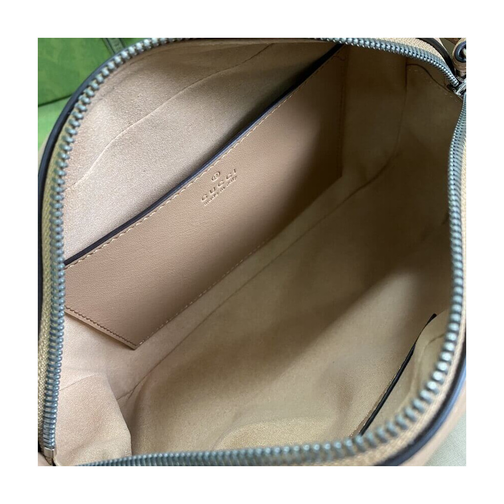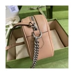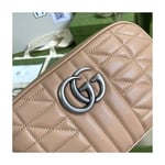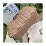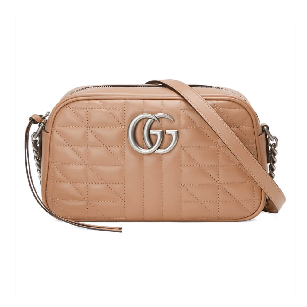 A member of the House’s Beloved lines, the GG Marmont is characterized by the brand’s emblematic monogram hardware and matelassé leather. For The Gucci Aria collection, the style is reimagined with a new geometric approach to the signature material while its Double G hardware is presented with an antique silver-toned finish. The design appears here in the shape of a small shoulder bag in black.