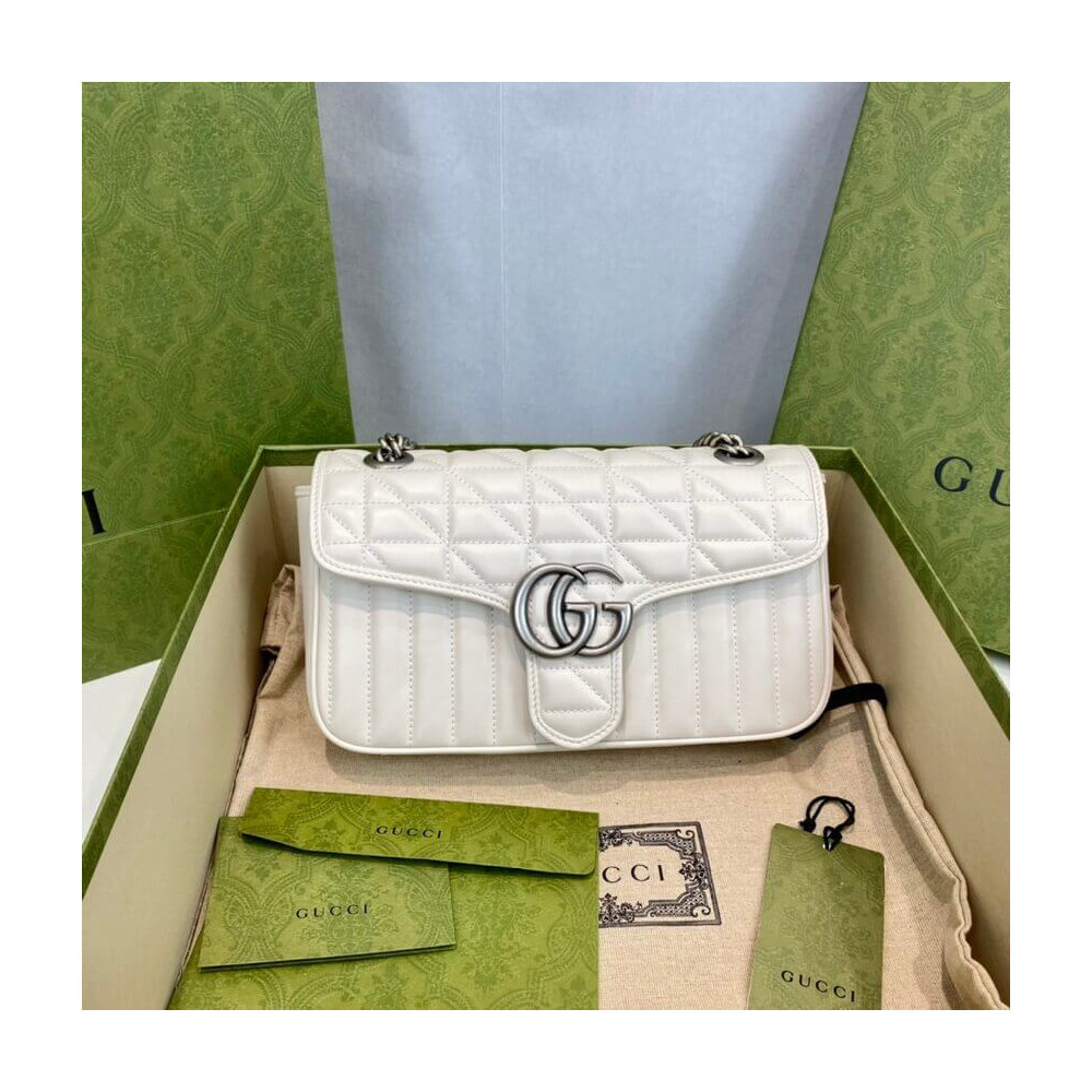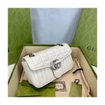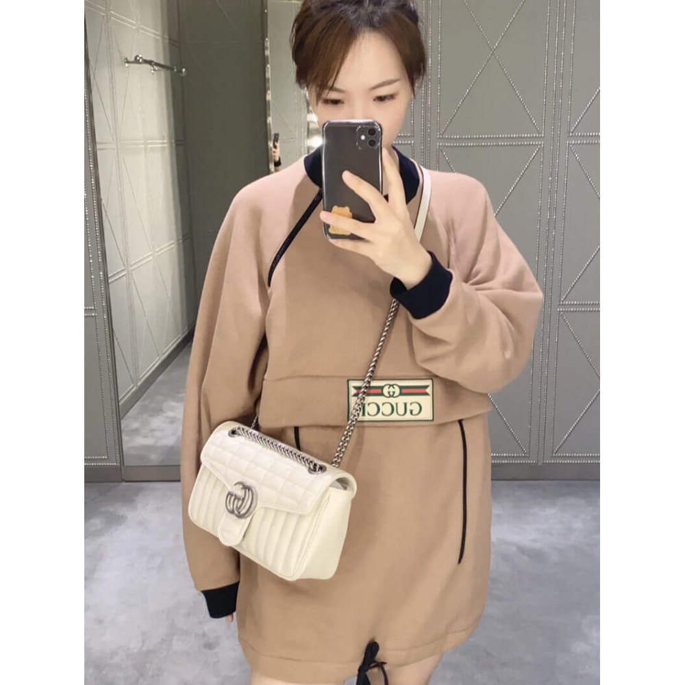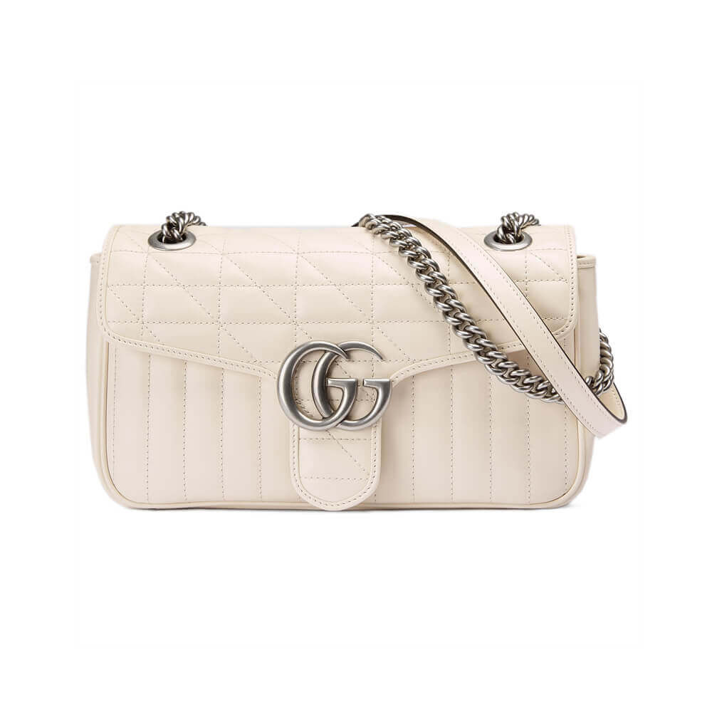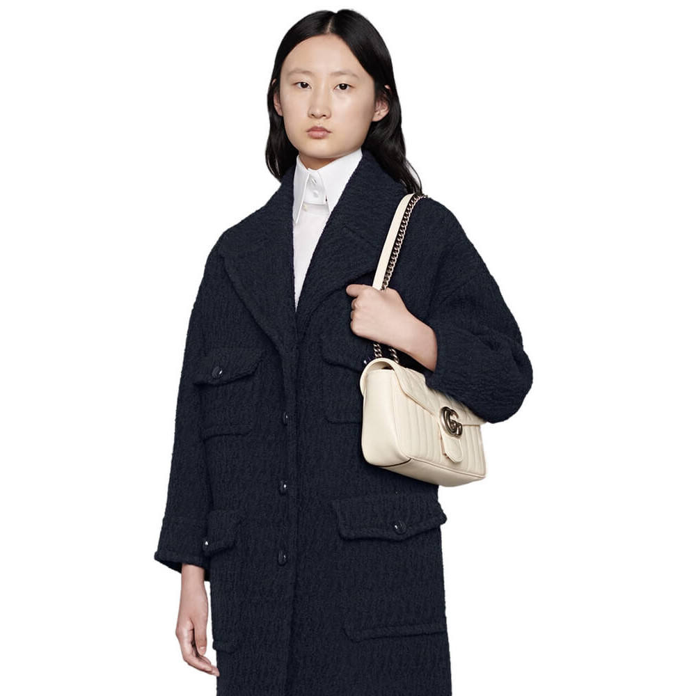 The Gucci Aria collection is an exploration of the House’s most emblematic codes and symbols. A member of the Beloved family, the GG Marmont is synonymous with its matelassé leather and monogram hardware. Here, the small shoulder bag is reimagined with a new geometric take on its signature finish that combines vertical and diagonal motifs.